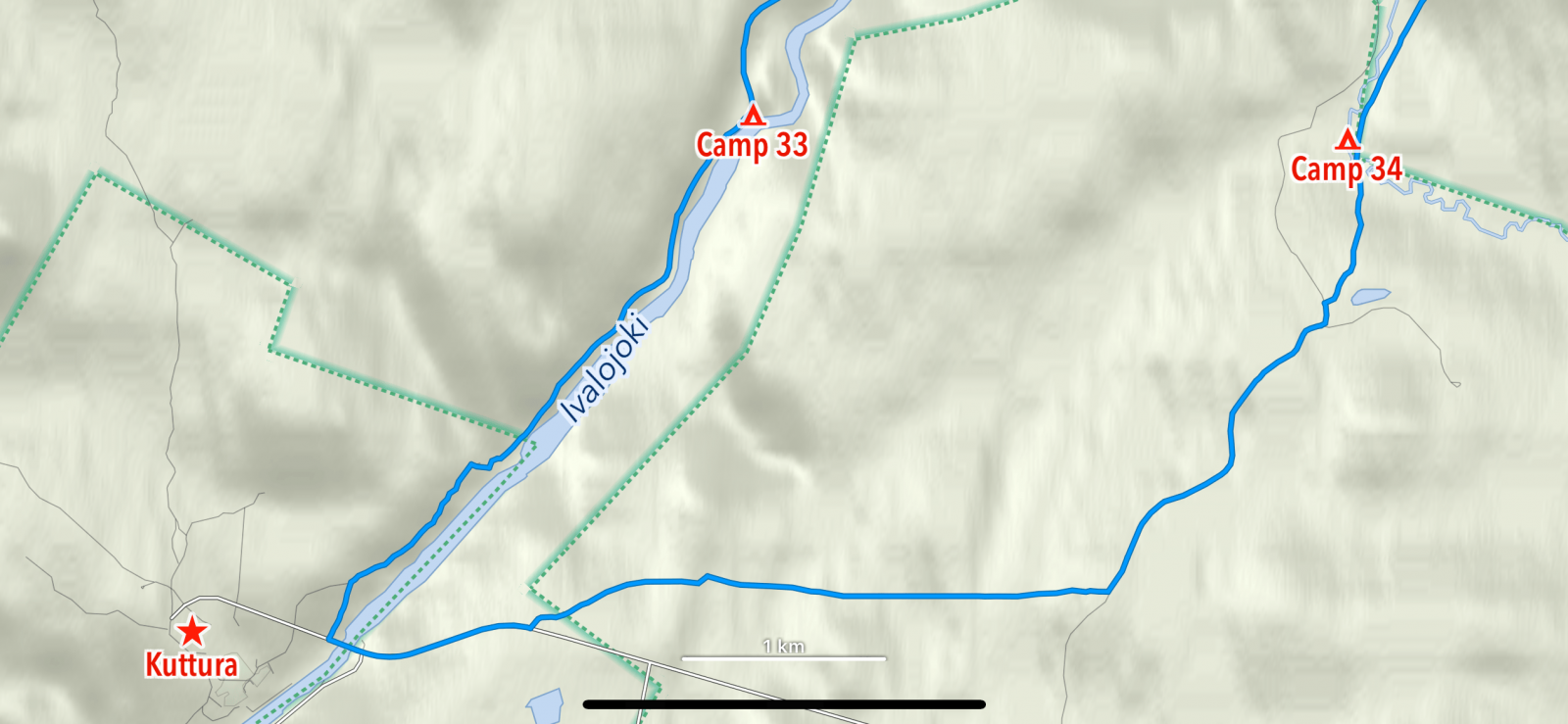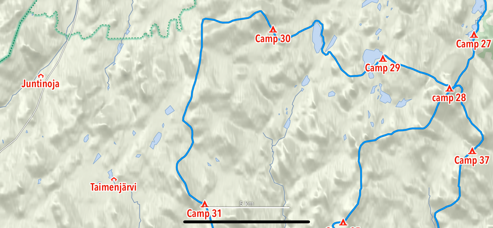 Aber irgendwie, so ganz ohne irgend eine Idee einfach hinfliegen? So kam es das Ich mir dann doch eine Woche vorher mein Handy schnappte, die App MapOut öffnete und mit dem Finger zu zeichnen begann... letztendlich kam eine grobe Idee dabei heraus. Ich wollte vom Norden Finnlands nach Süden wandern. Das sah auf der Karte ziemlich einsam aus, kaum markierte Wege, kaum Siedlungen, wenig Möglichkeiten zum einkaufen von Lebensmitteln. Sehr schön. Auf Google Maps fand Ich einige wenige Supermärkte, mehr brauche Ich normalerweise nicht. So entstand folgende Route: