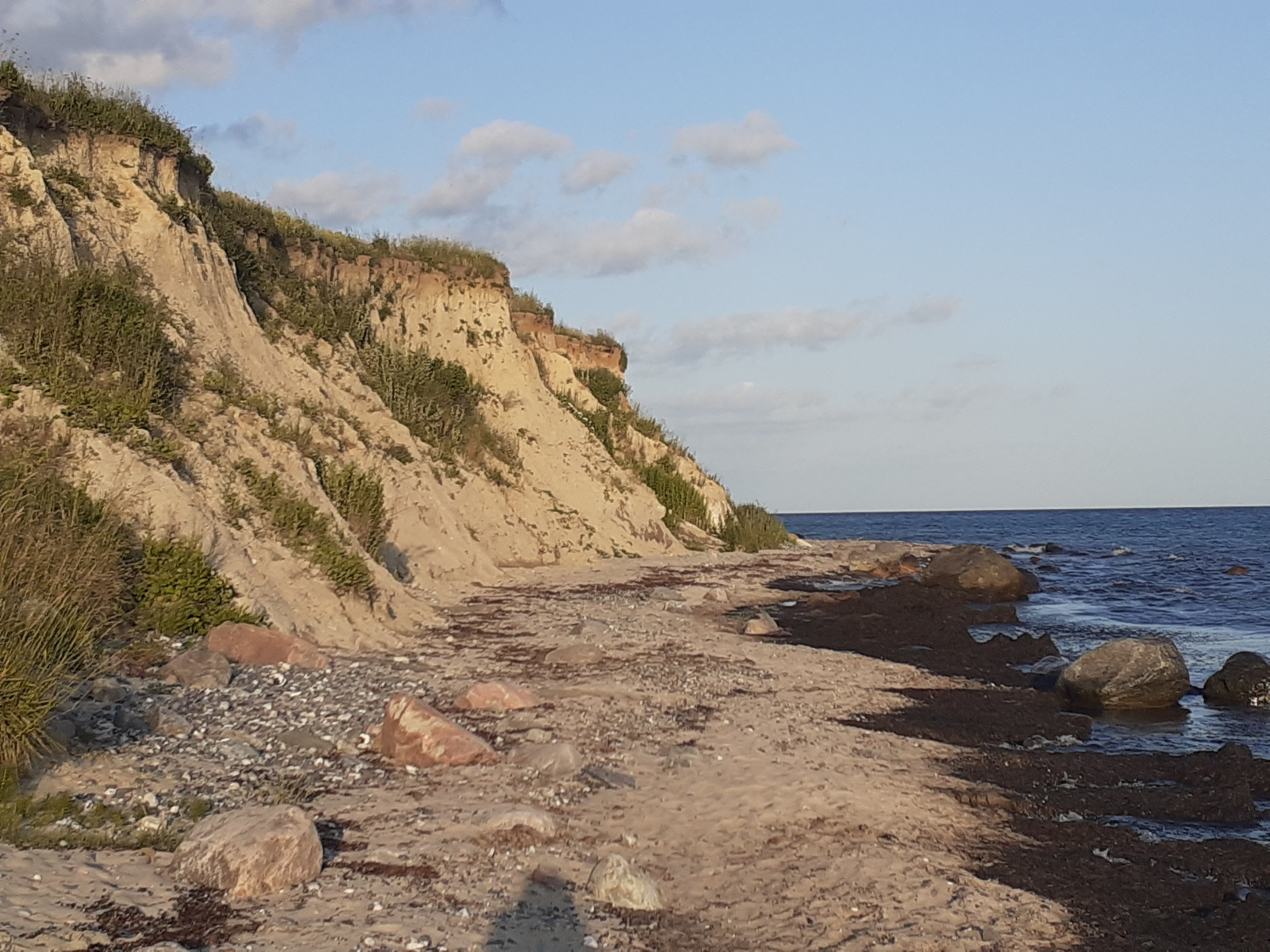 Frühmorgens mache ich mich auf den Weg zu den Klippen an der Ostküste der Insel. Der Weg dorthin sollte kurz sein, nimmt aber zwei Stunden in Anspruch. Vor Ort stellt sich heraus, dass der nördliche Zugang zur Küste gesperrt ist, sodass ich vom Fuß der Klippen nur mit einem Umweg weiterkomme. Der Höhenunterschied ist mit Anstrengung zu bewältigen, die weitere Route führt durch einen Wald bis zum Schlosspark Liselund. Eigentlich ist mein Plan, am Shelterplads in Borre zu nächtigen, doch zufällig entdecke ich dass es einen kostenlosen Rundbus gibt, mit dem ich nach Stege zurückfahre.