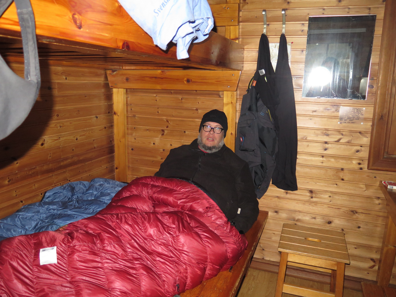 Am Tag, als die Schlafsäcke und das Zelt geliefert werden, liegt Schnee im Garten. Egal, so gewinnt man Vertrauen in die Ausrüstung! Nachts wird es -5* C kalt. Mit Mütze kein Problem, Aber ich muss nachts irgendwann aus der Trainigshose und dem Fleecepullover raus, die neuen Daunenquilts und die ISO-Matten sind einfach spitze! Auch min Fru kommt shr gut mit dem Material zurecht!