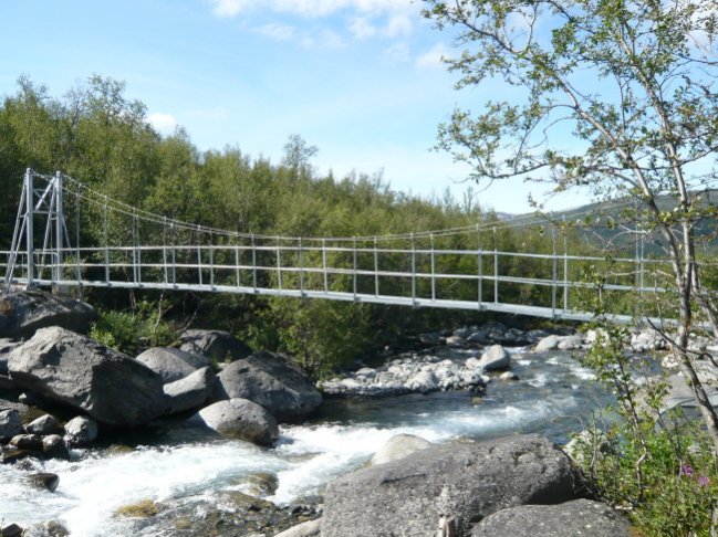 Wir passieren eine Hängebrücke und den Zeltplatz. Außerhalb des Zeltplatzes und dem der Hütte ist das Zelten im Abisko Nationalpark nicht erlaubt (auch wenn sich einige nicht daran halten…).