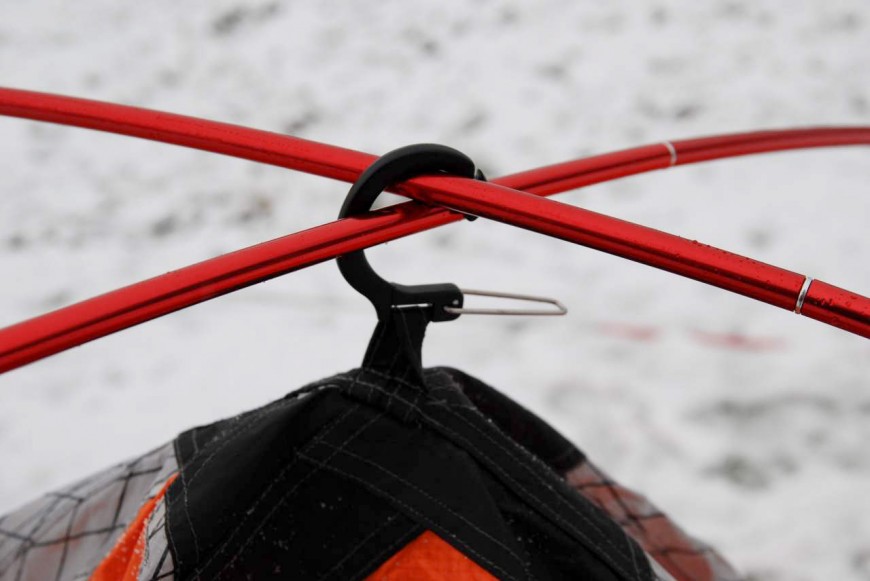 Der Aufbau ist kinderleicht und kann auch bei starkem Wind und/oder mit dicken Handschuhen von einer Person erledigt werden. Das Innenzelt wird ausgelegt und (wenn notwendig) mit Heringen am Boden befestigt. Anschliessend werden die zwei Hauptgestängebögen eingehängt. Bis zu diesem Zeitpunkt liegt das gesamte Material flach am Boden und bietet dem Wind keine Angriffsfläche.