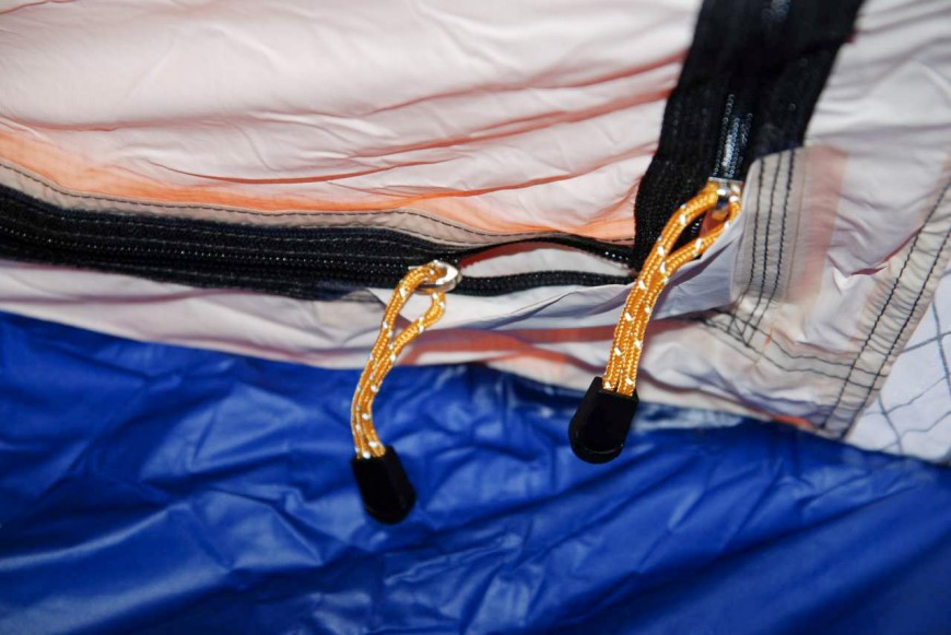Das Zelt kann an 18 Punkten fixiert werden und steht dann wirklich stabil am Boden. Bei schwachem Wind reichen jedoch zwei Heringe beim Eingang aus. Diese beiden Schlaufen sind verstärkt und in der Länge verstellbar. Alle Abspannleinen sowie die Schlaufen am Zelt für die Leinen besitzen reflektierendes Material, so dass das Zelt auch bei Dunkelheit gut sichtbar ist. Die leuchtend orange Farbe tut ihr übriges, damit das Zelt nicht übersehen wird.
