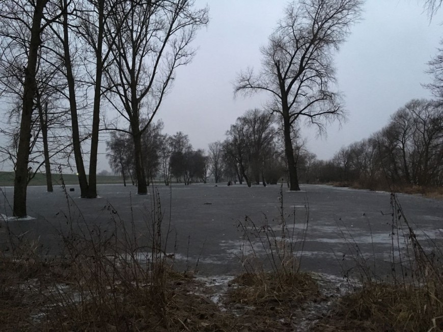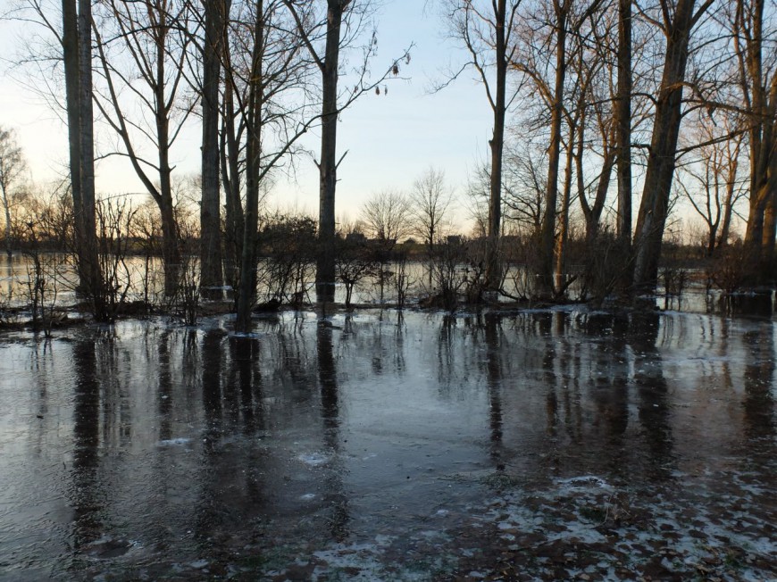 Strahlender Sonnenschein, gefroreren Boden, klare Luft. - 7 Grad. Die überfrorenen Polderflächen glänzen verführerisch.