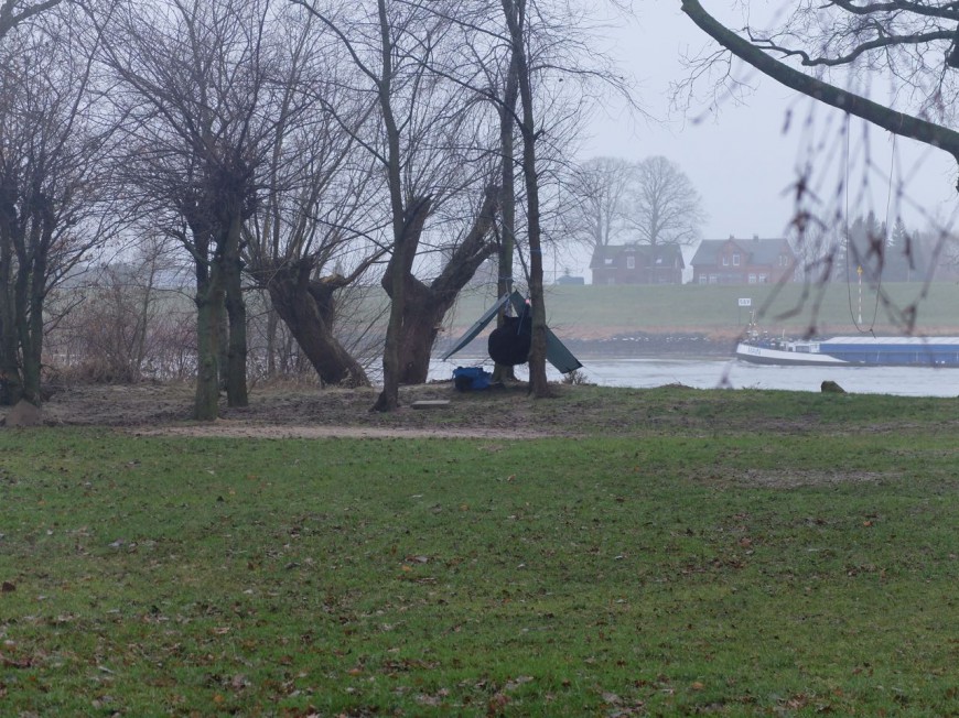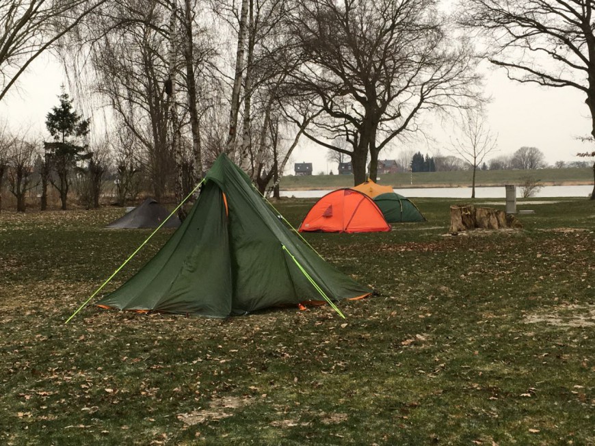 Der Schlafsack ist warm und die Nacht erholsam. Um 7.00 Uhr klingelt Katwarn an: Glatteiswarnung. Eisregen. Tatsächlich ist es warm geworden. Die Wärme spiegelt sich am Silnylon. Wie schön, dass ich keine Heringe setzen musste. Mein uraltes Bergsteigerzelt hängt zwar an einer Stelle halb in der Luft. Aber es steht.
