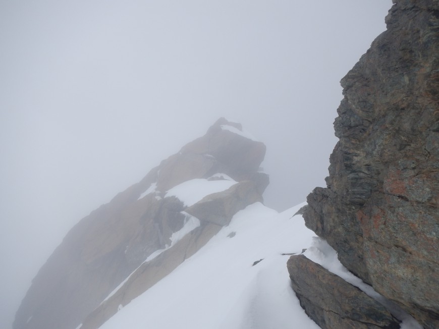 Wenig Sicht und erst mal wenig Ahnung, wohin genau uns die Abseilpiste führt. Wir landen dann aber doch in der Nähe der Scharte und klettern weiter Richtung westlichem Breithorn-Zwilling. Wieder zieht es zu.