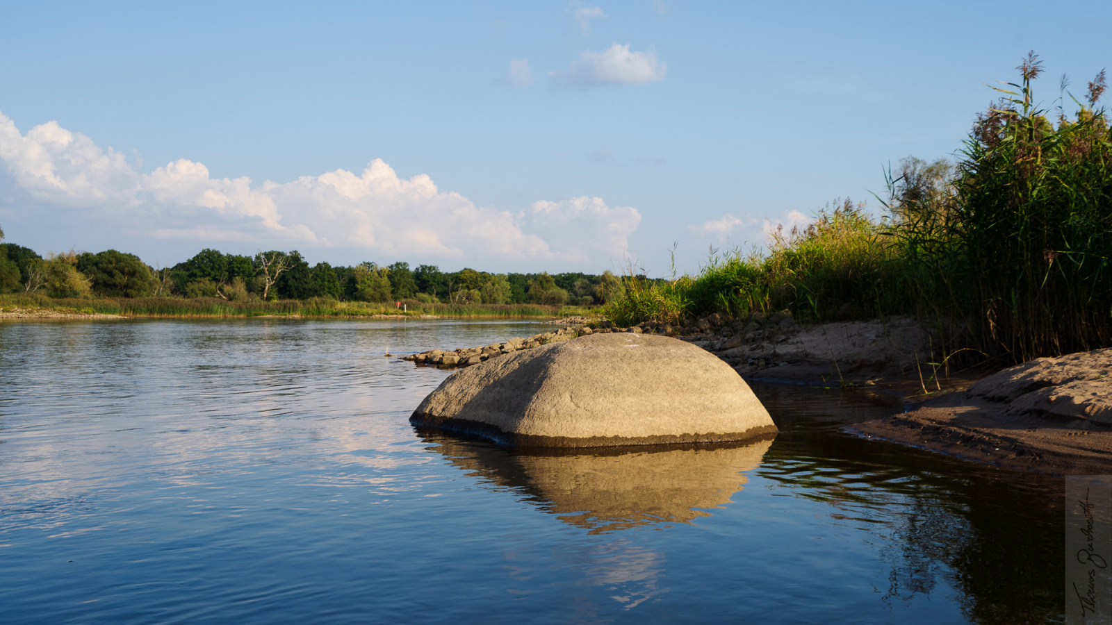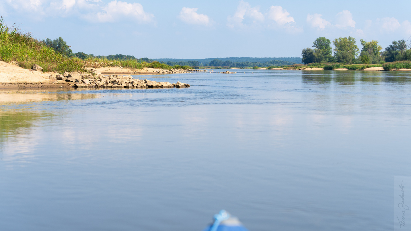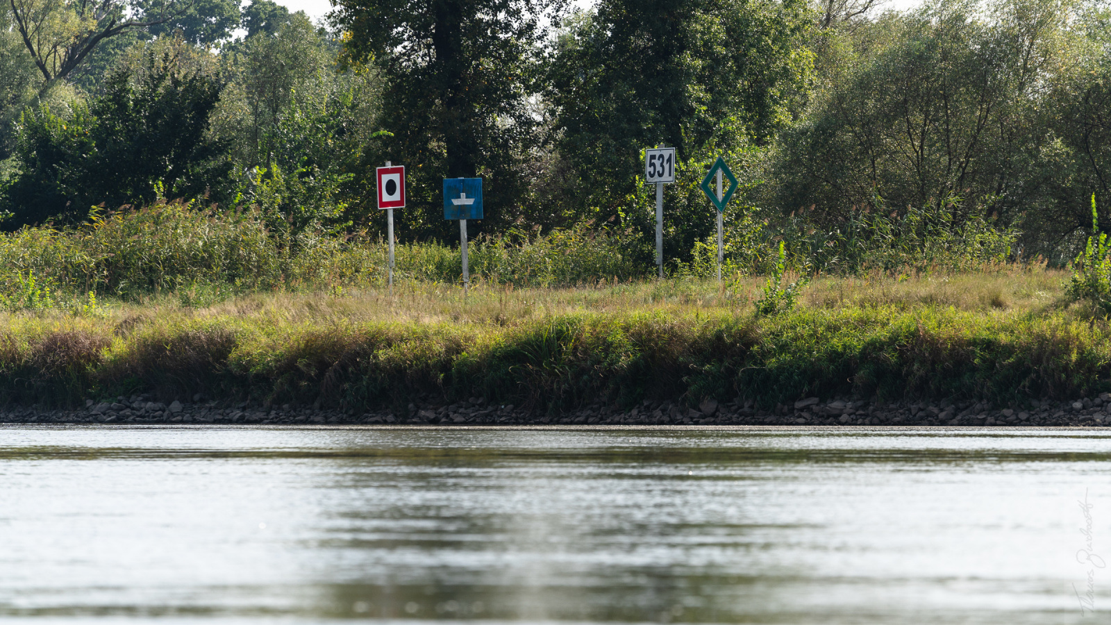 Beim "Buhnenhopping" auf die Steine achten. Durch das Niedrigwasser reichen sie weit vom Ufer ins Wasser. Man sollte Erfahrungen mit den Strömungsverhältnissen an so einer Buhne haben und sein Boot einigermaßen sicher beherrschen können.