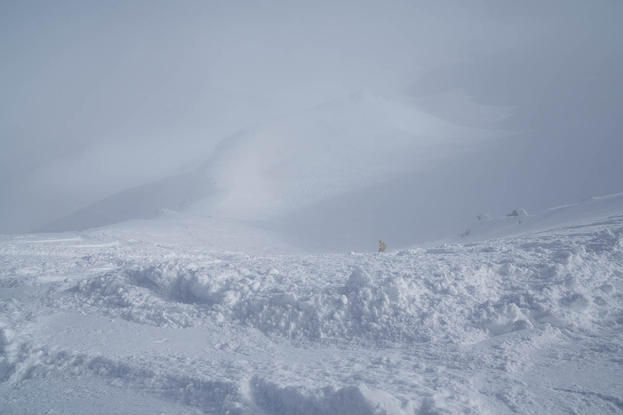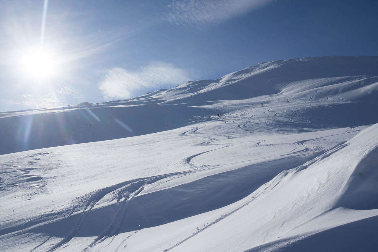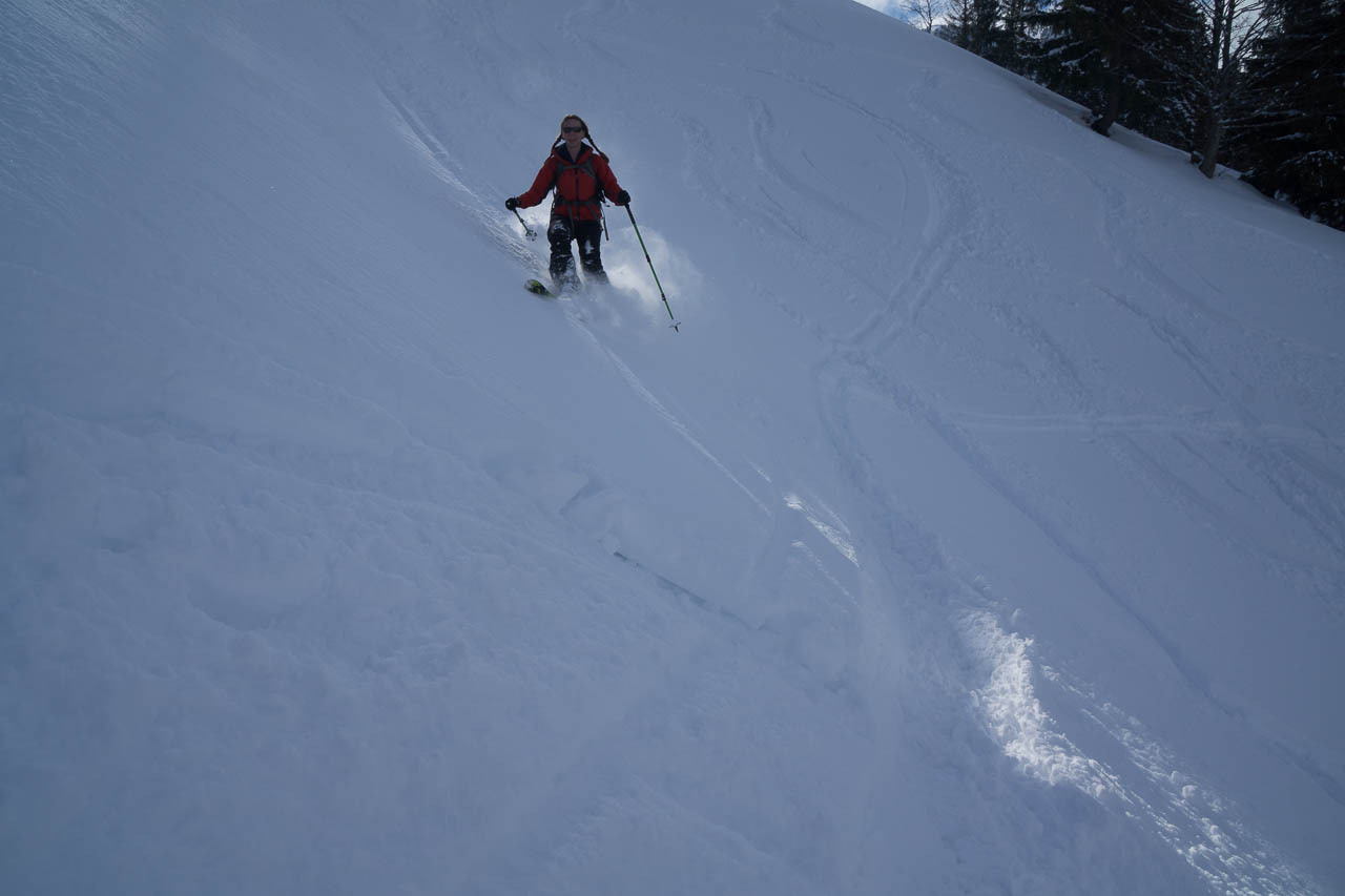 Hab gestern noch eben kurz mal eine Zeit gemessen, damit man sieht, wie schnell/langsam es so bergab geht. Hinten in der Bildmitte ist ein Gipfel erkennbar, das Frunthorn. Auf dem bin in 7 Minuten vor der Bildaufnahme gestartet. Dank gutmütig/leicht fahrbarem Pulverschnee war ich trotz gemütlicher Genussfahrweise (ist in dem Gelände mit den vielen Abbrüchen auch mehr als ratsam) zu dem Zeitpunkt bereits etwa 1.5km und 400 Hm vom Startpunkt aus entfernt.