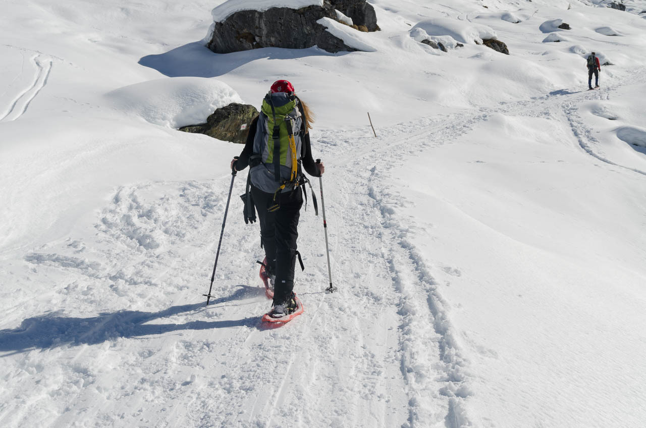 Man legt mit Schneeschuhen eine andere Spur an als mit Ski. Schräghänge sind mit Schneeschuhen (meiner Erfahrung nach) extrem mühsam.