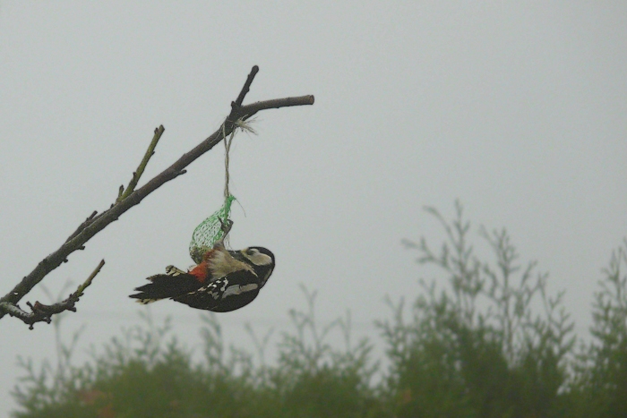 Leider hatte ich die Kamera nicht schnell genug bei der Hand. Der Specht flog zunächst auf den Ast neben dem Meisenknödel, machte einen Spagat in Richtung Knödel und zog dann den zweiten Fuß nach, bevor ich dann diese beiden Bilder machen konnte. Wirklich zufrieden bin ich trotz Bearbeitung (Farbwerte, Skalieren, Schärfen, beim zweiten obendrein Zuschnitt), eigentlich mit keinem von beiden.