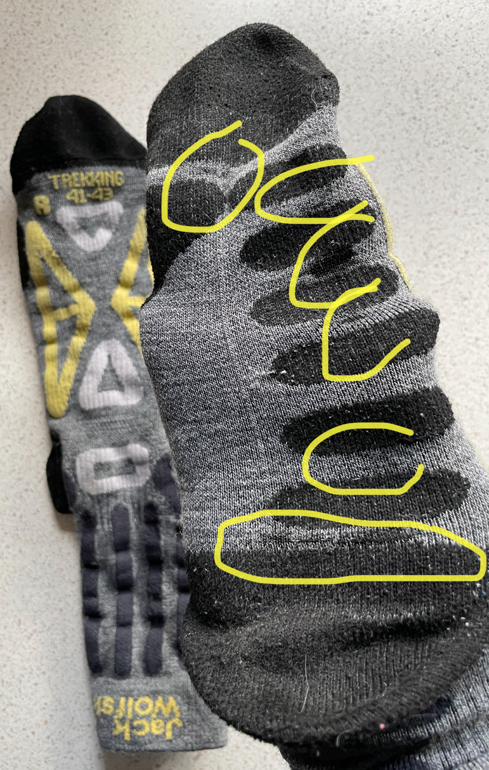 Meine Frau sagt ja immer, ihre Eltern waren mit den Hells in der Oberhonnefelder Zeit befreundet, Manfred und Vivian, die Jack Wolfskin gegründet hatten. Geholfen hat es aber nicht. Socken kaputt