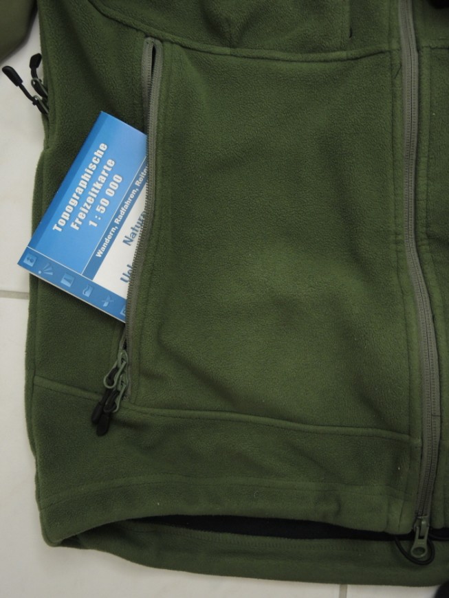 2. Sie hat viele kluge Taschen. Das beste sind die großen Brusttaschen, deren Reißverschlüsse - anders als sonst üblich - mittig sitzen und so den Zugriff "über Kreuz" ermöglichen: Die rechte Hand greift auf die linke Tasche zu und umgekehrt. Es ist also weniger Verrenkung notwendig als bei außen sitzenden Reißverschlüssen. Und man kommt auch bei aufgesetztem Rucksack problemlos an die Taschen, ohne sich den Gurten vorbeiwurschteln zu müssen. Man fragt sich wirklich, warum es alle unsere tollen Outdoorhersteller nicht auch so machen. Die Brusttaschen sind groß genug, um auch klobige Kompaktkameras wie eine G10 oder P7700 komfortabel aufzunehmen. Einziger Nachteil: Die Brusttaschen sind nicht mit Windstopper-Fleece hinterlegt - bleiben die Reißverschlüsse offen, wird es also bei Wind schnell kühl. Der Vorteil: Dort verstaute Batterien und Akkus (oder Händis) bekommen mehr Körperwärme ab.