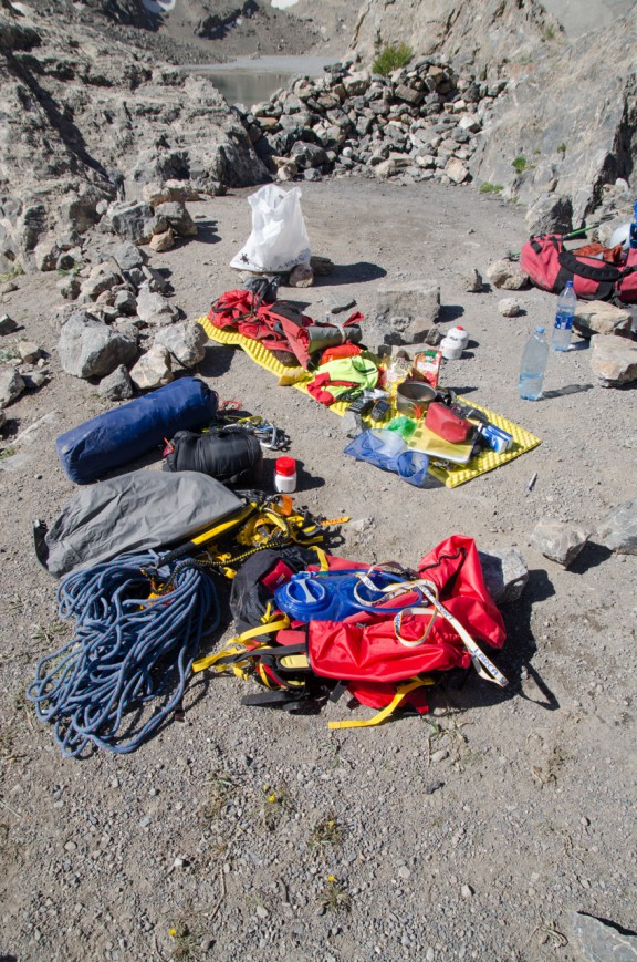 Fertig gepackt. Mit Zelt, Schlafsack, 2 Isomatten, Helm, zwei Eisgeräten, Seil, Eisschrauben, Kocher, Topf, Gaskartuschen, Kleidung, Essen für sechs Tage, alles drin.