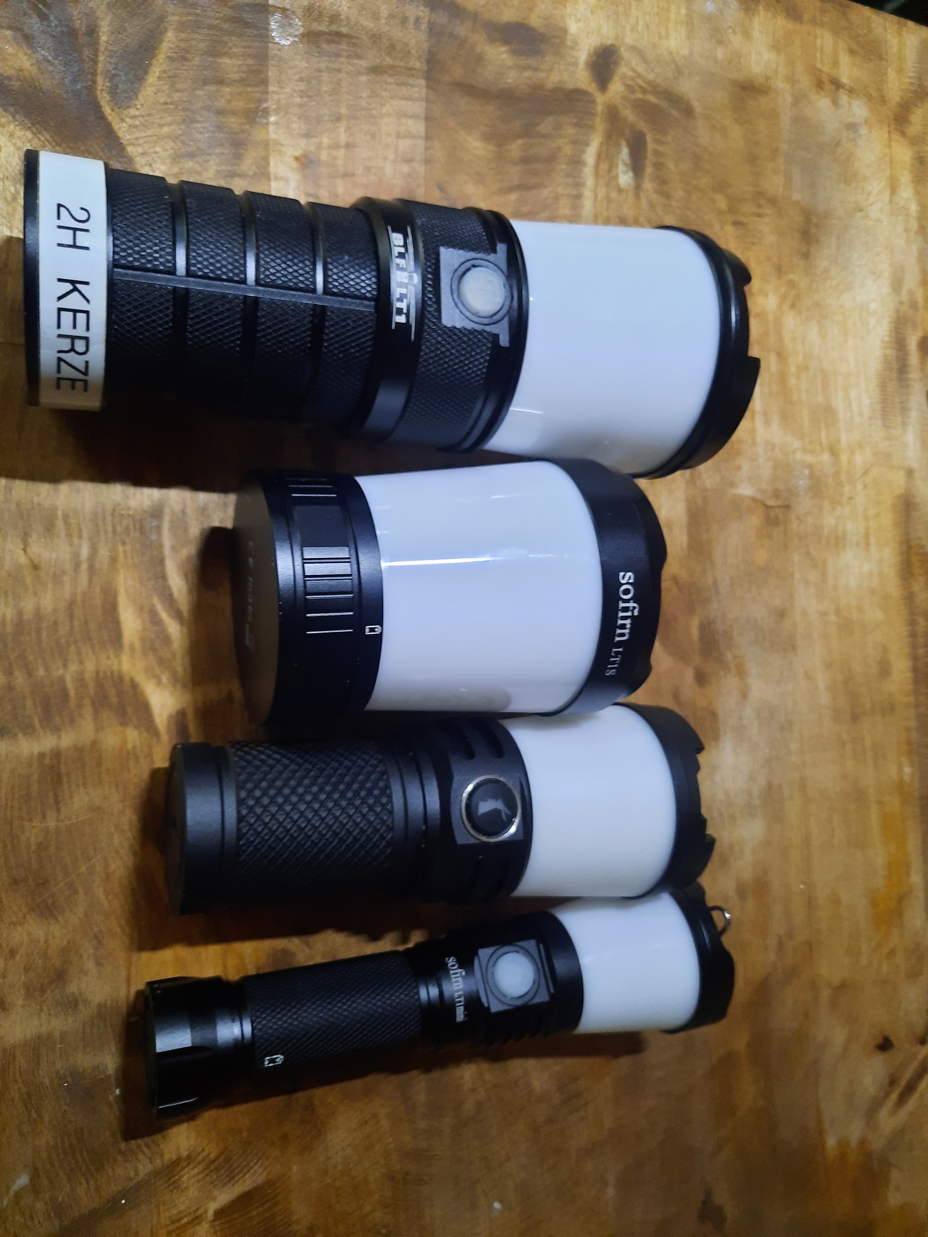 Diesmal nicht von Sofirn. Schalter beleuchtet. Grün noch saft, rot naja was wohl. Akkus sind hier 4 14500 (AA). 4*Luminus SST20 LED. 5 Level. 650 max Lumen, 24Tage im Moon mode.314gr