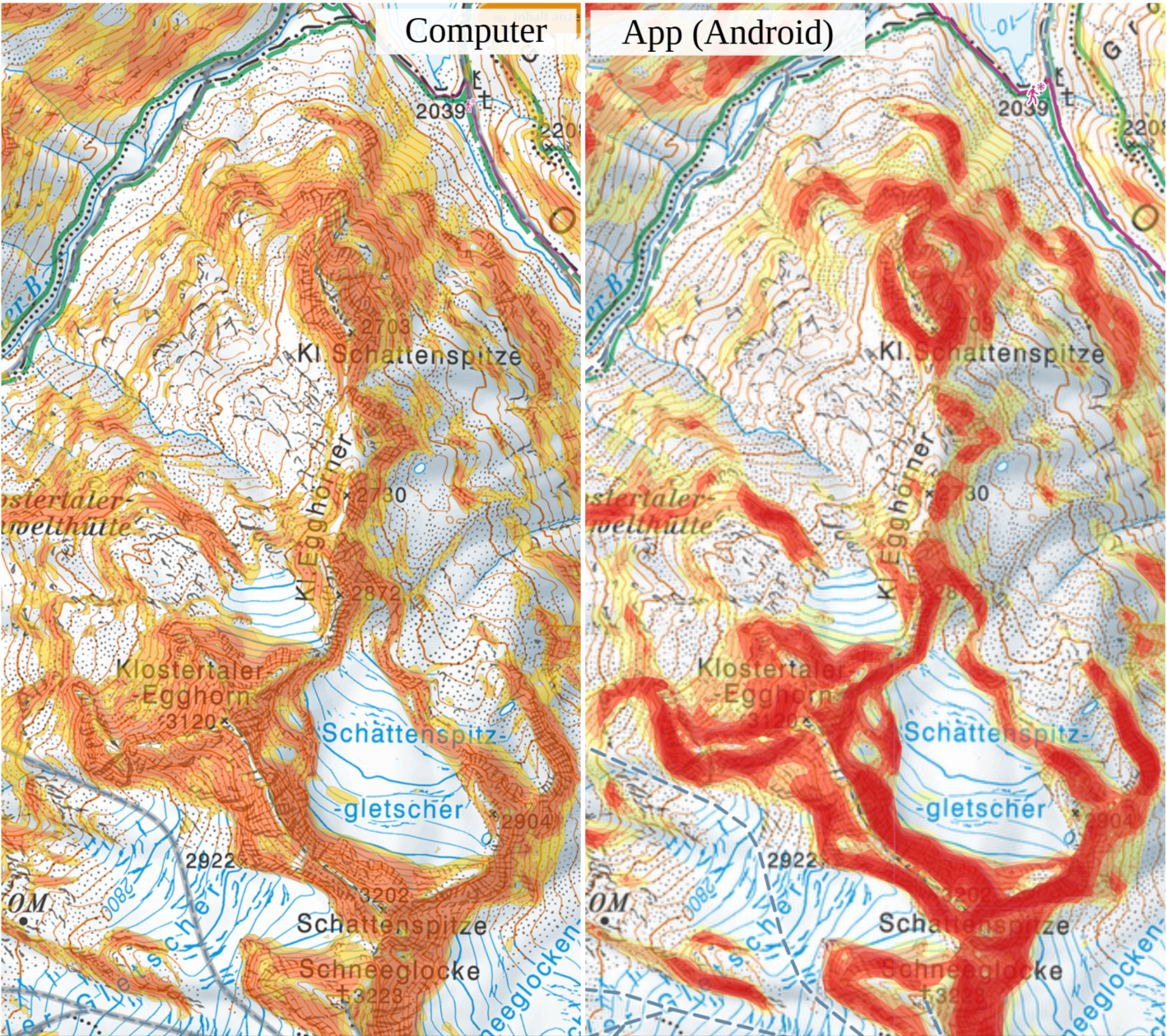 Die Hangneigung wird in der App so permanenten in Rot angezeigt, dass in diesem Bereich von der Karte nichts mehr zu erkennen ist. Am Computer auf www.alpenvereinaktiv.de wird es schön transparent dargestellt. Im Bild unten ist der Vergleich der beiden Karten.