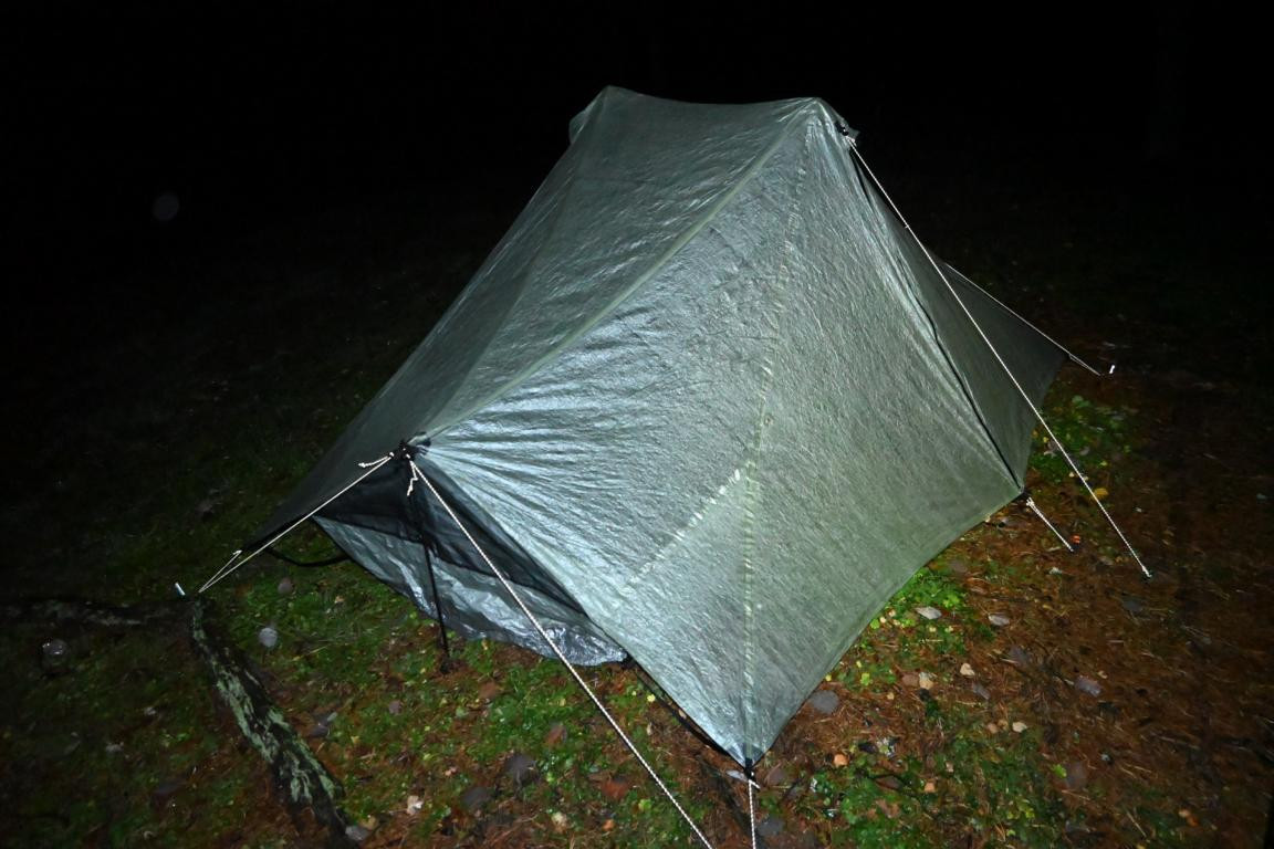 ein paar tage vorher hatte ich die stöcke unter tags zum wandern benutzt und das zelt mit 5 oder 6 dachplatten beschwert. prompt war ein kleines loch in einer der apsiden, so ein schlitz, 2mm lang. also das dcf kann man problemlos kaputt schauen, da muss nix gosses passieren. dafür ists aber auch leicht zu flicken.