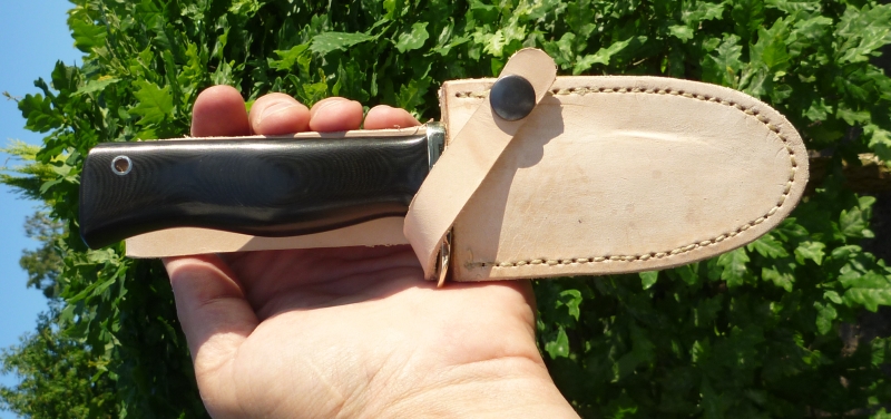 Im ersten Bild schön zu sehen die original Scheide. Da ist die Gürtelschlaufe auf höhe der Klinge, was eine derart hohe Tragweise bringt, wie ich sie nicht mag. Also basteln.