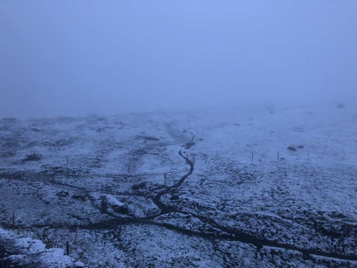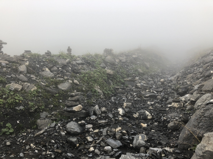 Auf knapp 2000 m.ü.M. stecke ich dann mitten in einer Wolke. Hier wäre ein Abstecher zum Bällenhöchst möglich. Den erspare ich mir angesichts der fehlenden Aussicht allerdings. Es geht also weiter und zunächst wieder ein wenig bergab. Wieder unterhalb der der Wolke angekommen, kann man immerhin den Weg gut erkennen. Der Weg wird anspruchsvoller und ich hole alsbald meine Trekkingstöcke raus.