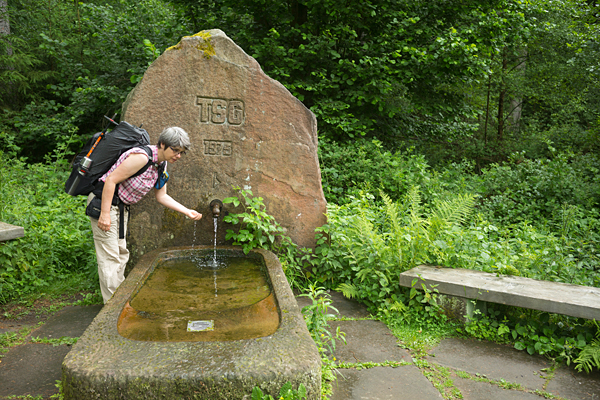 Wir verlassen den Brunnen und folgen dem kulinarisch vielversprechenden Weg. Ich freue mich, Heidelbeeren zu finden und Falk hat die ersten Pilze in der Stofftasche. Am TSG-Brunnen füllen wir unsere Wasserflaschen auf.