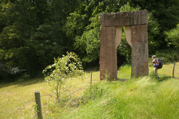 Mit dem Gebäck in der Hand verlassen wir durch den Hinterausgang den Bahnhof. Über wilde Pfade und Wege hinauf und hinab durchqueren wir das südlich gelegene Kaiserslautern, bis wir unser Wegzeichen finden. Es ist der rote Balken, des Weitwanderwegs von „Donnersberg/Pfalz nach Donon/Elsass“, dem wir heute folgen.