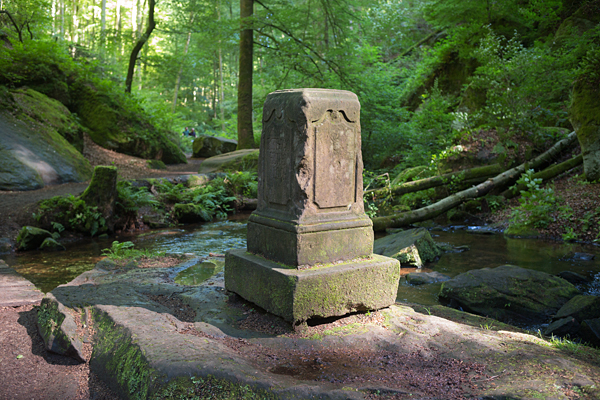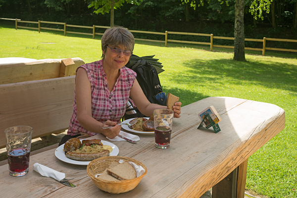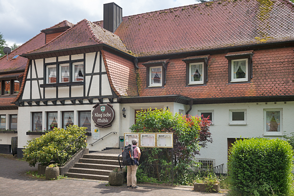 Die nächste Rast erfolgt am Stollenbrunnen kurz vor Trippstadt. Hier füllen wir nochmals die Flaschen und entscheiden uns durch die Karlstalschlucht zu laufen. Es ist schon Nachmittag als wir den Ausgangspunkt erreichen. Es fängt an zu nieseln und auch der Zeitpunkt ist passend für einen deftigen Wanderteller im Gasthaus Klug’sche Mühle. Ohne zu zögern kehren wir ein.