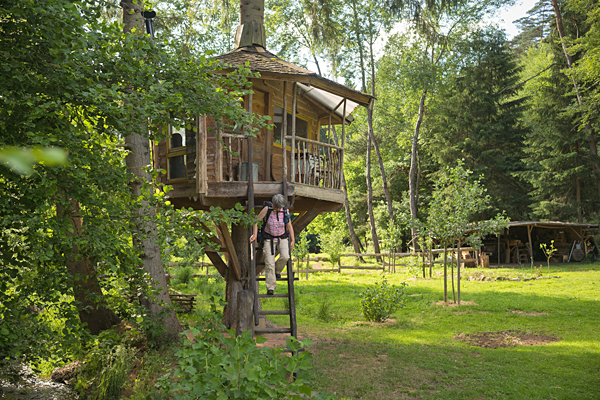 Zuerst schaue ich in das kleine Holzhäuschen. Alles ist vorhanden: Ein Bett, Herd, solarbetriebene Lampe, Dusche. Bücher stehen in einem Regal. Es wirkt sauber und aufgeräumt. Ebenso das Baumhaus. Auch hier erkenne ich Herd, Bett, Tisch und Ofen. Gegenüber ein Bücherregal. Die ganze Anlage lädt zum Bleiben ein, aber Falk protestiert.
