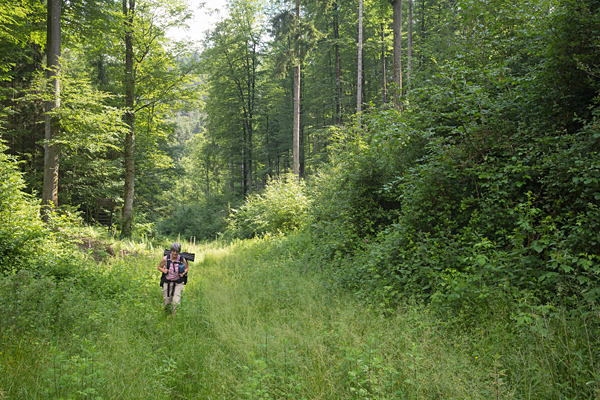 Die Erwartungen an den Tag sind gestiegen, die Stimmung schon am Morgen auf dem Höhepunkt. Wir laufen das Meisertal bis zum Ende und suchen nach einer Quelle. Doch es findet sich nur ein kleines Rinnsal, das wenig zur Wasserentnahme taugt. Also geht es weiter durch Wald und Wiesen in Richtung Leimen. Hier hoffen wir, unseren Wasservorrat aufzufüllen.