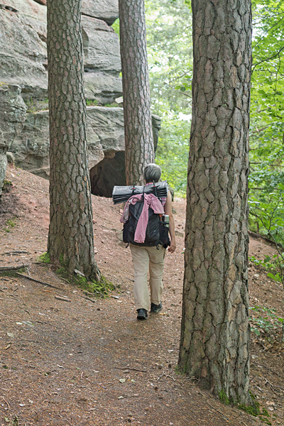 Nach Leimen verlassen wir unbeabsichtigt den markierten Weg und merken es erst, als wir weit oberhalb sind. Außerdem ist es ein wilder Felsenpfad weit über der Straße und unter den Kletterfelsen. Vereinzelt treffen wir Kletterer, aber vor allem finden wir hier viele Pfifferlinge. Das Pilzsäckchen ist schon gut gefüllt als wir uns entschließen, den wilden Felsenpfad zu verlassen, um wieder auf unseren geplanten Wanderweg zu stoßen.