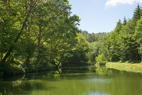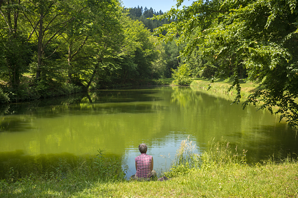 Als wir an einem kleinen Weiher vorbeilaufen, gönnen wir uns wieder eine Rast. Ich ziehe sogleich die Schuhe aus und hänge meine Füße in das kühle Wasser. Auf unseren Wanderungen ist das „Füßebaden“ für mich ein Hochgenuss. Entspannt sitze ich am Ufer, lasse die Füße im Wasser baumeln und meinen Blick über den Weiher gleiten, bis mir etwas Seltsames auffällt. Es gibt keine Fische, ich sehe überhaupt keine Tiere. Die einzige Bewegung ist ein regelmäßig wiederkehrendes Blubbern durch kleine aufsteigende Luftbläschen: seltsam.