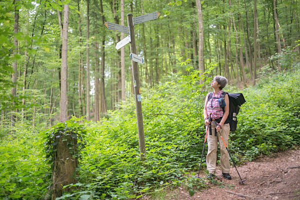 Am nächsten Morgen gehen wir früh los. Es ist unser letzter Tag und wir wollen zeitig am Bahnhof sein. Davor steht noch der Rotalbener Felsenweg auf dem Plan. Ein wilder Saumpfad, der sich um verschieden Felsformationen schlängelt. Die Tafeln und Schilder weisen deutlich darauf hin, dass es ein touristisches Highlight ist. Auch die vielen Sitzgelegenheiten lassen auf eine hohe Besucherfrequenz schließen.
