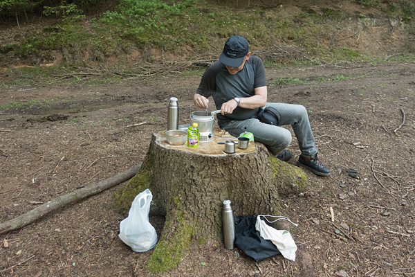 Danach beginnt das Abendritual. Diesmal sind wir gut vorbereitet. Das letzte Mal hatte der alte Benzinkocher unsere Geduld extrem strapaziert. Danach kaufte Falk eine neue Kochausrüstung. Denn unsere Ansprüche sind gestiegen, seit wir bei jeder Wanderung immer mehr Pilze finden. Ihre Verarbeitung erfordert einen Kocher, dessen Flamme sich gut regulieren und die Kochdauer beliebig ausweiten lässt. Nur so lassen sich die Pilze angemessen zubereiten. Außerdem haben wir jetzt Öl, Zwiebeln und Kräuter dabei, um die Pilzgerichte zu verfeinern. Ein guter Rotwein darf dabei nicht fehlen.