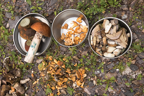 Falk baut das Zelt auf und putzt die Pilze. Ich bin erschöpft und ruhe mich erst einmal aus. Auf der Matte liegend, beobachte ich Falk beim Säubern der Pilze. Es dauert endlos. Am Ende sind beide Töpfe randvoll. Ich frage mich, ob unsere neue Kochausrüstung nicht schon wieder zu klein ist. Dann denke ich: Vielleicht sollten wir an manchen Pilzen einfach vorbei laufen. Zaghafte Versuche meinerseits waren bisher wenig erfolgreich: Falk kann definitiv an keinem Pilz vorbeilaufen.