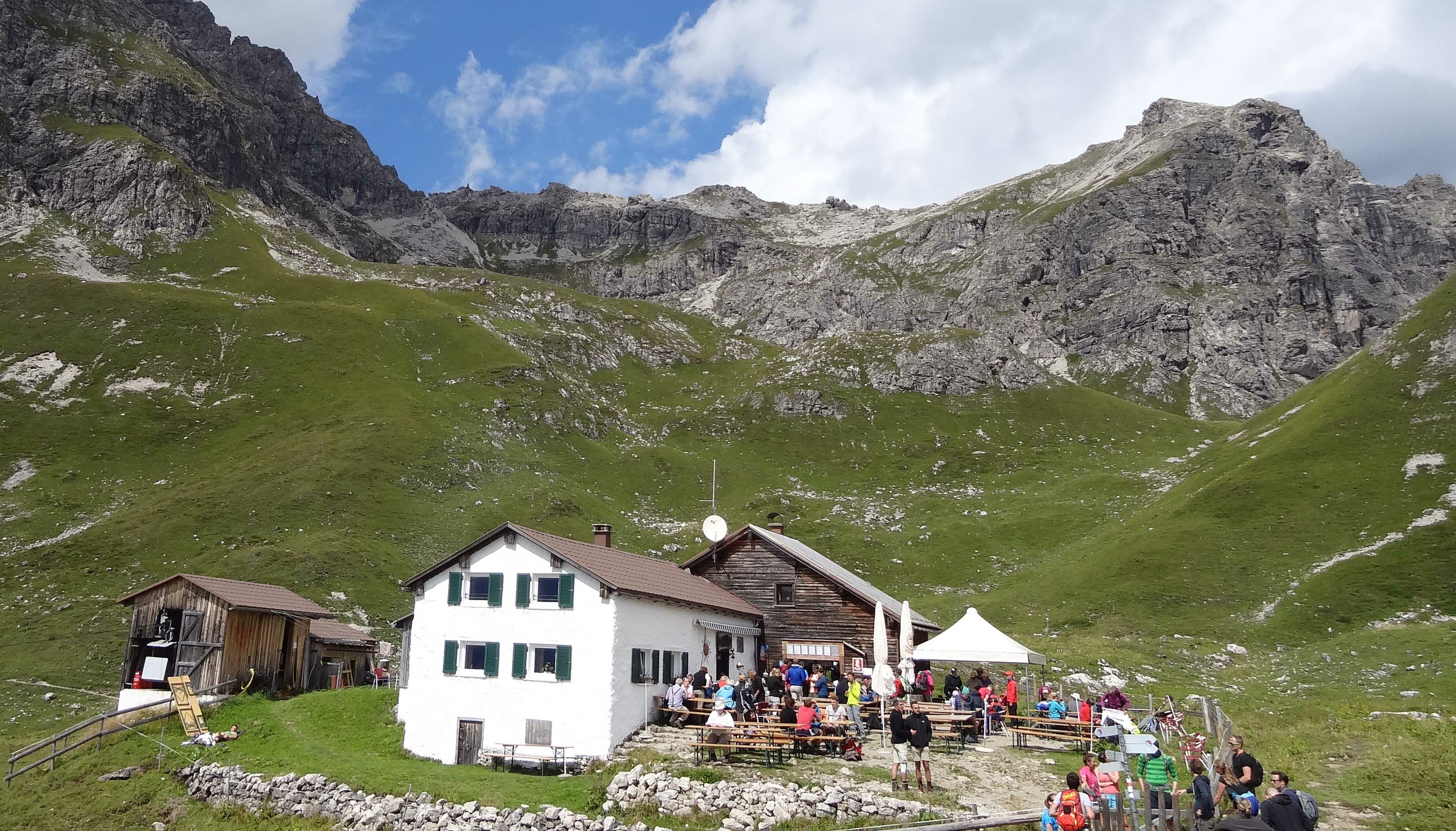 Zur Stuttgarter Hütte: Wir starten sofort mit einem Linienbus, und sind zack, sofort in Österreich. Etwas verdutzt stellen wir fest, dass wir in Deutschland überhaupt keinen Meter wandern. In Bödmen laufen wir ein Tal hinauf, das später recht steile Anstiege bietet. Wir machen Rast in der Widdersteinhütte, wo es zwar Suppe gibt, der Wasserhahn jedoch so eingestellt ist, dass faktisch keine Wasserflasche aufgefüllt werden kann. Gegen Entgelt kann man die Flasche an der Theke mit Wasser füllen lassen. Diese Politik sorgt für Murren bei einigen Wanderern.