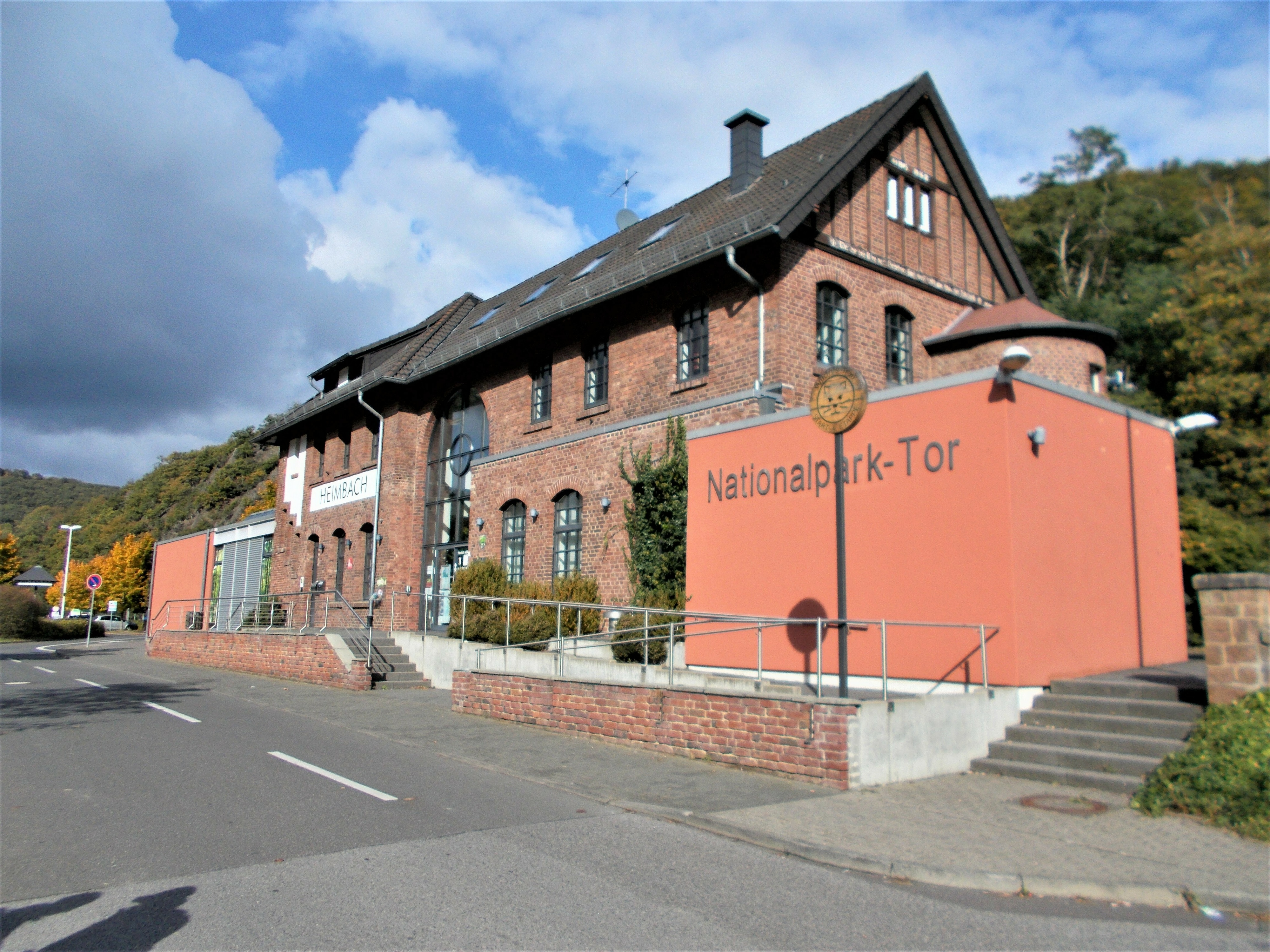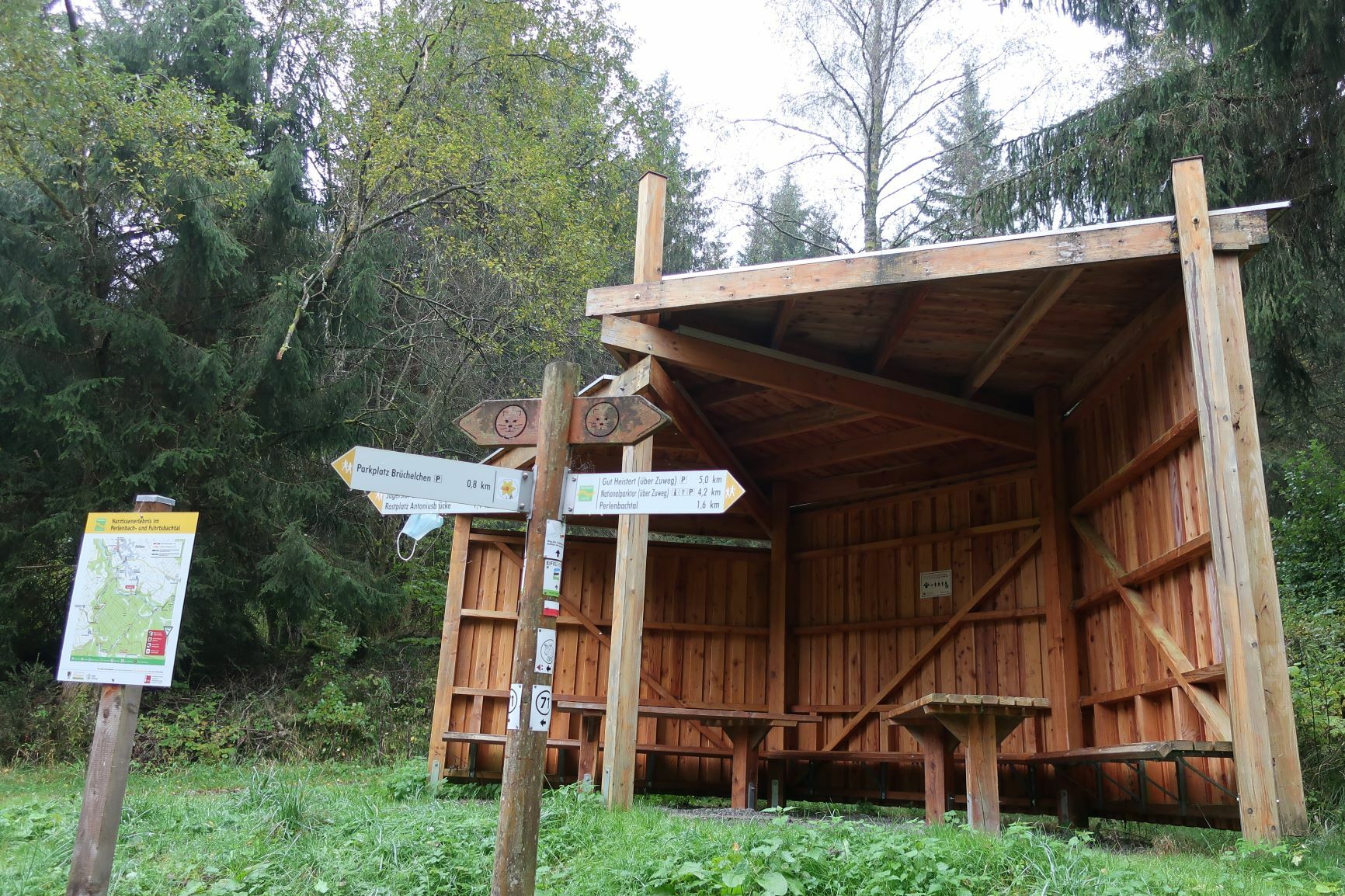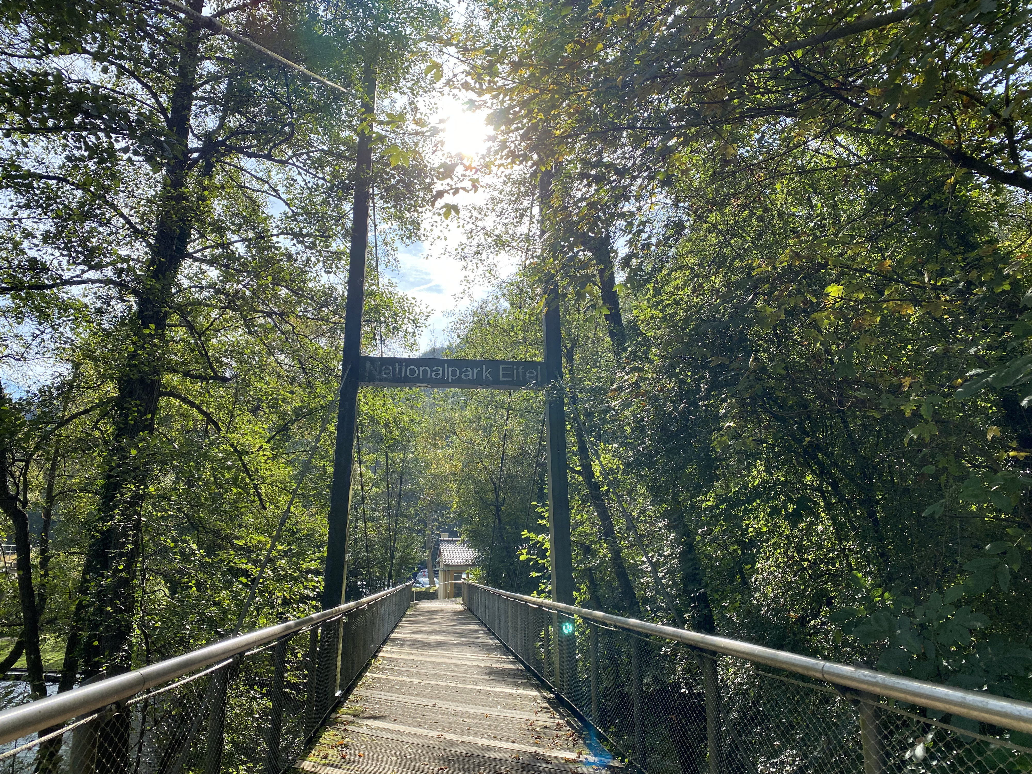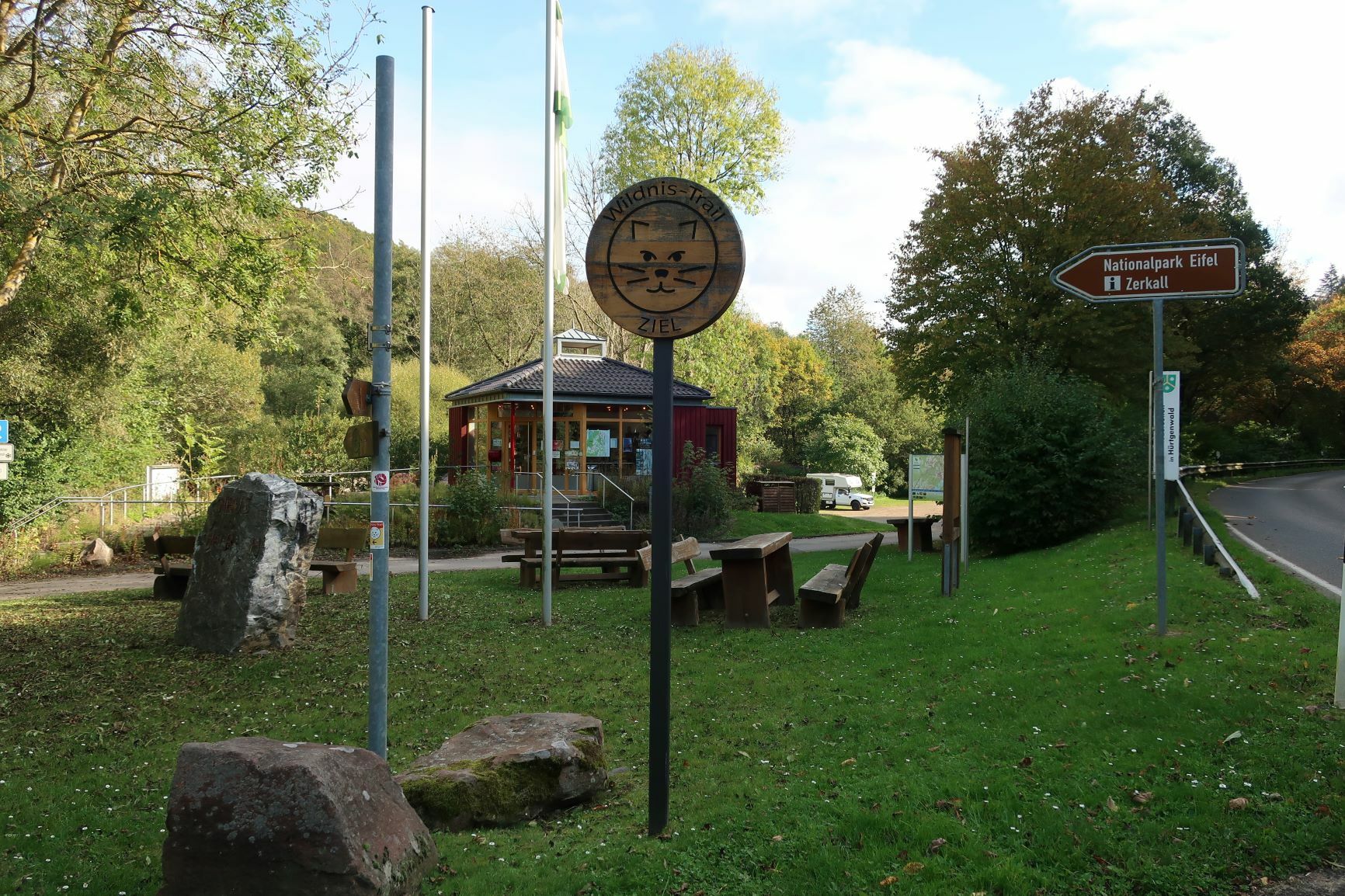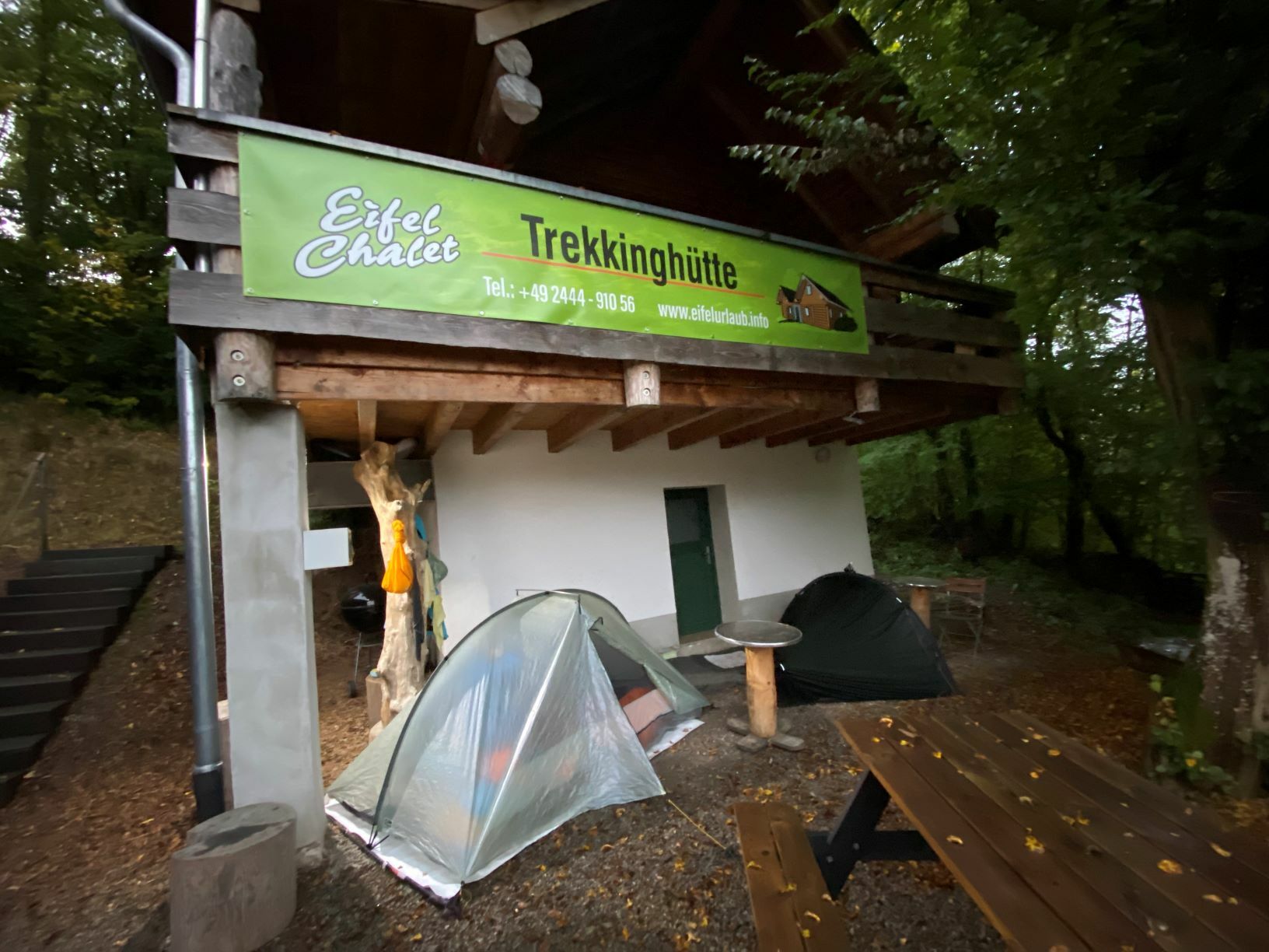 In Heimbach haben wir noch eine kleine Wartezeit zu überbrücken, bis uns das von uns gebuchte Trail-Shuttle von Heimbach nach Einruhr bringt. Die Zeit nutzen wir, um der Dönerbude am Kreisverkehr gegenüber einen Besuch abzustatten. Wir ergattern draußen einen Tisch und jede von uns schiebt bei ca. 12 Grad ein für heute letztes warmes Essen in sich hinein. Glücklich stellen wir fest, dass unsere auserwählten Pom-Döner und Döner sehr lecker sind. Wir lassen uns viel Zeit, genießen das Essen sehr und schnecken irgendwann wieder zurück zum Bahnhof, an welchem sich das Nationalparktor von Heimbach befindet. Dieses stellt den Abfahrtspunkt des Trail-Shuttles dar. Wir setzen uns an die Treppe des Info-Hauses, aber leider ausversehen auf die falsche Seite. Als das Trail-Shuttle vorfährt, sehen wir es gar nicht, aber die Fahrerin hat uns dann mithilfe einer Mitarbeiterin des Nationalparktores doch noch gefunden. Das Trail-Shuttle ist nicht als solches zu erkennen (normaler schwarzer Kombi ohne Aufdruck), aber etwas peinlich ist es uns trotzdem, ausversehen auf der falschen Seite gewartet zu haben. Aber nun gut – wir haben uns ja nun gefunden. Die Fahrerin ist sehr nett, hat aber leider derzeit mit einer privaten schlimmen Situation zu kämpfen. Die Stimmung im Taxi ist deshalb bedrückt und ein plötzlich entgegenkommendes Motorrad in einer unübersichtlichen Kurve sorgt dafür, dass wir alle fast einen Herzinfarkt bekommen vor Schreck. Nach einigem Suchen nach dem richtigen Campingplatz werden wir schließlich mithilfe des GPS auf C.‘s Smartphone am Richtigen abgesetzt.
