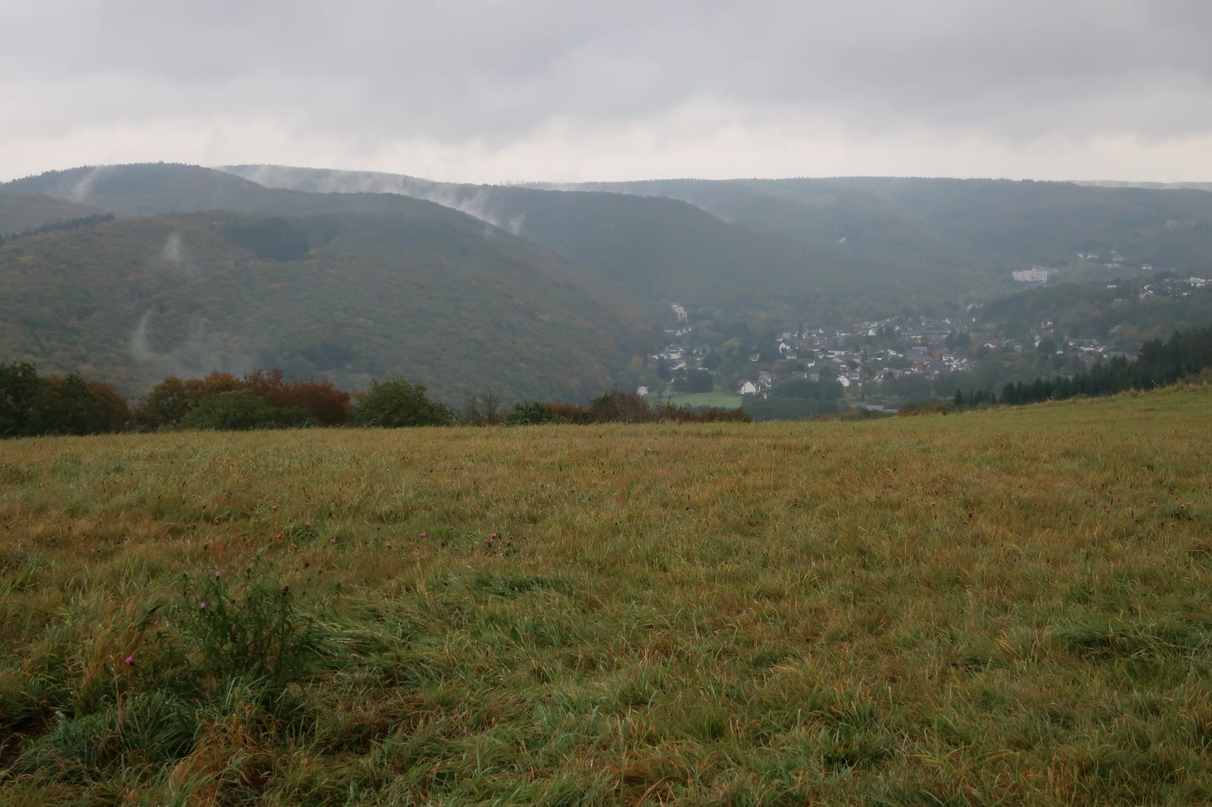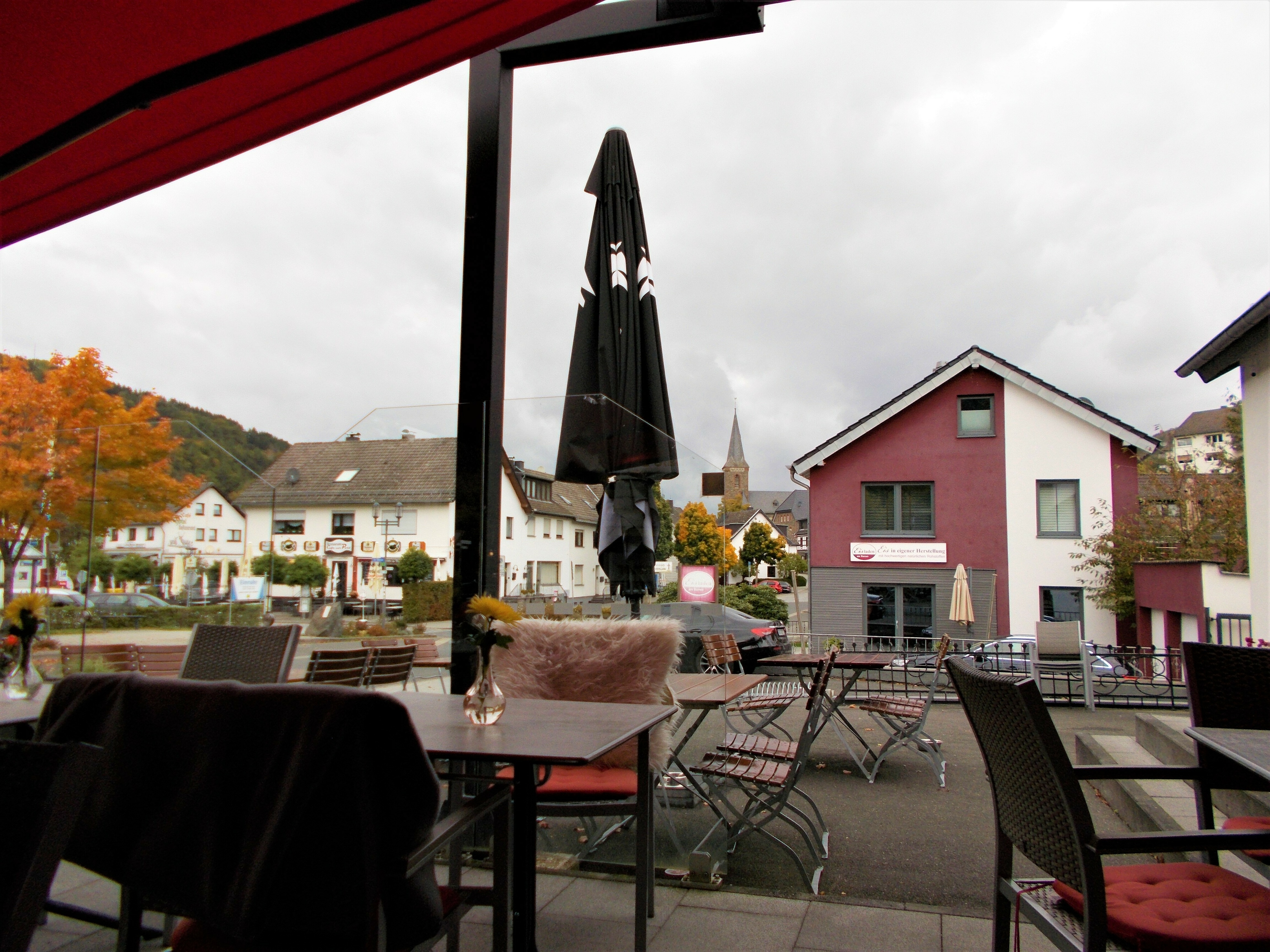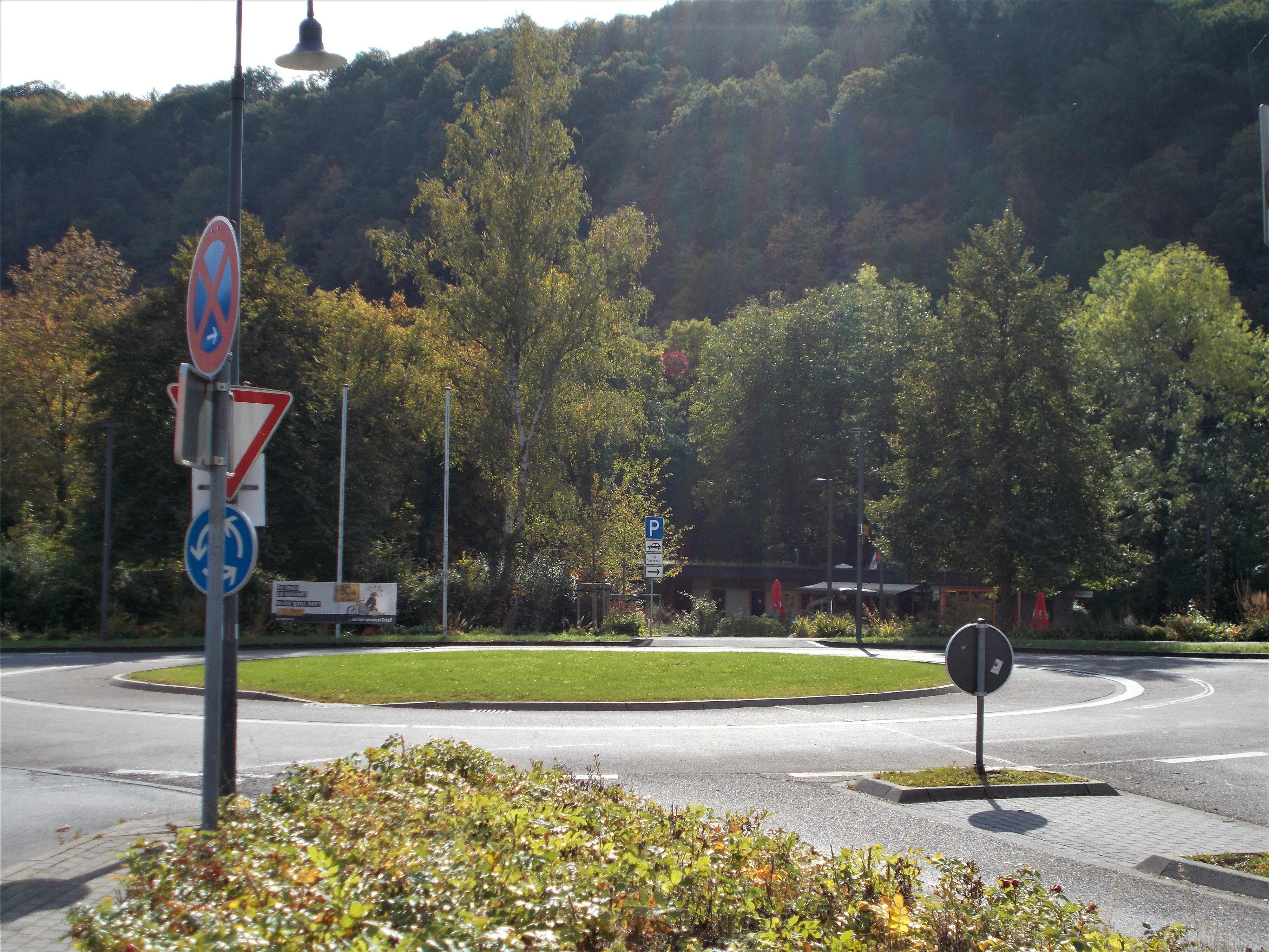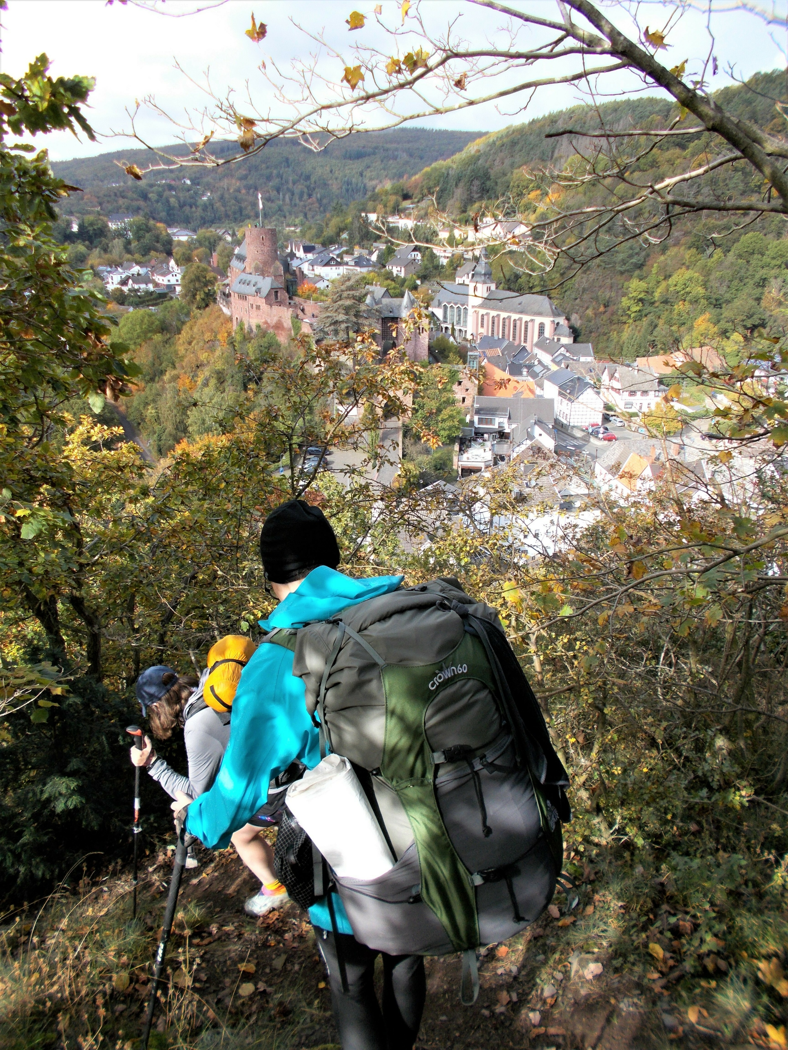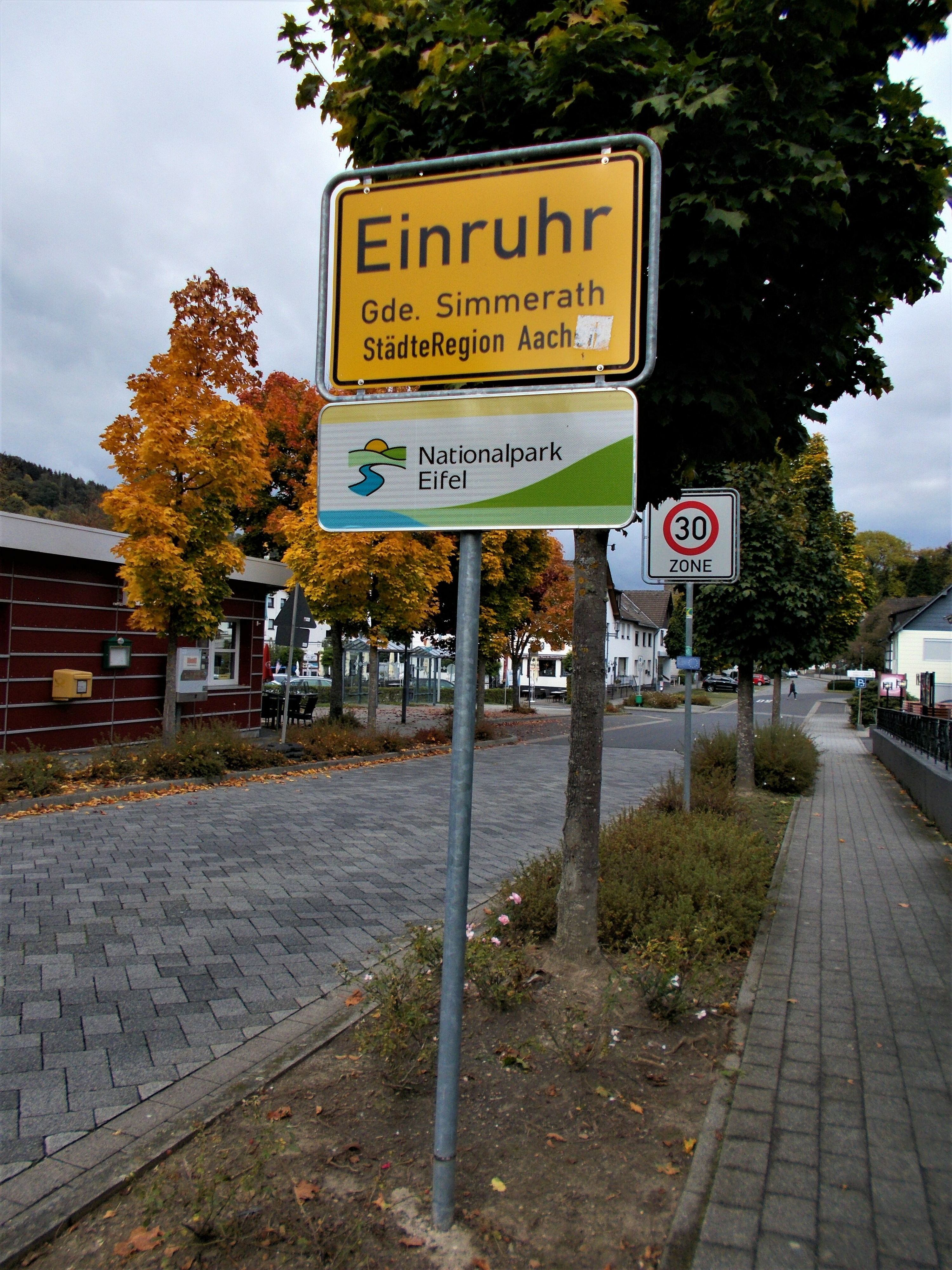 In Heimbach haben wir noch eine kleine Wartezeit zu überbrücken, bis uns das von uns gebuchte Trail-Shuttle von Heimbach nach Einruhr bringt. Die Zeit nutzen wir, um der Dönerbude am Kreisverkehr gegenüber einen Besuch abzustatten. Wir ergattern draußen einen Tisch und jede von uns schiebt bei ca. 12 Grad ein für heute letztes warmes Essen in sich hinein. Glücklich stellen wir fest, dass unsere auserwählten Pom-Döner und Döner sehr lecker sind. Wir lassen uns viel Zeit, genießen das Essen sehr und schnecken irgendwann wieder zurück zum Bahnhof, an welchem sich das Nationalparktor von Heimbach befindet. Dieses stellt den Abfahrtspunkt des Trail-Shuttles dar. Wir setzen uns an die Treppe des Info-Hauses, aber leider ausversehen auf die falsche Seite. Als das Trail-Shuttle vorfährt, sehen wir es gar nicht, aber die Fahrerin hat uns dann mithilfe einer Mitarbeiterin des Nationalparktores doch noch gefunden. Das Trail-Shuttle ist nicht als solches zu erkennen (normaler schwarzer Kombi ohne Aufdruck), aber etwas peinlich ist es uns trotzdem, ausversehen auf der falschen Seite gewartet zu haben. Aber nun gut – wir haben uns ja nun gefunden. Die Fahrerin ist sehr nett, hat aber leider derzeit mit einer privaten schlimmen Situation zu kämpfen. Die Stimmung im Taxi ist deshalb bedrückt und ein plötzlich entgegenkommendes Motorrad in einer unübersichtlichen Kurve sorgt dafür, dass wir alle fast einen Herzinfarkt bekommen vor Schreck. Nach einigem Suchen nach dem richtigen Campingplatz werden wir schließlich mithilfe des GPS auf C.‘s Smartphone am Richtigen abgesetzt.