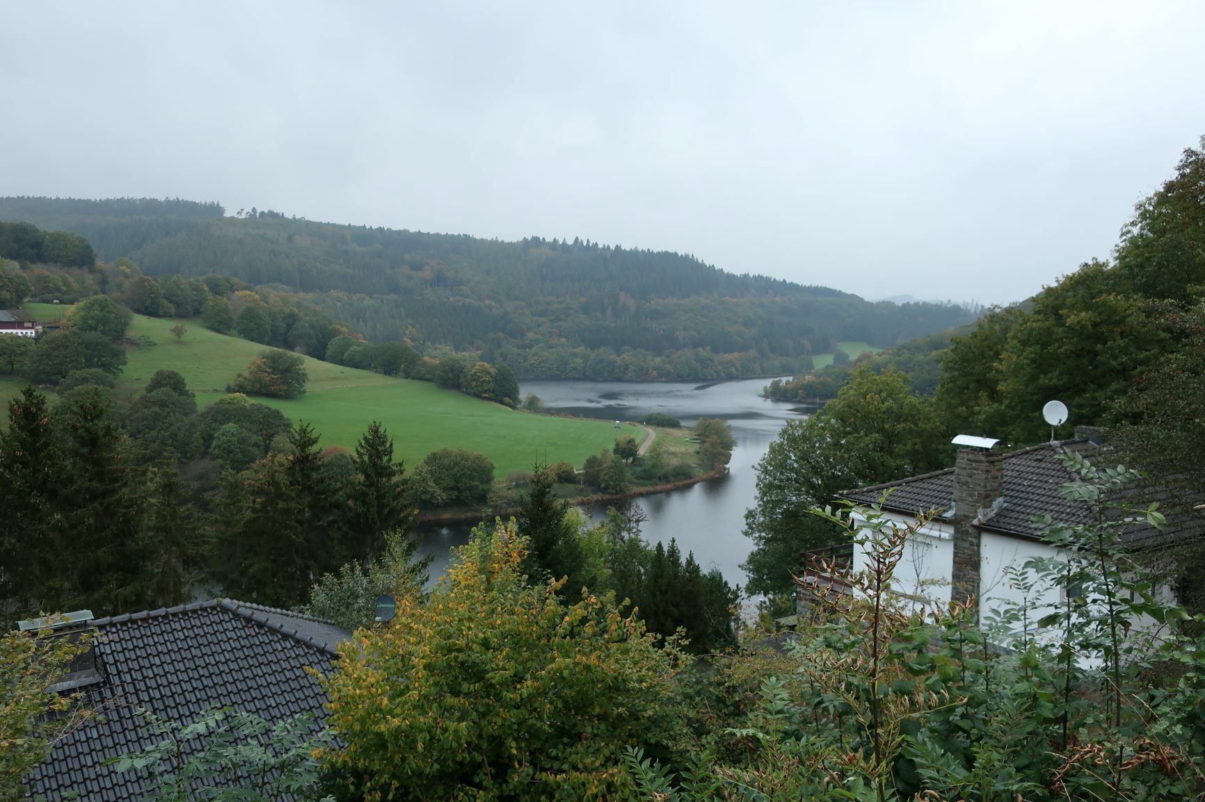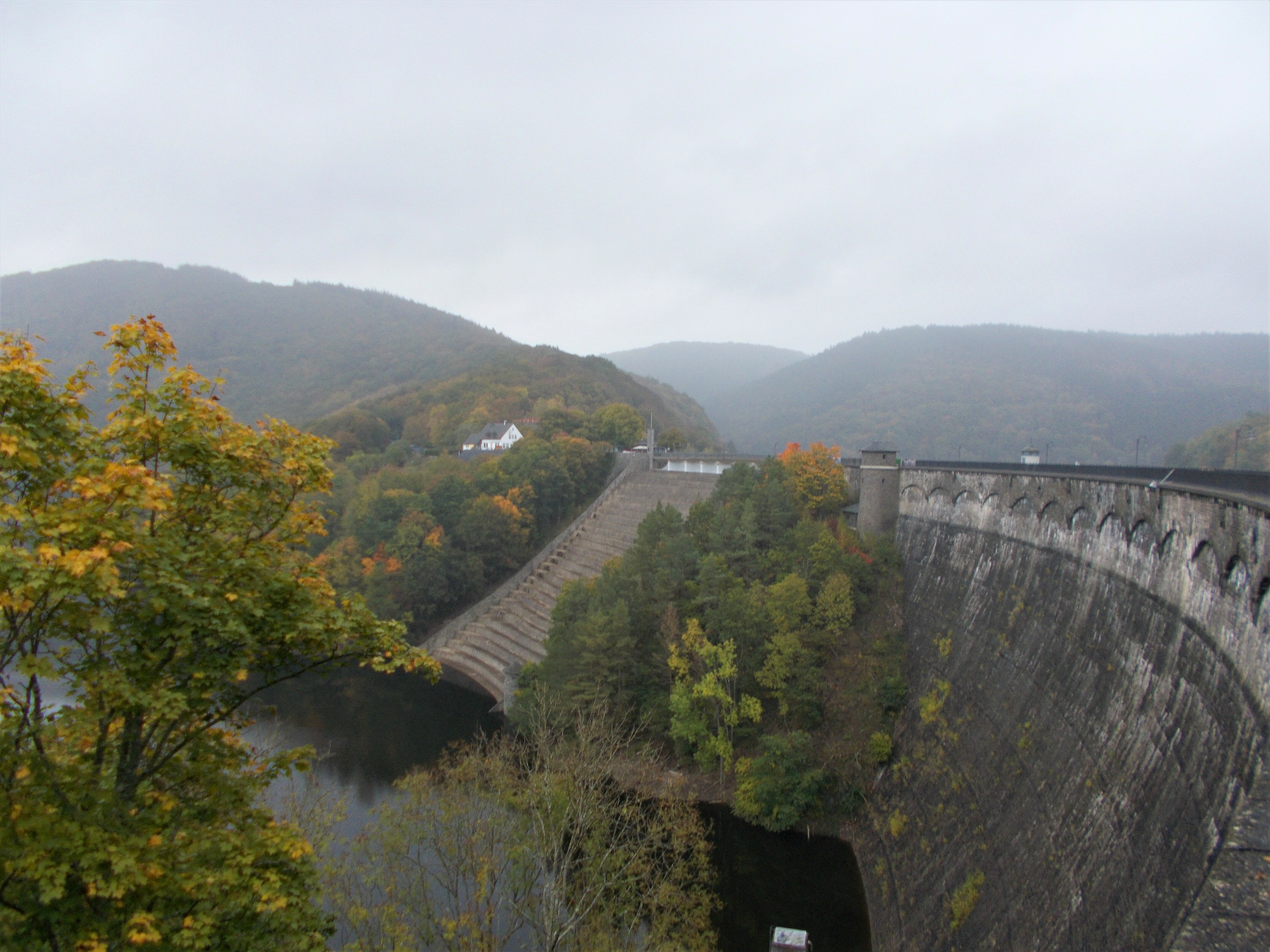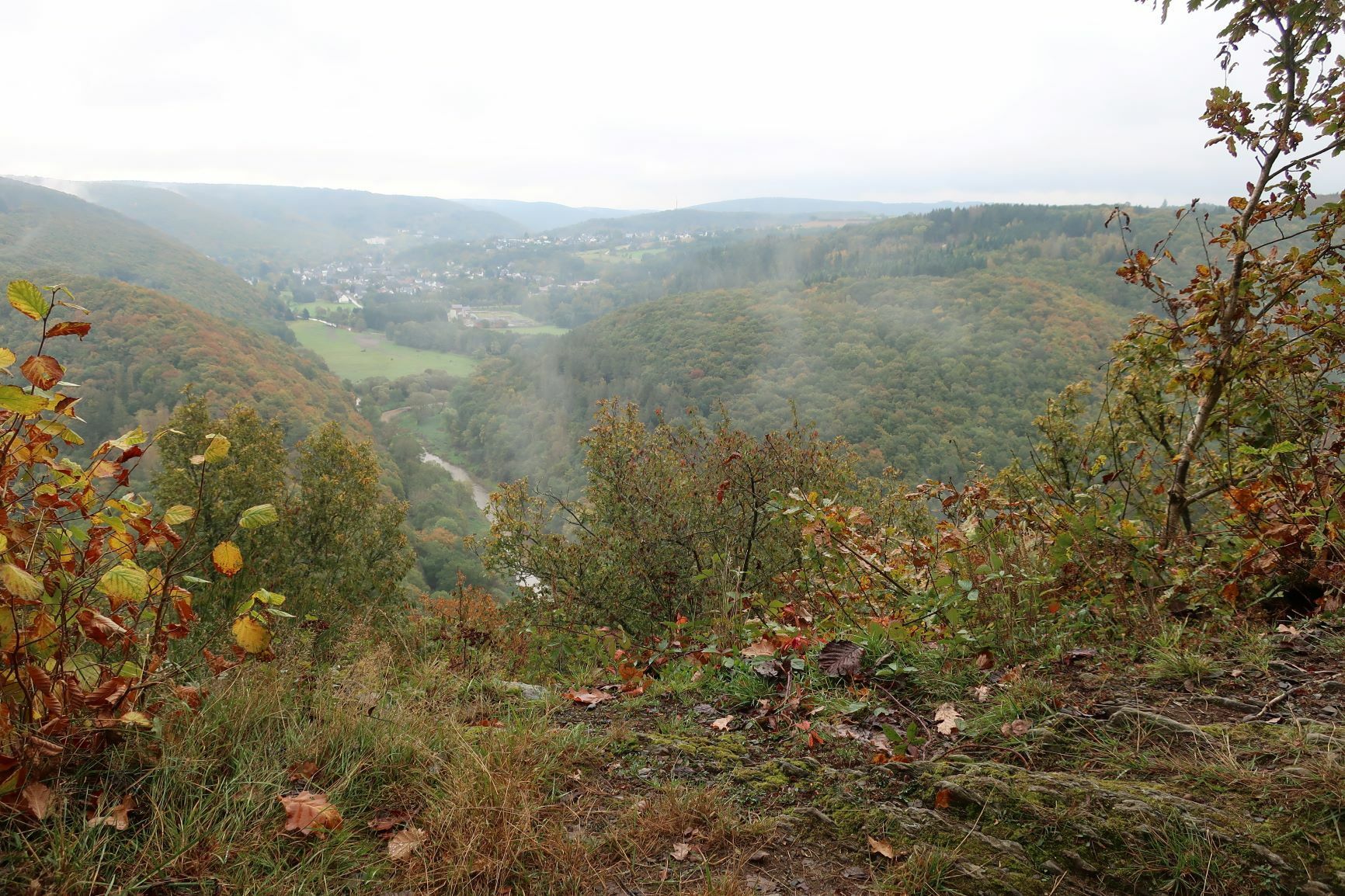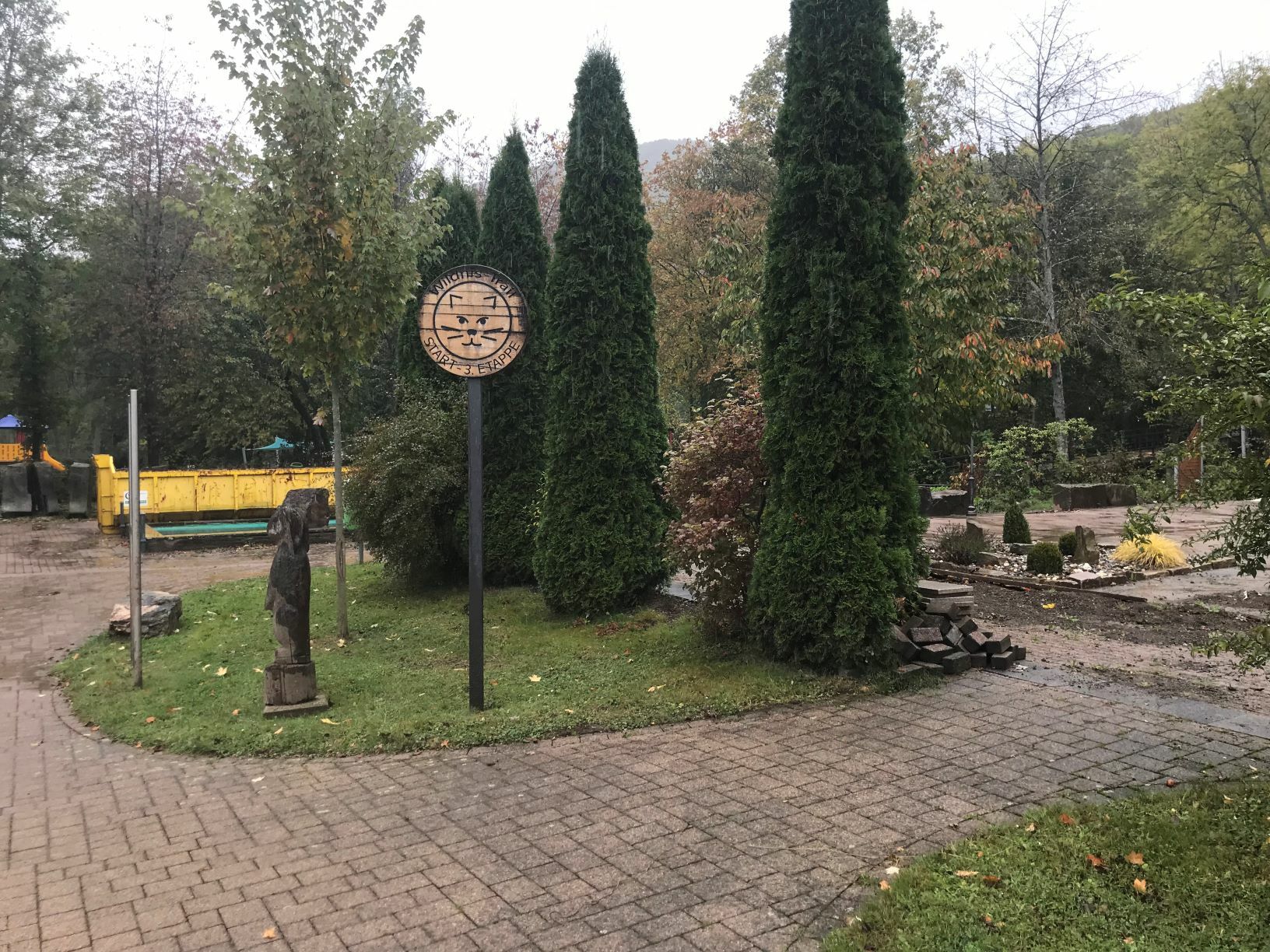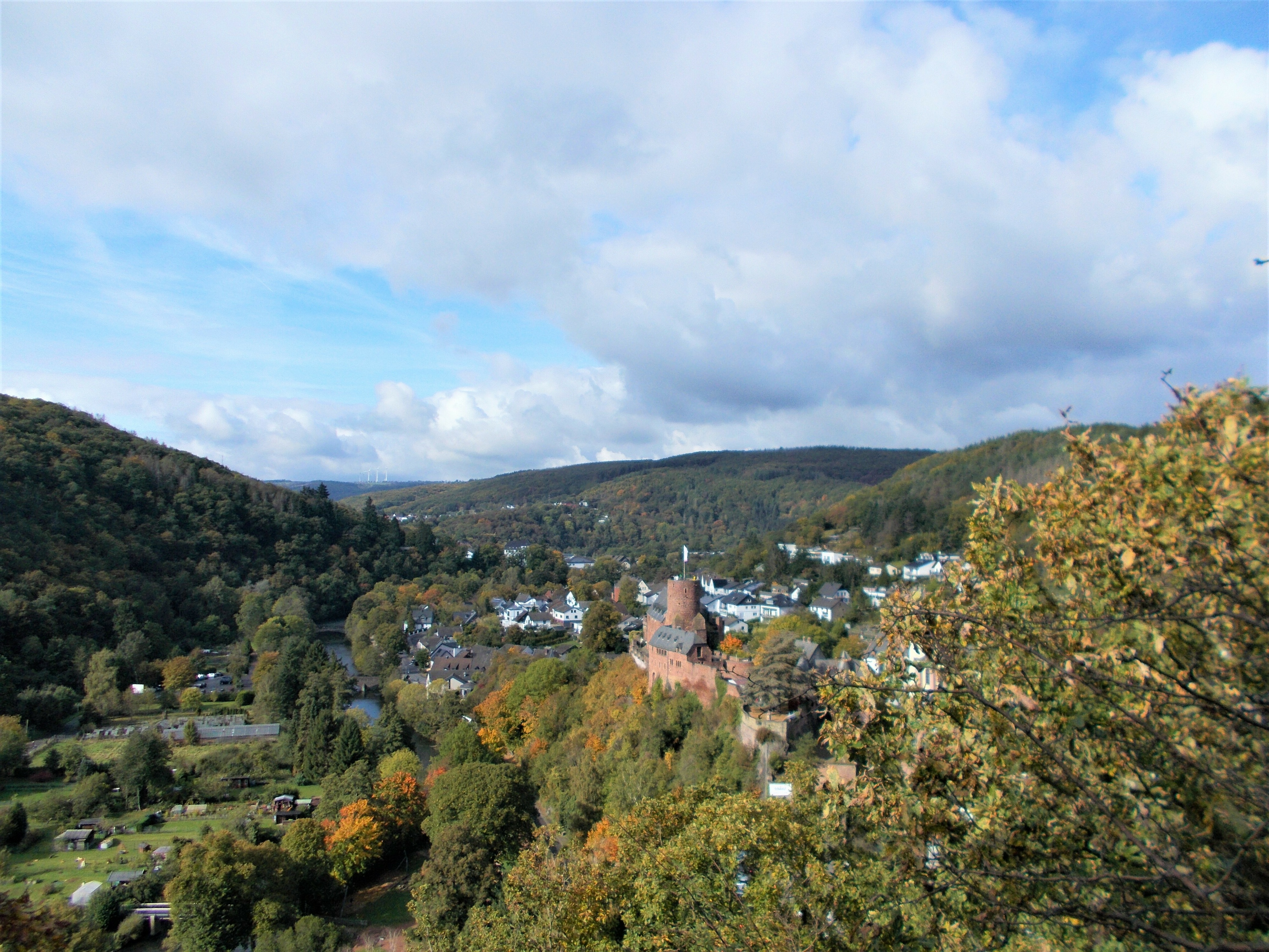 In Heimbach haben wir noch eine kleine Wartezeit zu überbrücken, bis uns das von uns gebuchte Trail-Shuttle von Heimbach nach Einruhr bringt. Die Zeit nutzen wir, um der Dönerbude am Kreisverkehr gegenüber einen Besuch abzustatten. Wir ergattern draußen einen Tisch und jede von uns schiebt bei ca. 12 Grad ein für heute letztes warmes Essen in sich hinein. Glücklich stellen wir fest, dass unsere auserwählten Pom-Döner und Döner sehr lecker sind. Wir lassen uns viel Zeit, genießen das Essen sehr und schnecken irgendwann wieder zurück zum Bahnhof, an welchem sich das Nationalparktor von Heimbach befindet. Dieses stellt den Abfahrtspunkt des Trail-Shuttles dar. Wir setzen uns an die Treppe des Info-Hauses, aber leider ausversehen auf die falsche Seite. Als das Trail-Shuttle vorfährt, sehen wir es gar nicht, aber die Fahrerin hat uns dann mithilfe einer Mitarbeiterin des Nationalparktores doch noch gefunden. Das Trail-Shuttle ist nicht als solches zu erkennen (normaler schwarzer Kombi ohne Aufdruck), aber etwas peinlich ist es uns trotzdem, ausversehen auf der falschen Seite gewartet zu haben. Aber nun gut – wir haben uns ja nun gefunden. Die Fahrerin ist sehr nett, hat aber leider derzeit mit einer privaten schlimmen Situation zu kämpfen. Die Stimmung im Taxi ist deshalb bedrückt und ein plötzlich entgegenkommendes Motorrad in einer unübersichtlichen Kurve sorgt dafür, dass wir alle fast einen Herzinfarkt bekommen vor Schreck. Nach einigem Suchen nach dem richtigen Campingplatz werden wir schließlich mithilfe des GPS auf C.‘s Smartphone am Richtigen abgesetzt.