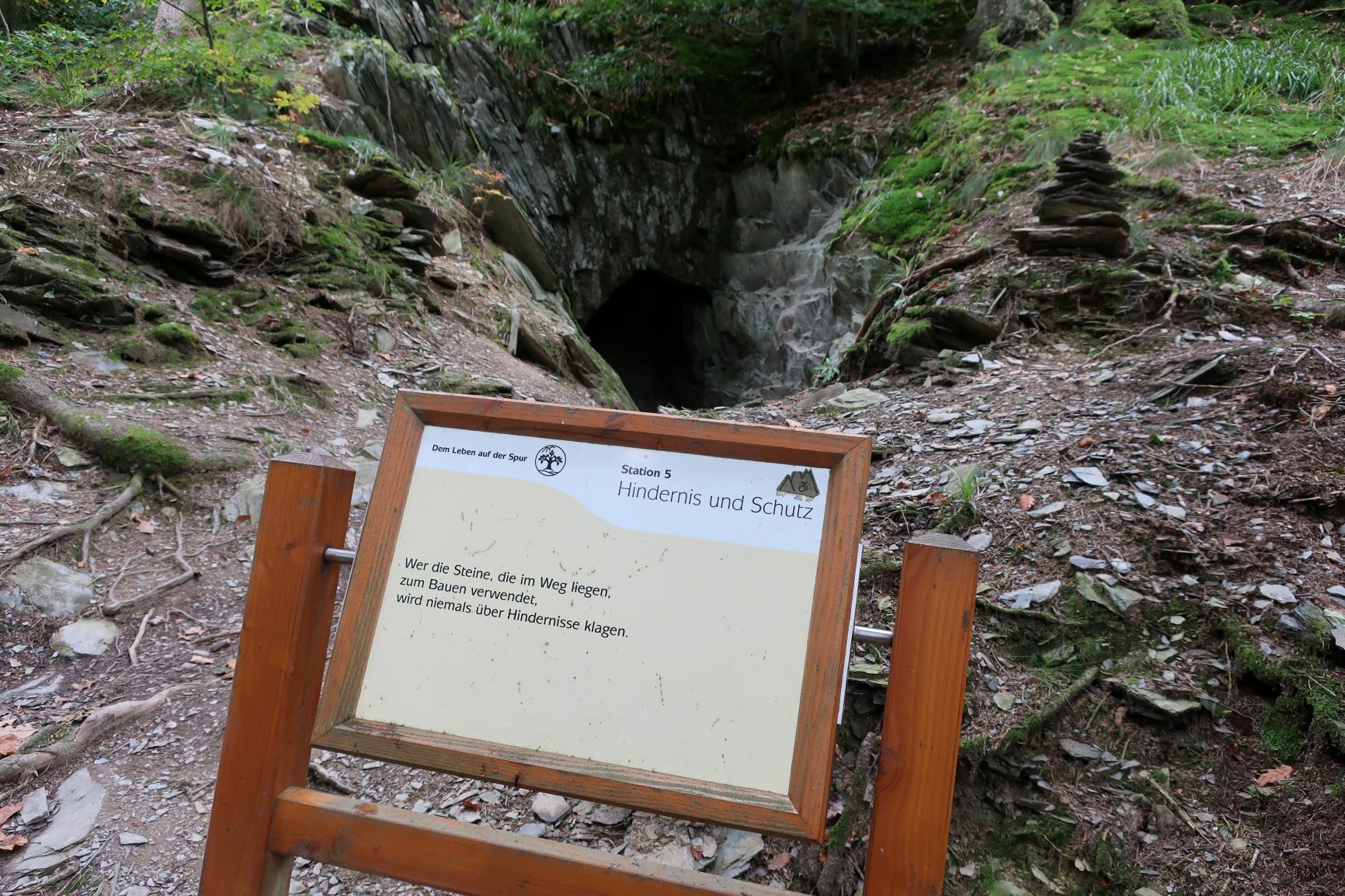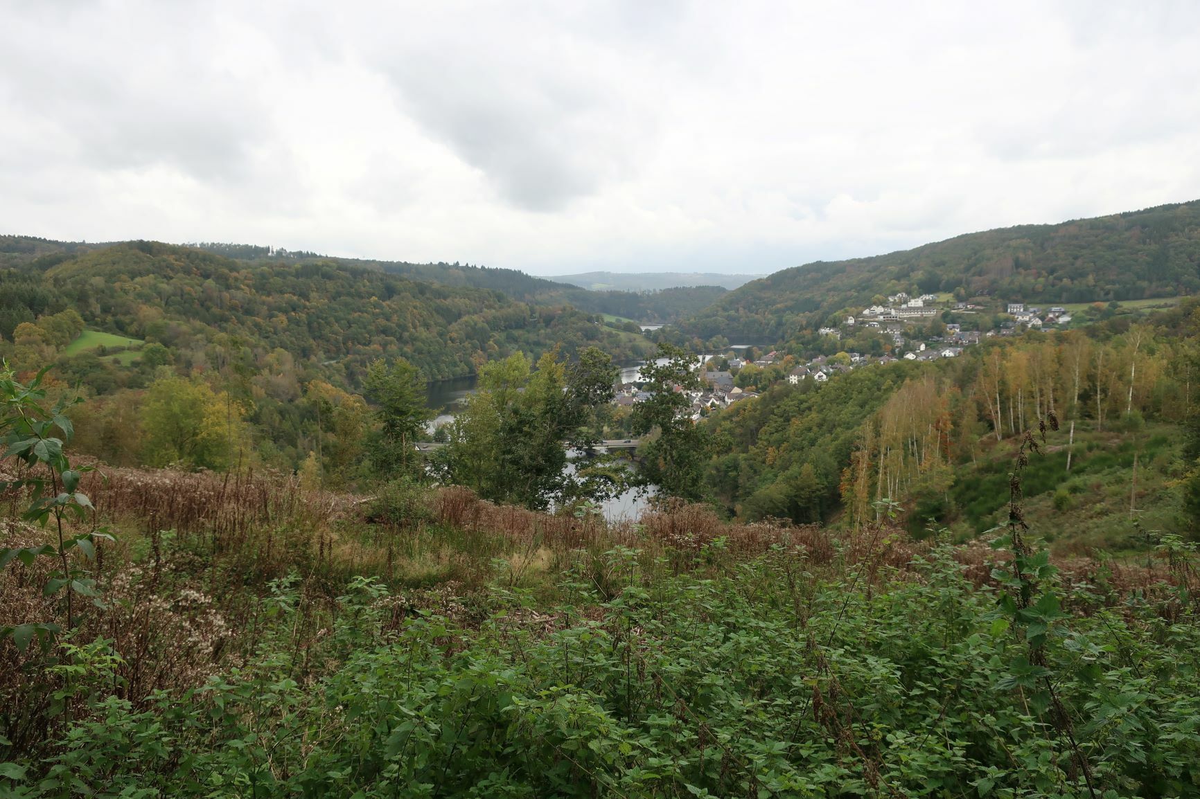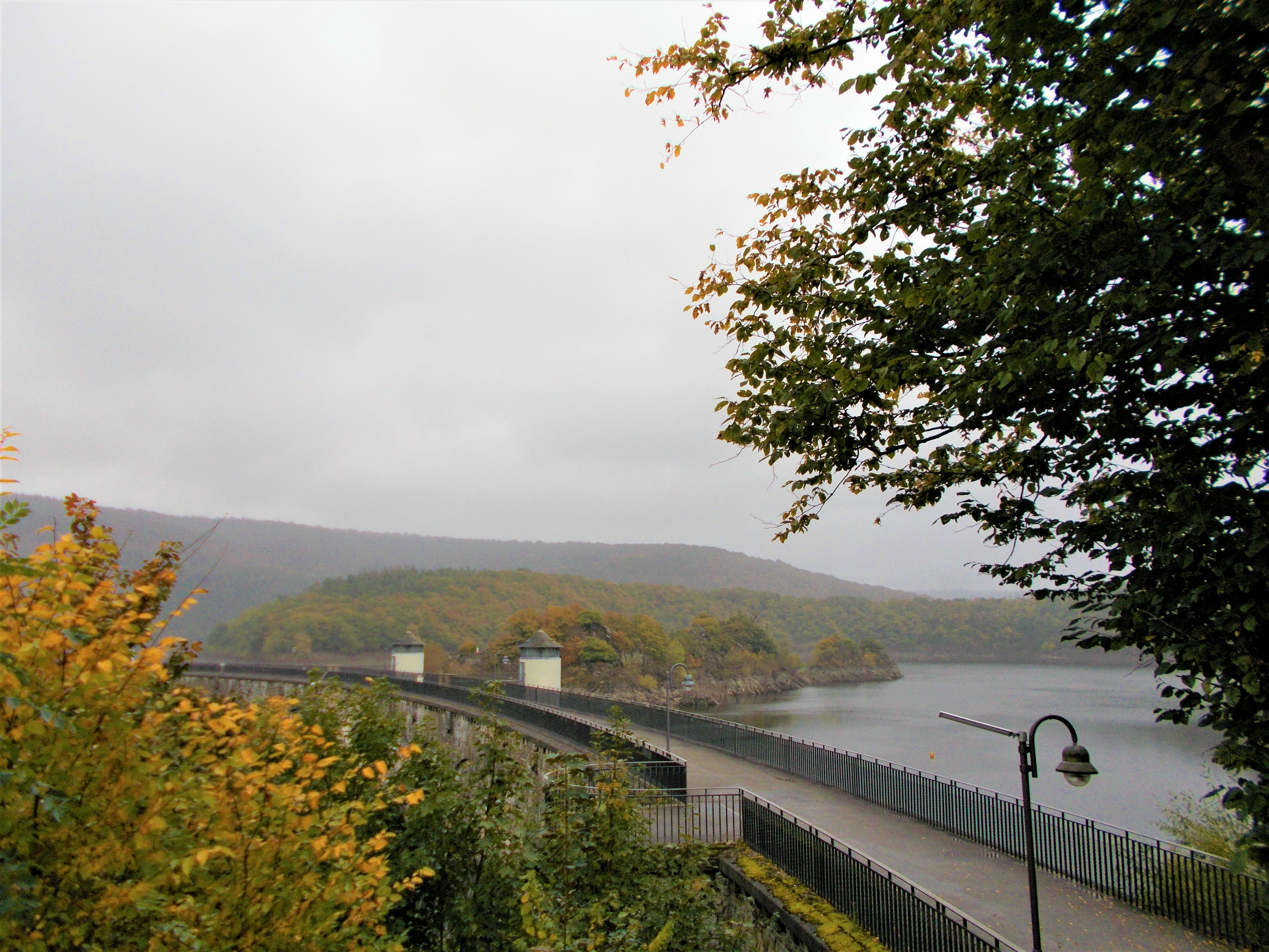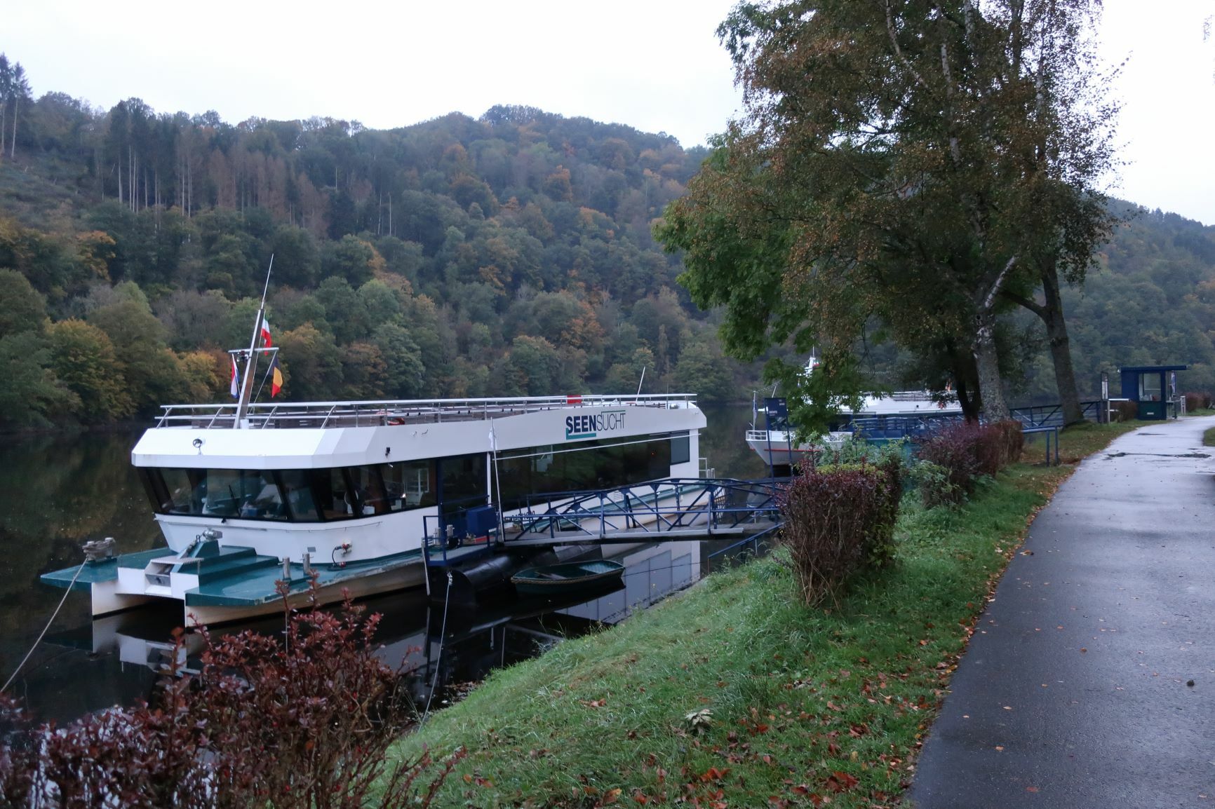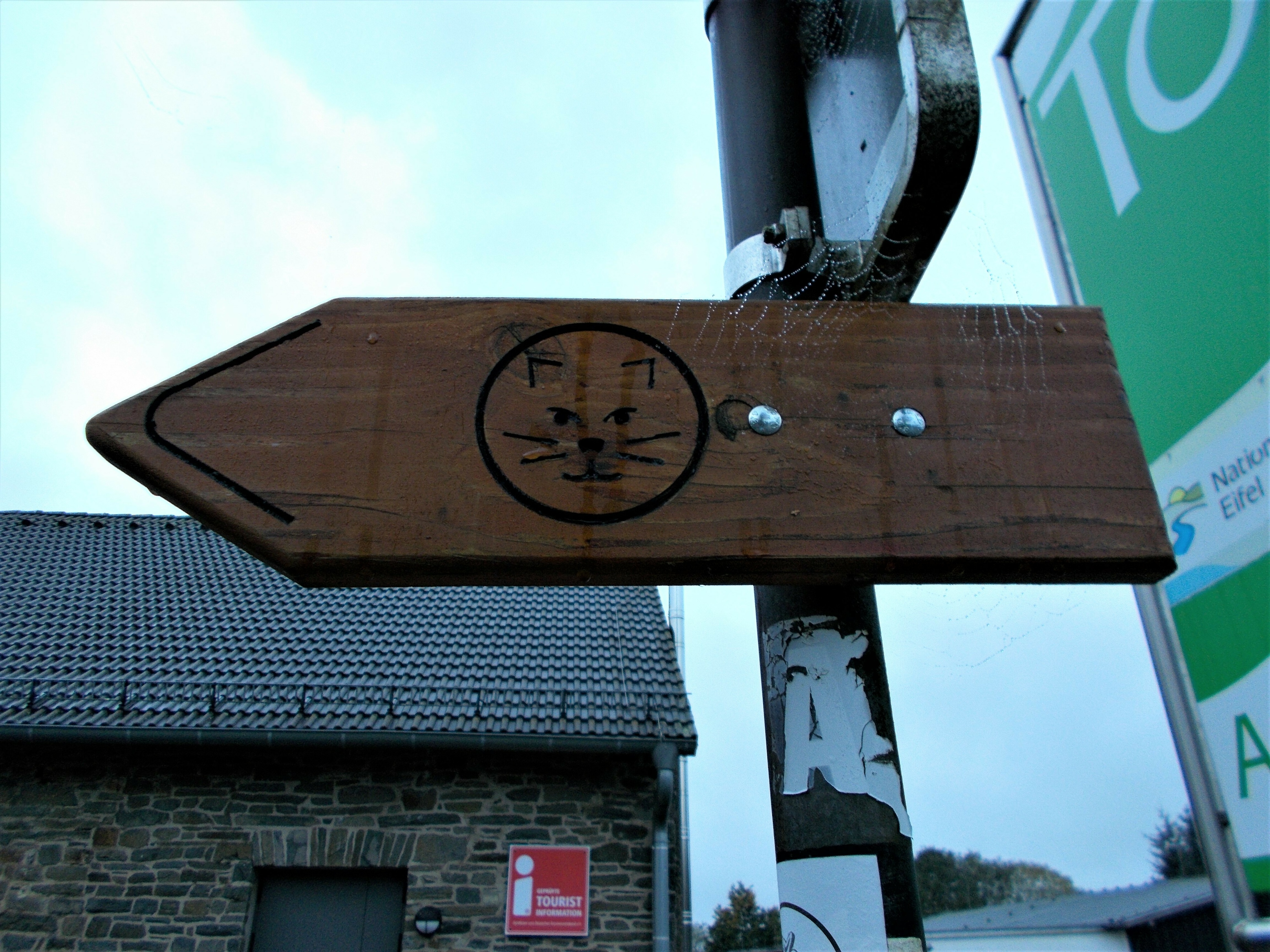 In Heimbach haben wir noch eine kleine Wartezeit zu überbrücken, bis uns das von uns gebuchte Trail-Shuttle von Heimbach nach Einruhr bringt. Die Zeit nutzen wir, um der Dönerbude am Kreisverkehr gegenüber einen Besuch abzustatten. Wir ergattern draußen einen Tisch und jede von uns schiebt bei ca. 12 Grad ein für heute letztes warmes Essen in sich hinein. Glücklich stellen wir fest, dass unsere auserwählten Pom-Döner und Döner sehr lecker sind. Wir lassen uns viel Zeit, genießen das Essen sehr und schnecken irgendwann wieder zurück zum Bahnhof, an welchem sich das Nationalparktor von Heimbach befindet. Dieses stellt den Abfahrtspunkt des Trail-Shuttles dar. Wir setzen uns an die Treppe des Info-Hauses, aber leider ausversehen auf die falsche Seite. Als das Trail-Shuttle vorfährt, sehen wir es gar nicht, aber die Fahrerin hat uns dann mithilfe einer Mitarbeiterin des Nationalparktores doch noch gefunden. Das Trail-Shuttle ist nicht als solches zu erkennen (normaler schwarzer Kombi ohne Aufdruck), aber etwas peinlich ist es uns trotzdem, ausversehen auf der falschen Seite gewartet zu haben. Aber nun gut – wir haben uns ja nun gefunden. Die Fahrerin ist sehr nett, hat aber leider derzeit mit einer privaten schlimmen Situation zu kämpfen. Die Stimmung im Taxi ist deshalb bedrückt und ein plötzlich entgegenkommendes Motorrad in einer unübersichtlichen Kurve sorgt dafür, dass wir alle fast einen Herzinfarkt bekommen vor Schreck. Nach einigem Suchen nach dem richtigen Campingplatz werden wir schließlich mithilfe des GPS auf C.‘s Smartphone am Richtigen abgesetzt.