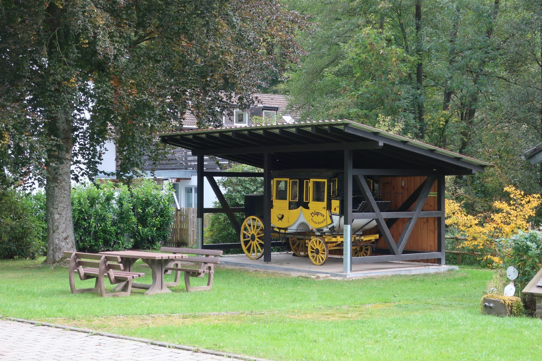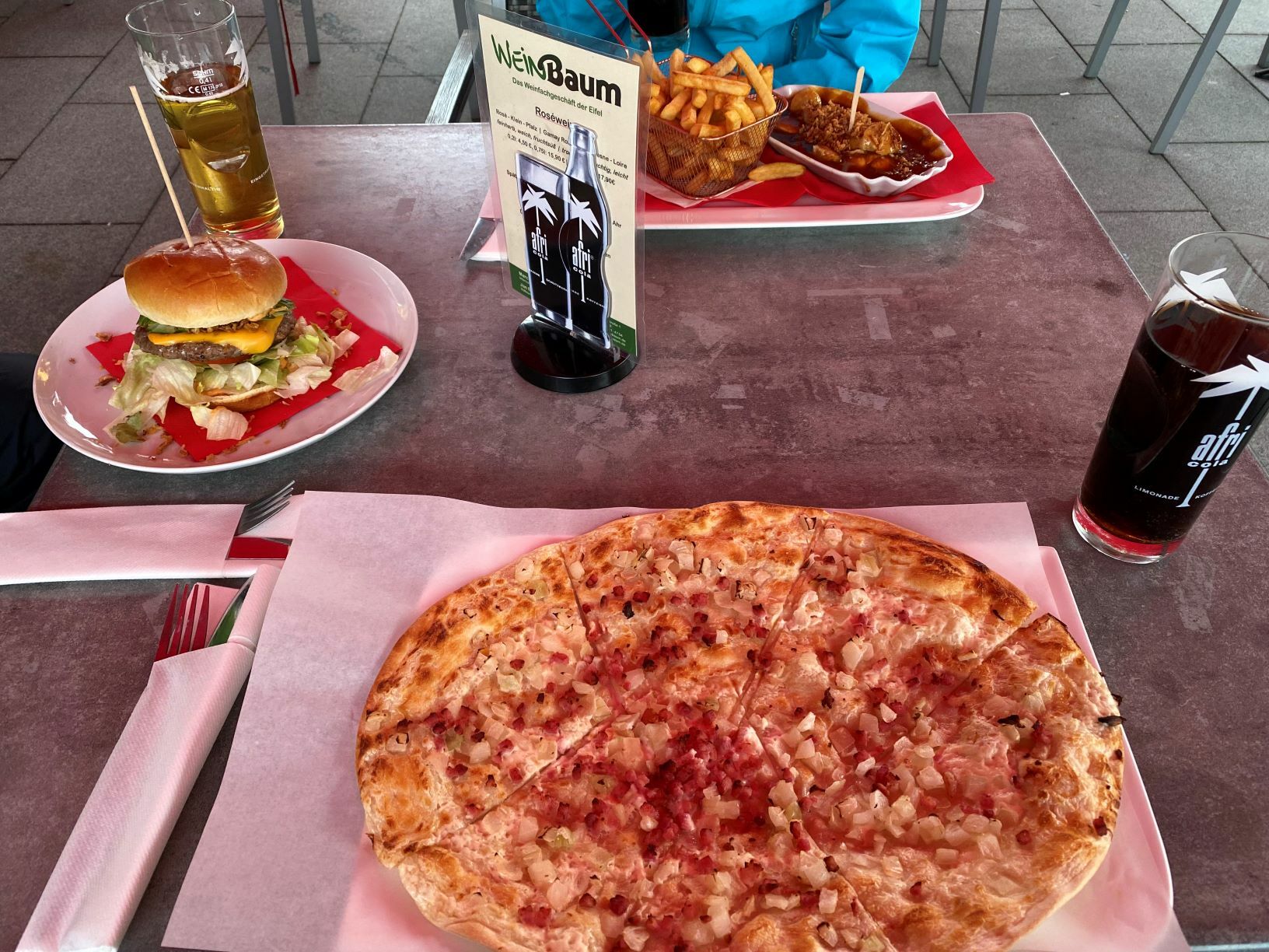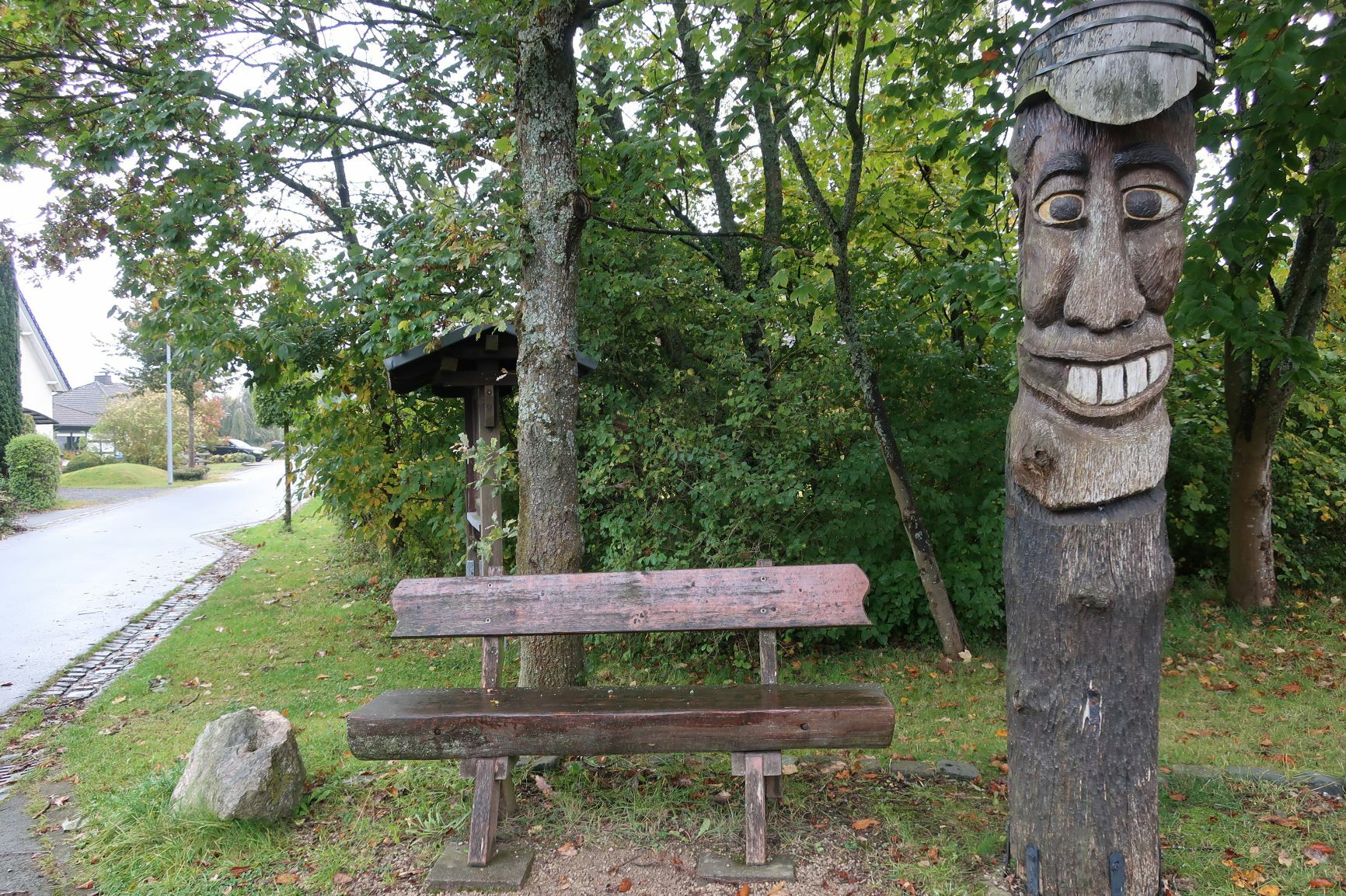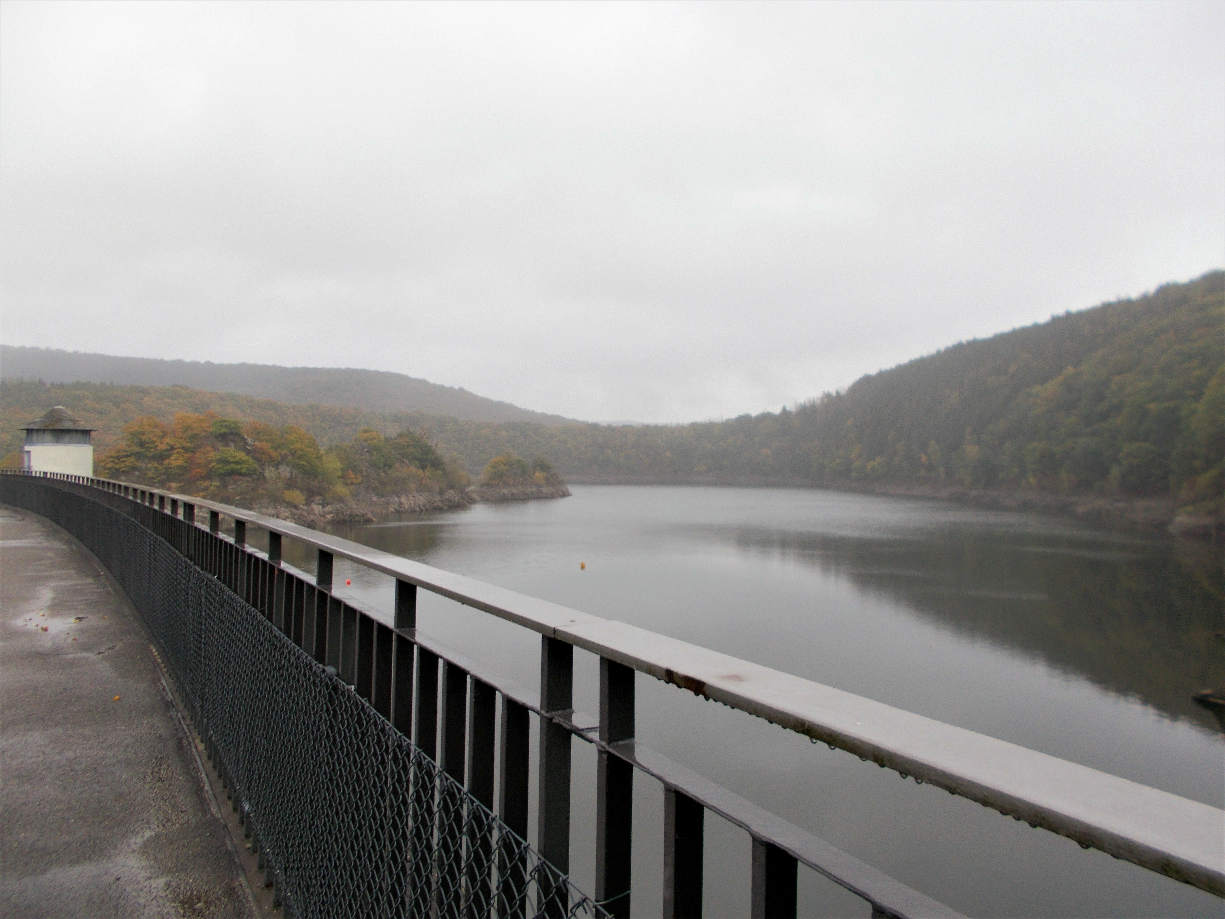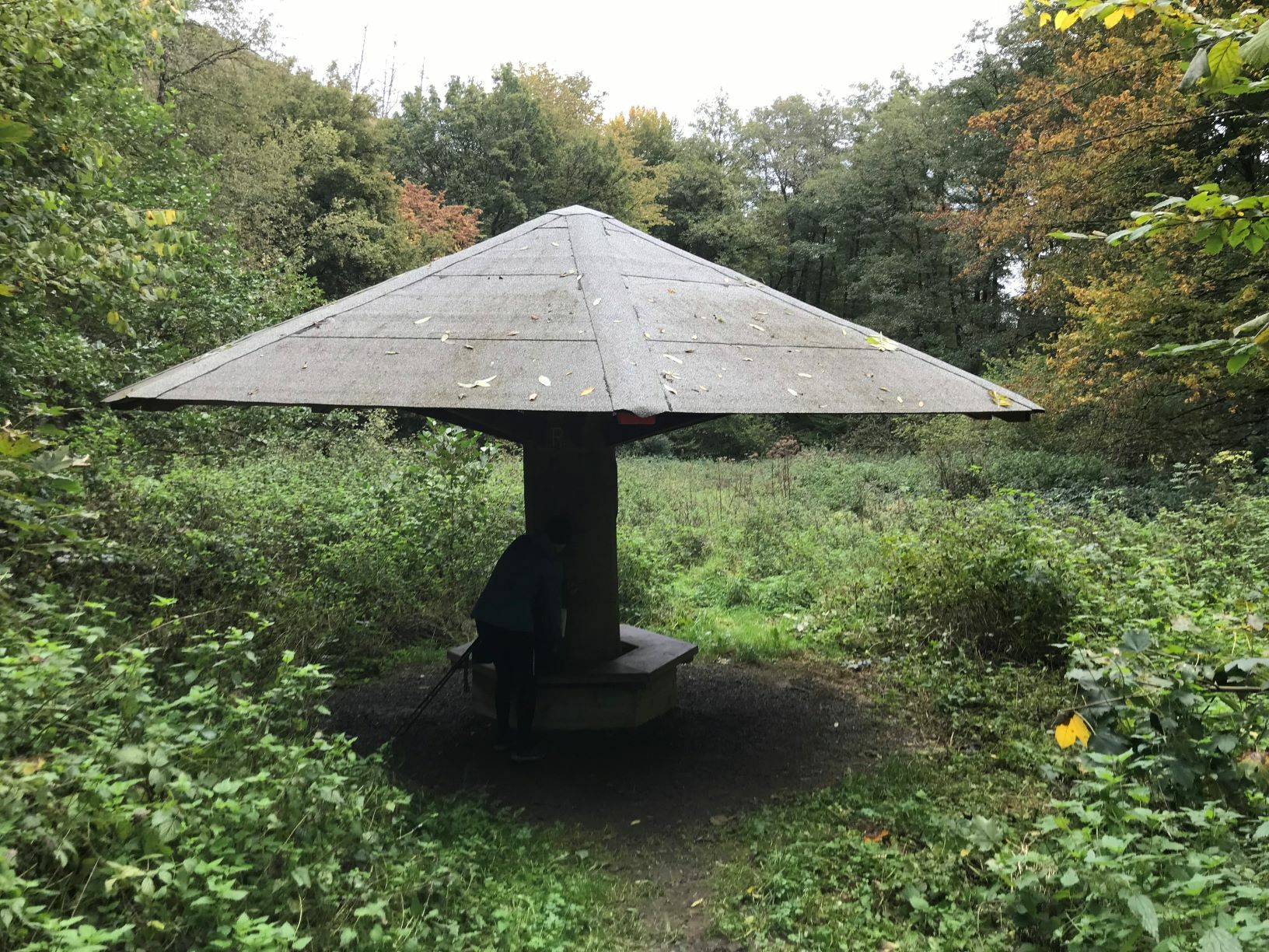 In Heimbach haben wir noch eine kleine Wartezeit zu überbrücken, bis uns das von uns gebuchte Trail-Shuttle von Heimbach nach Einruhr bringt. Die Zeit nutzen wir, um der Dönerbude am Kreisverkehr gegenüber einen Besuch abzustatten. Wir ergattern draußen einen Tisch und jede von uns schiebt bei ca. 12 Grad ein für heute letztes warmes Essen in sich hinein. Glücklich stellen wir fest, dass unsere auserwählten Pom-Döner und Döner sehr lecker sind. Wir lassen uns viel Zeit, genießen das Essen sehr und schnecken irgendwann wieder zurück zum Bahnhof, an welchem sich das Nationalparktor von Heimbach befindet. Dieses stellt den Abfahrtspunkt des Trail-Shuttles dar. Wir setzen uns an die Treppe des Info-Hauses, aber leider ausversehen auf die falsche Seite. Als das Trail-Shuttle vorfährt, sehen wir es gar nicht, aber die Fahrerin hat uns dann mithilfe einer Mitarbeiterin des Nationalparktores doch noch gefunden. Das Trail-Shuttle ist nicht als solches zu erkennen (normaler schwarzer Kombi ohne Aufdruck), aber etwas peinlich ist es uns trotzdem, ausversehen auf der falschen Seite gewartet zu haben. Aber nun gut – wir haben uns ja nun gefunden. Die Fahrerin ist sehr nett, hat aber leider derzeit mit einer privaten schlimmen Situation zu kämpfen. Die Stimmung im Taxi ist deshalb bedrückt und ein plötzlich entgegenkommendes Motorrad in einer unübersichtlichen Kurve sorgt dafür, dass wir alle fast einen Herzinfarkt bekommen vor Schreck. Nach einigem Suchen nach dem richtigen Campingplatz werden wir schließlich mithilfe des GPS auf C.‘s Smartphone am Richtigen abgesetzt.