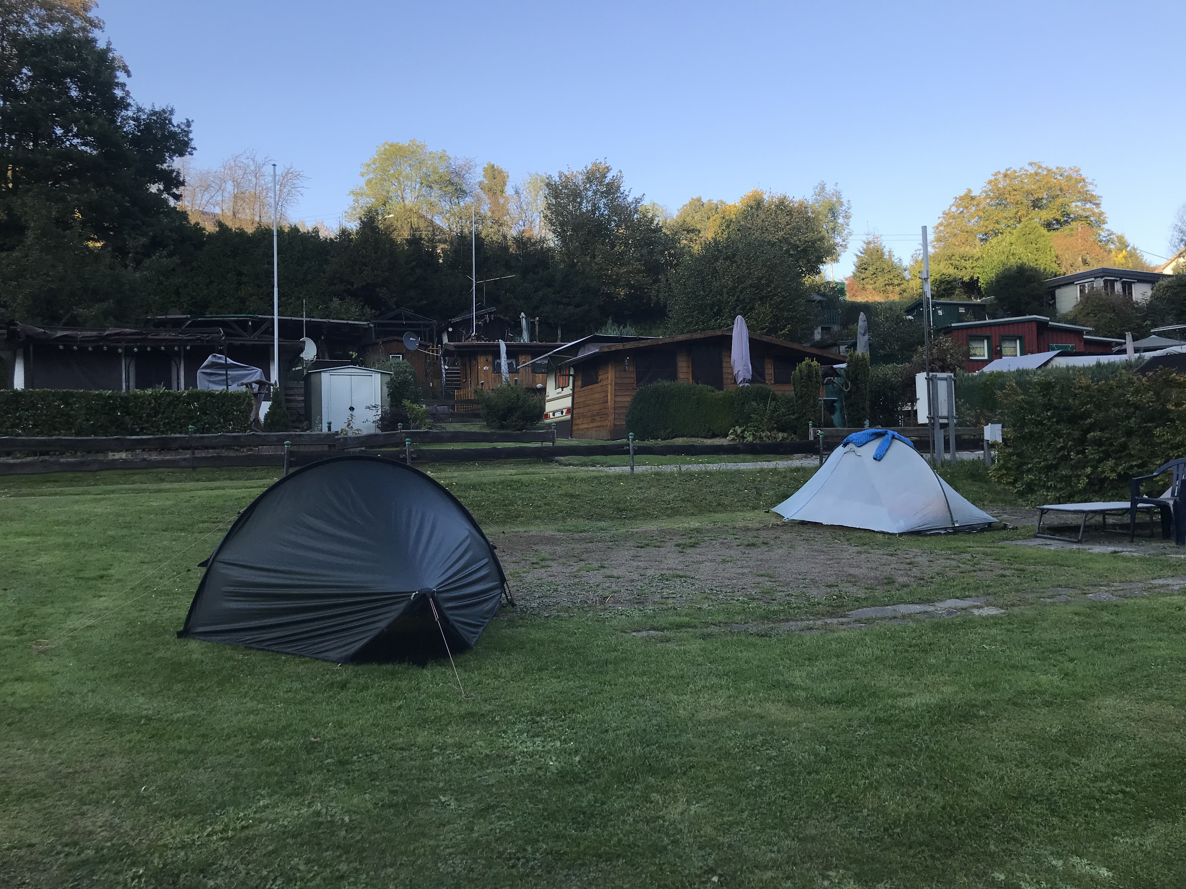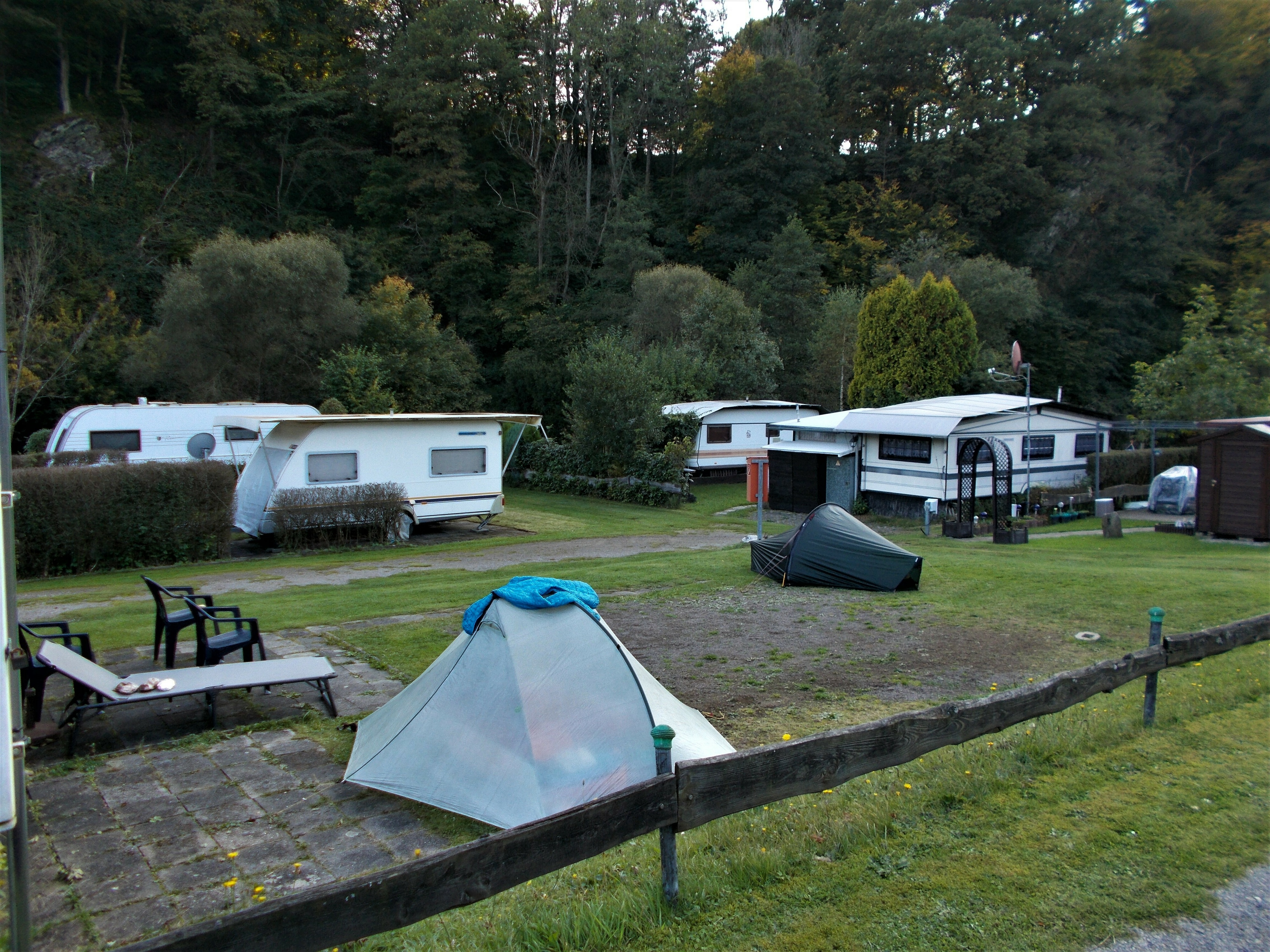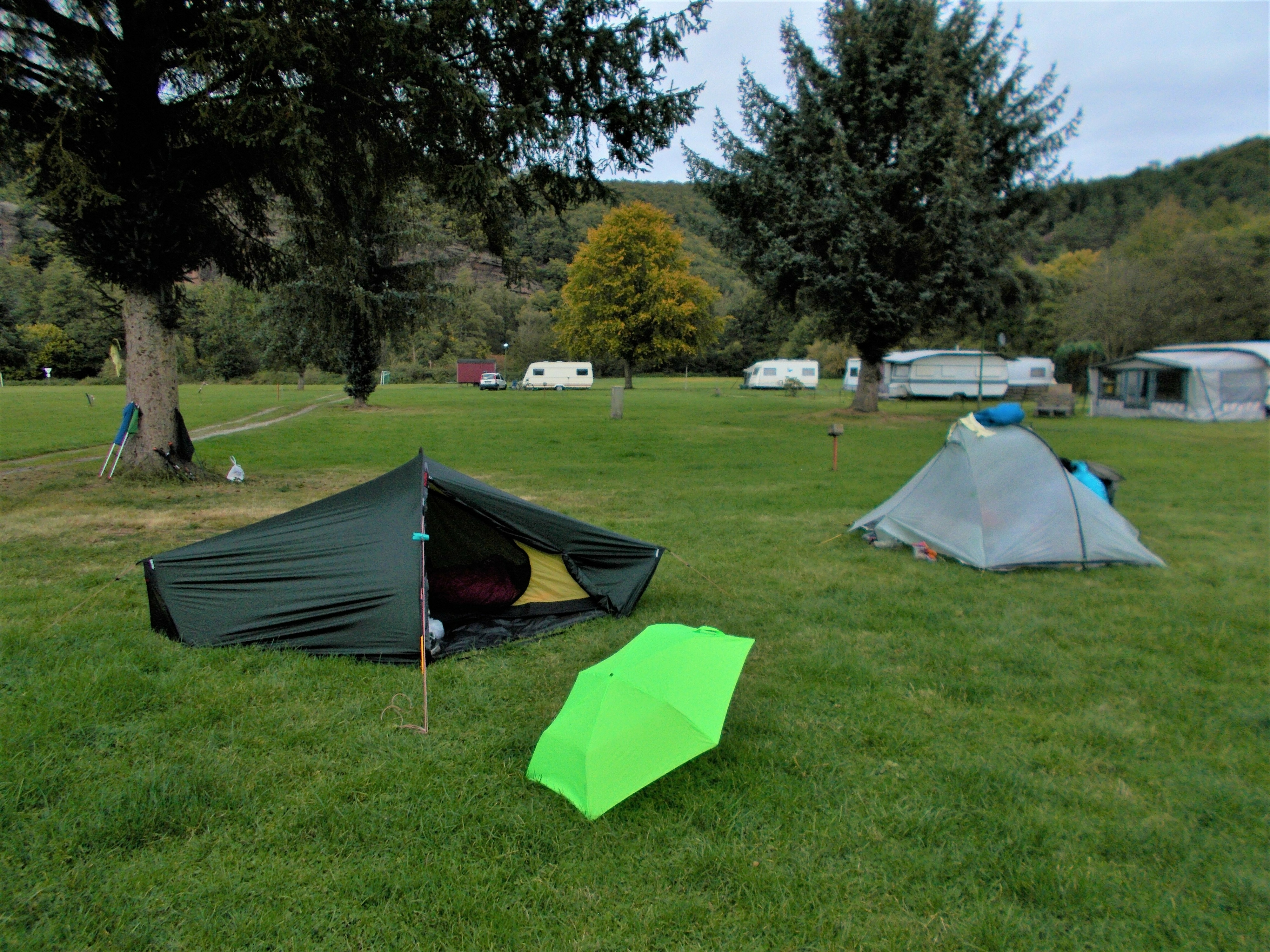 Obwohl es ein Sonntag Nachmittag in den Herbstferien NRW’s ist, ist am Campingplatz absolut nichts los. Wir finden den Inhaber des Platzes, welcher uns die Wahl lässt, die Zelte direkt am Fluss aufzustellen oder auf einem kleinen Stück Schotter/Wiese.