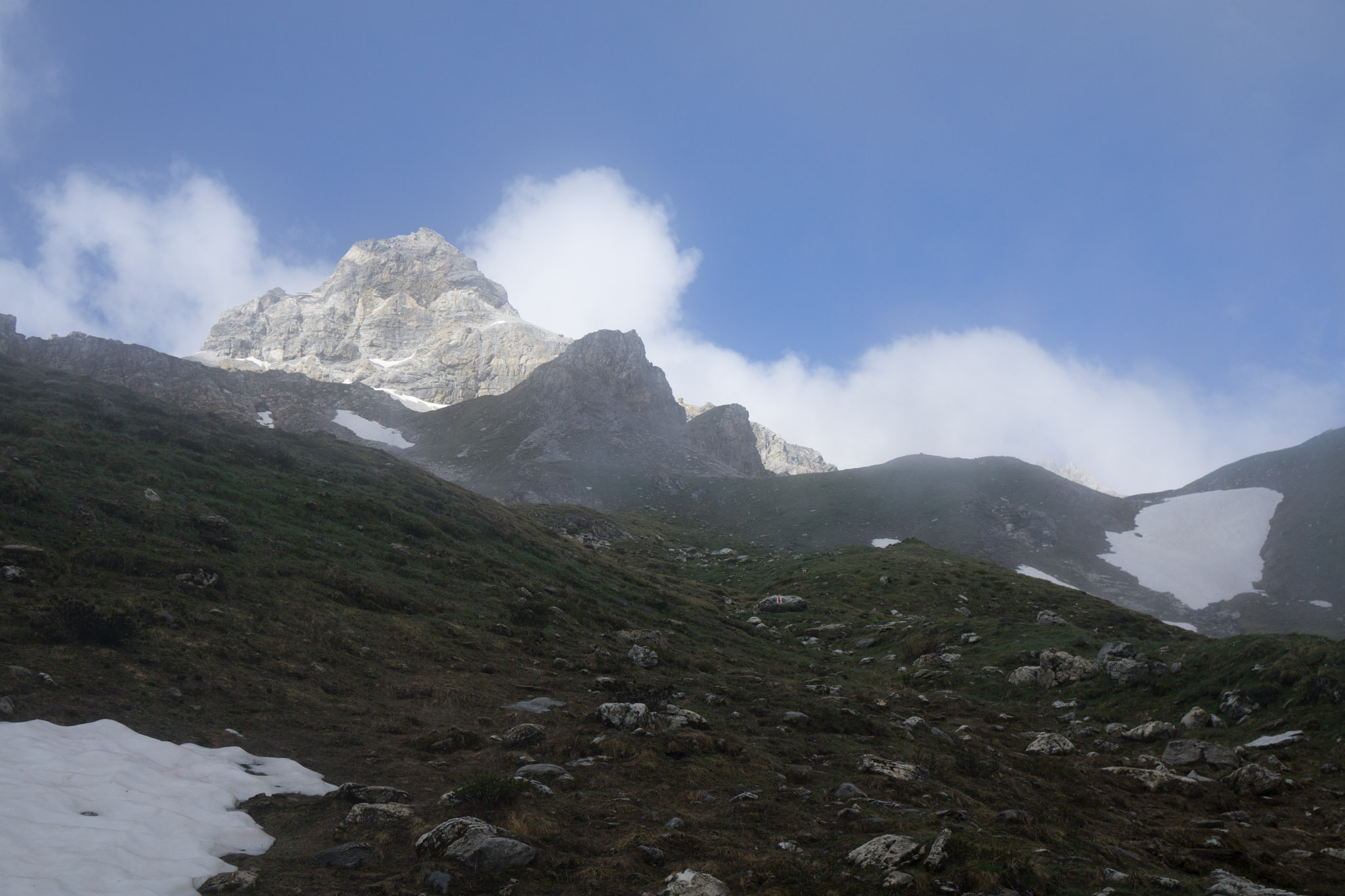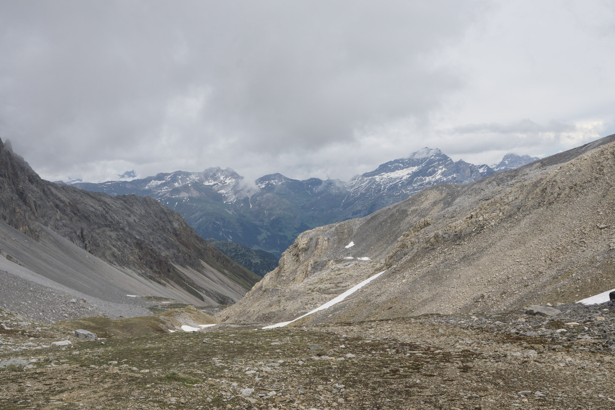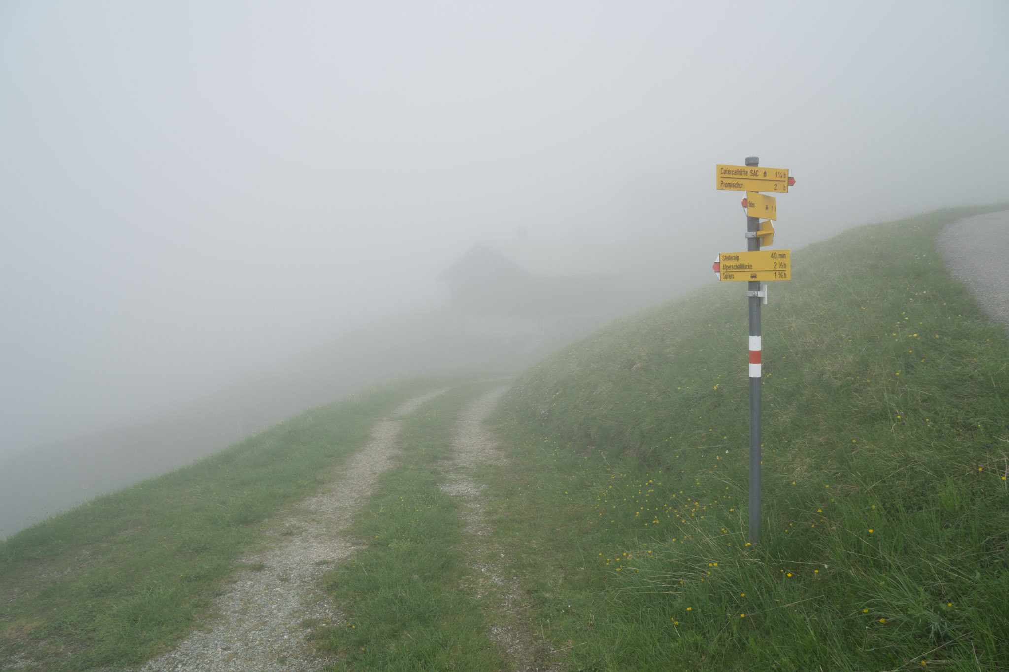 Zuerst per Leihtrotti um 5 Uhr zum Bahnhof, vorbei an den Zechern der Vornacht und per Bahn bis Thusis. Ab dort per Postbus nach Sufers und um kurz nach 8 Uhr los. Dass ich der falschen Abzweigung den Hang hoch gehe und so eher zur Cufercalhütte hoch gehe stört mich nicht. Der Wetterbericht ist über Nacht schlechter geworden mit maximal etwas Wolkenauflockerung gegen Mittag, also besteht keine Eile und das Gipfelziel ist eh fraglich. Die Zeit, die ich bei der Querung auf 2000m zur Alperschällilücke verliere, stört nicht. Sollte das mit dem Berg schief gehen, kann ich immer noch in Richtung Safiental weiter und zumindest die Bodahora mitnehmen.