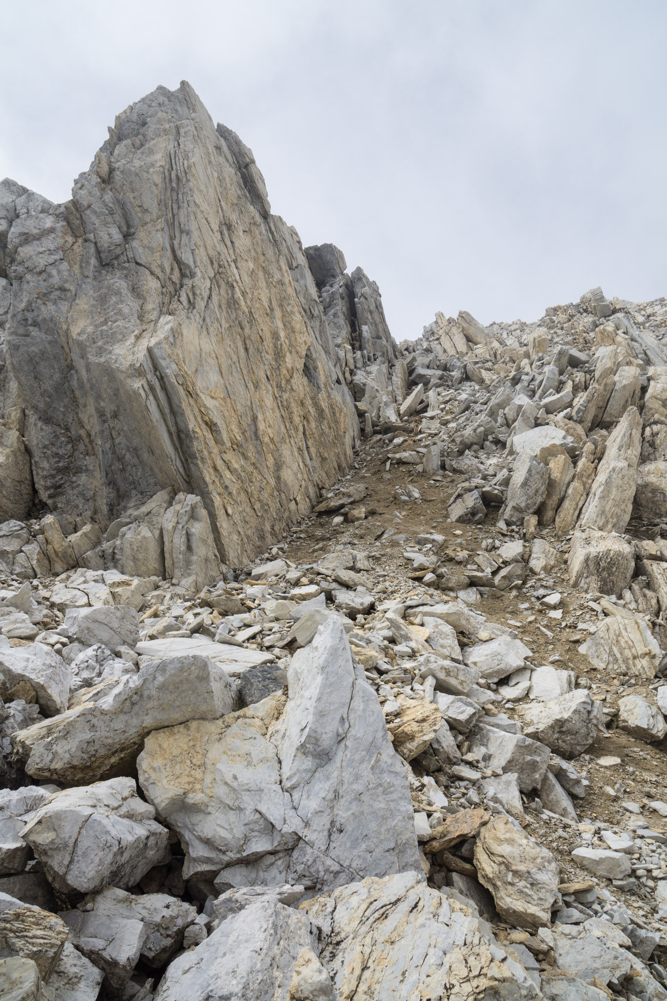 Oberes Ende des zweiten Geröllfelds. Hier nach links die Rampe hinauf.