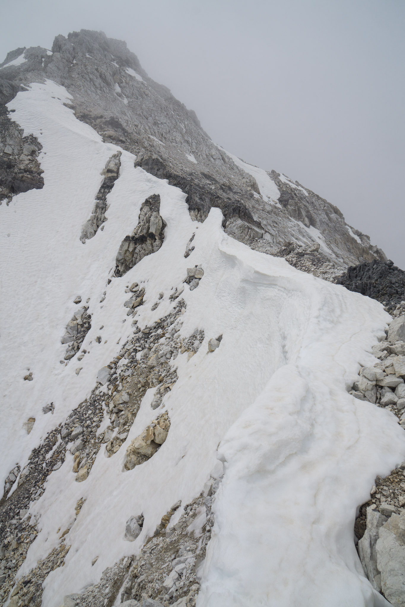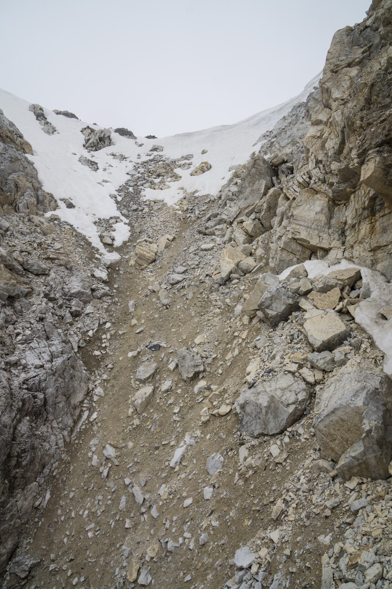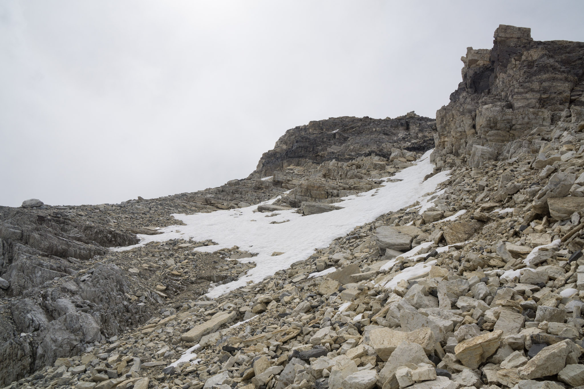 Abweichend von älteren Berichten findet sich eine recht gut ausgetretene Spur im Geröll, und so ist der Aufstieg zur unteren Rinne nicht besonders anstrengend (T3). Die Rinne rauf (T4) und weiter bis zum oberen Ende des dortigen Geröllfelds (T3, ebenfalls mit Pfad). auch dieses Feld geht es mit passabler Spur aufwärts und dann am oberen Ende über eine Rampe nach links hinauf auf eine Schulter auf etwa 2900m. Der Weiterweg ist eindeutig - 50m ein schmaler werdendes Band entlang bis zu einer zweiten rinne und diese dann hinauf. Eigentlich dachte ich, hier wäre Ende Gelände, da eine schattige Rinne auf 2900m Ende Mai eigentlich schneegefüllt sein sollte, aber: alles aper.