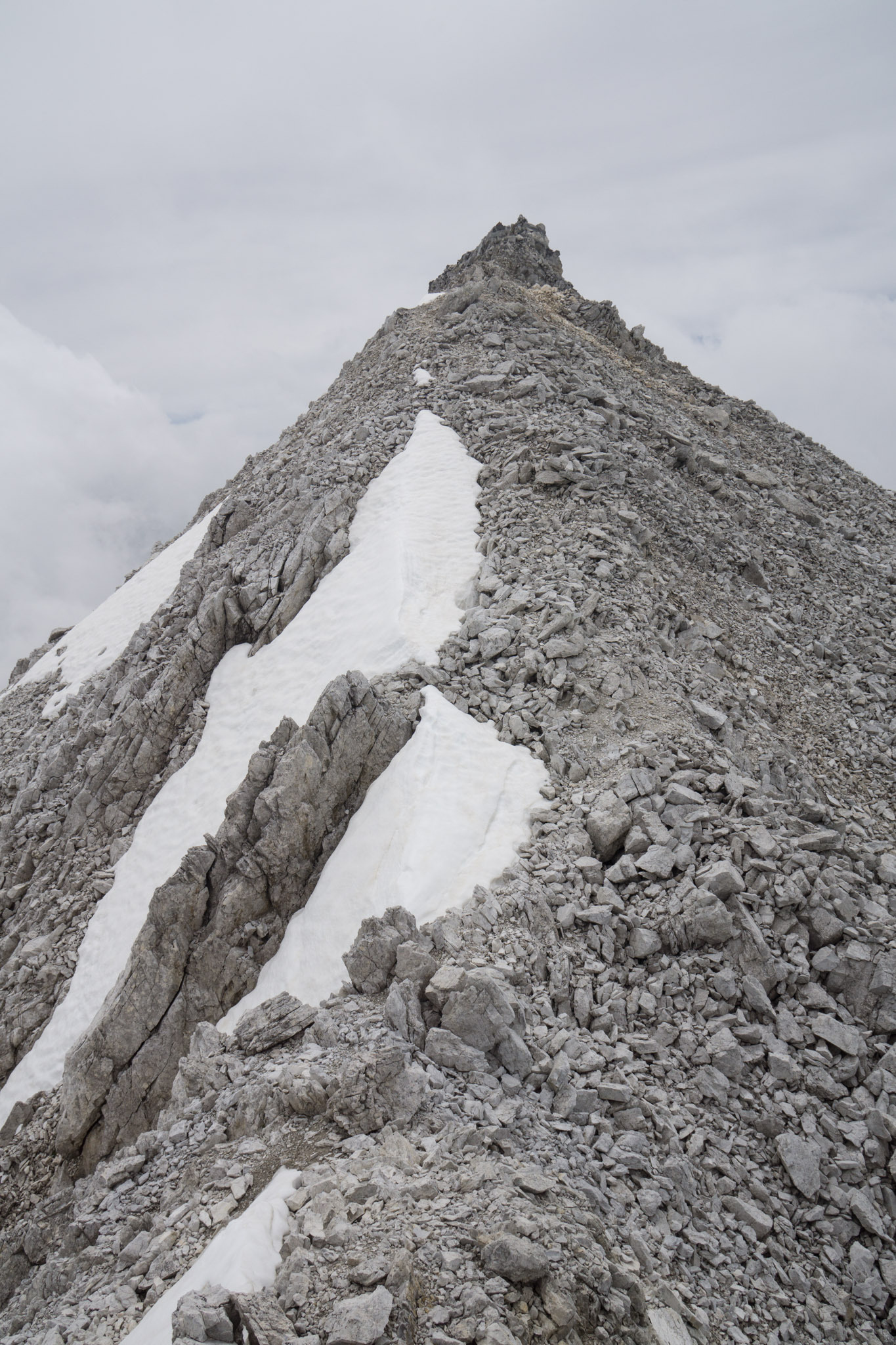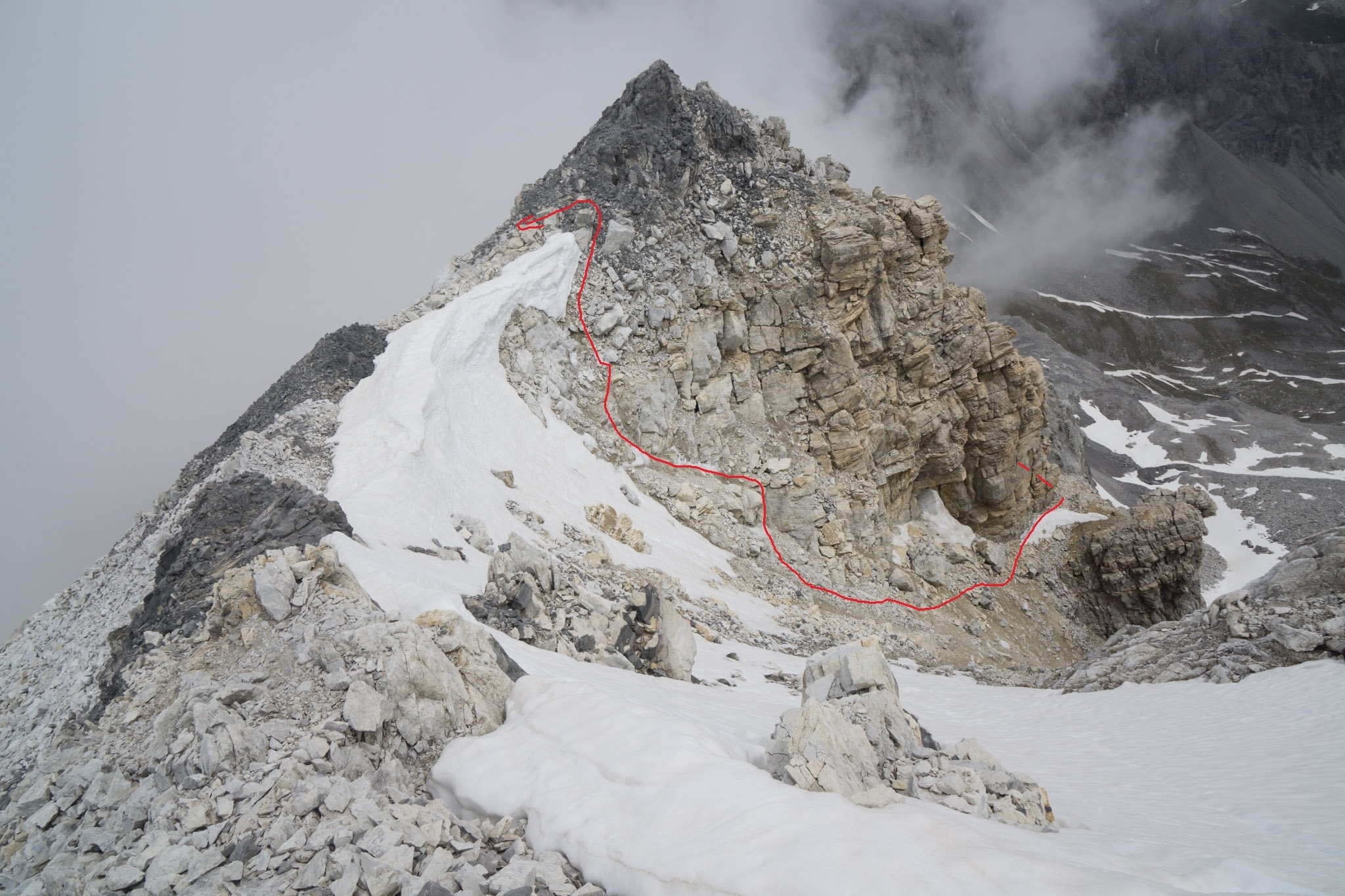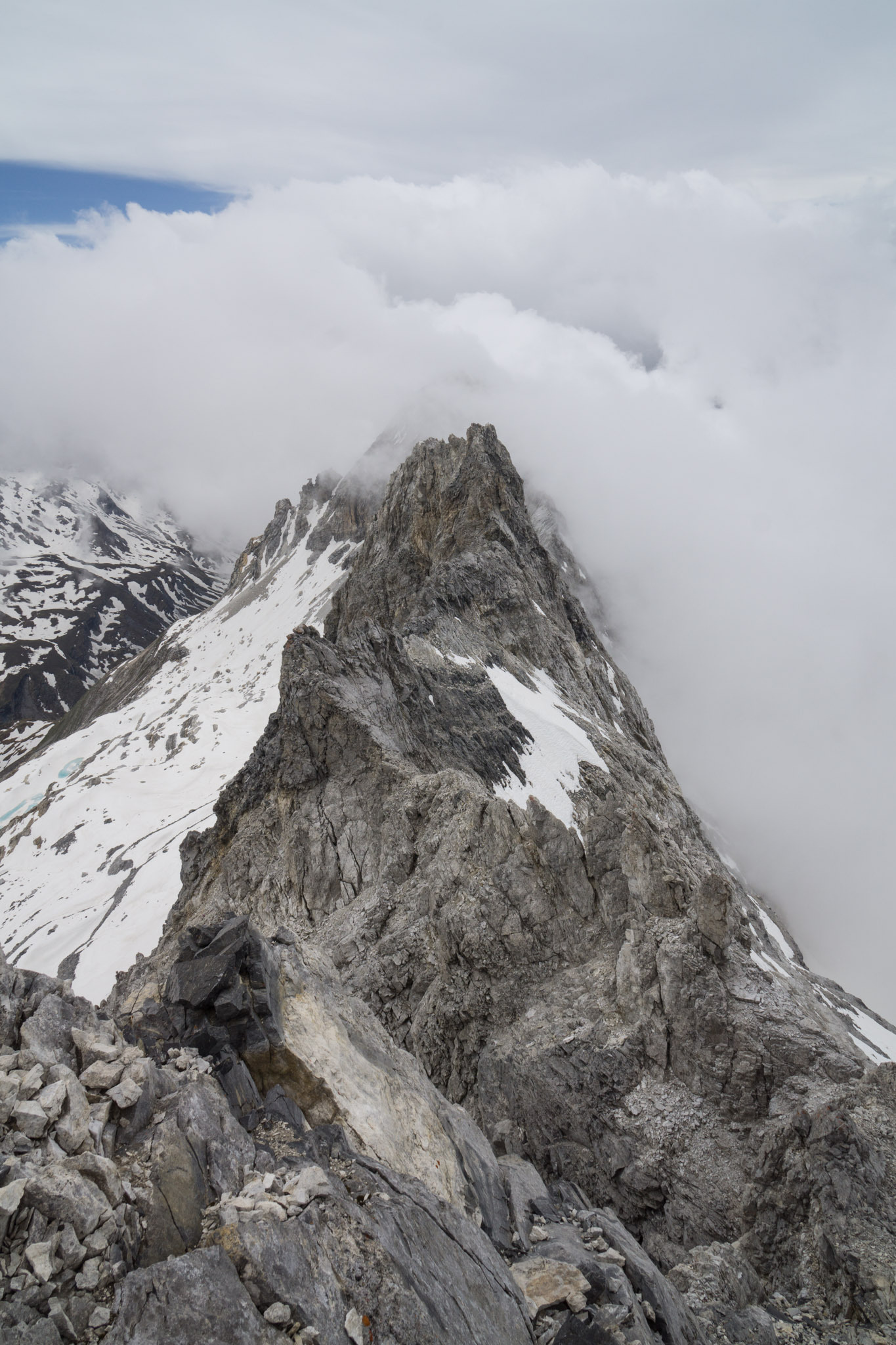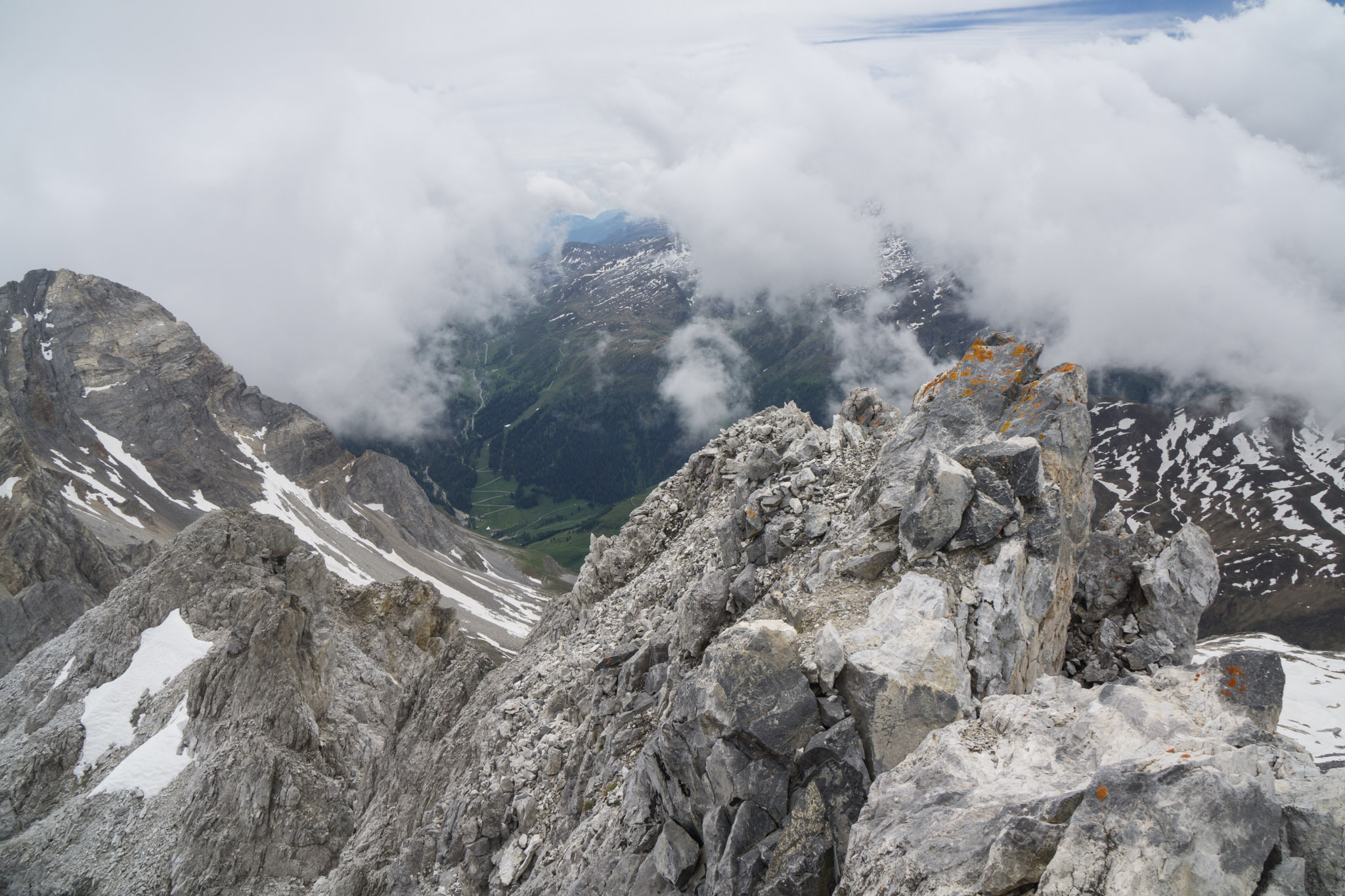 Leider hat es dank Wolken nicht so die tolle Aussicht. Bei gutem Wetter dürfte diese recht beeindruckend sein. Zumindest der blick auf den Westgrat ist eindrucksvoll, wenn auch wenig einladend.