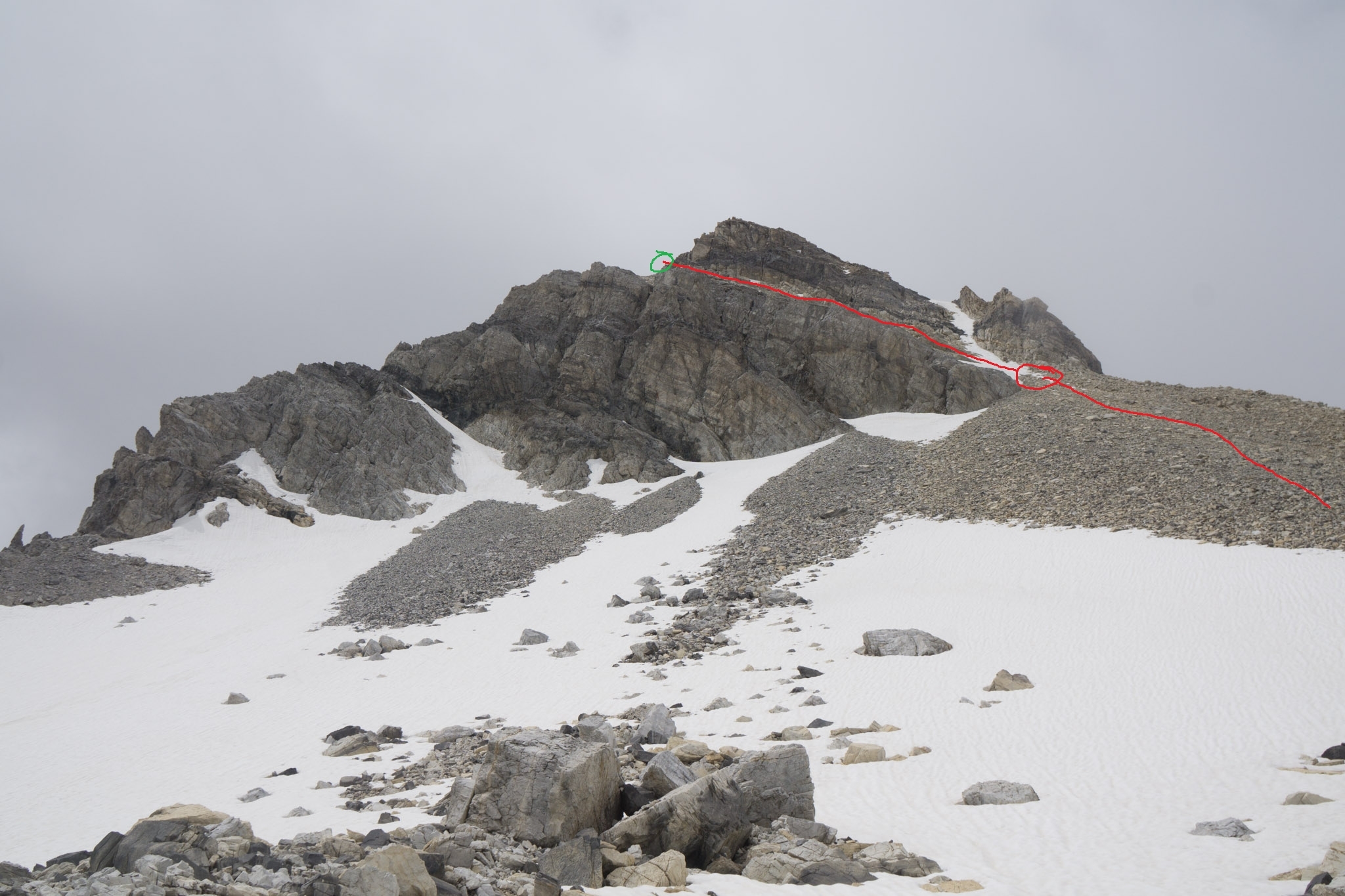 Hier mit eingezeichneter Route für den unteren Teil. Am oberen Ende geht es um den Felsen herum, man folgt einem horizontalen Band bis zu einer Rinne, die zum Grat hinauf führt, und von dort dann über den Grat zum Gipfel.