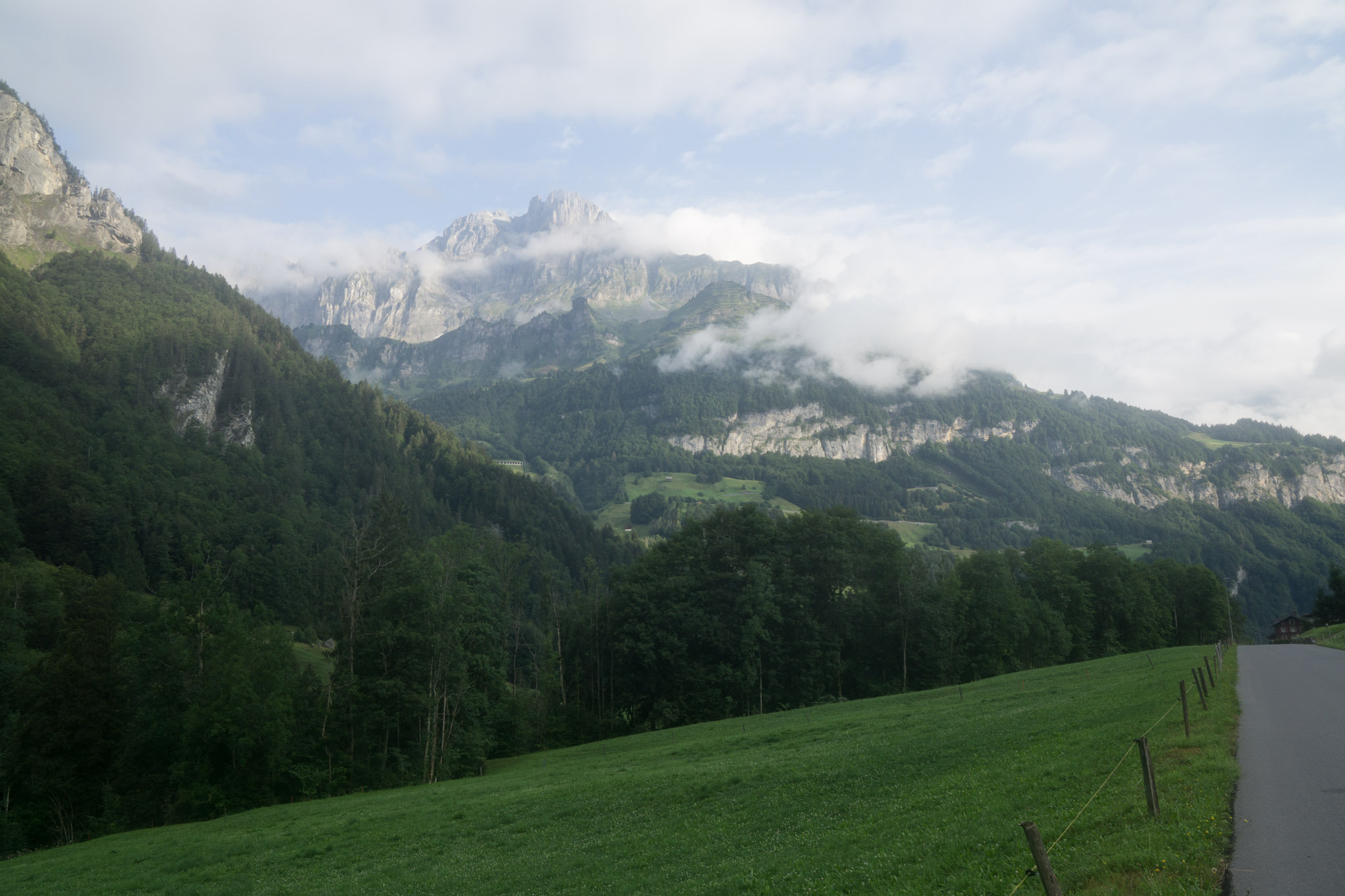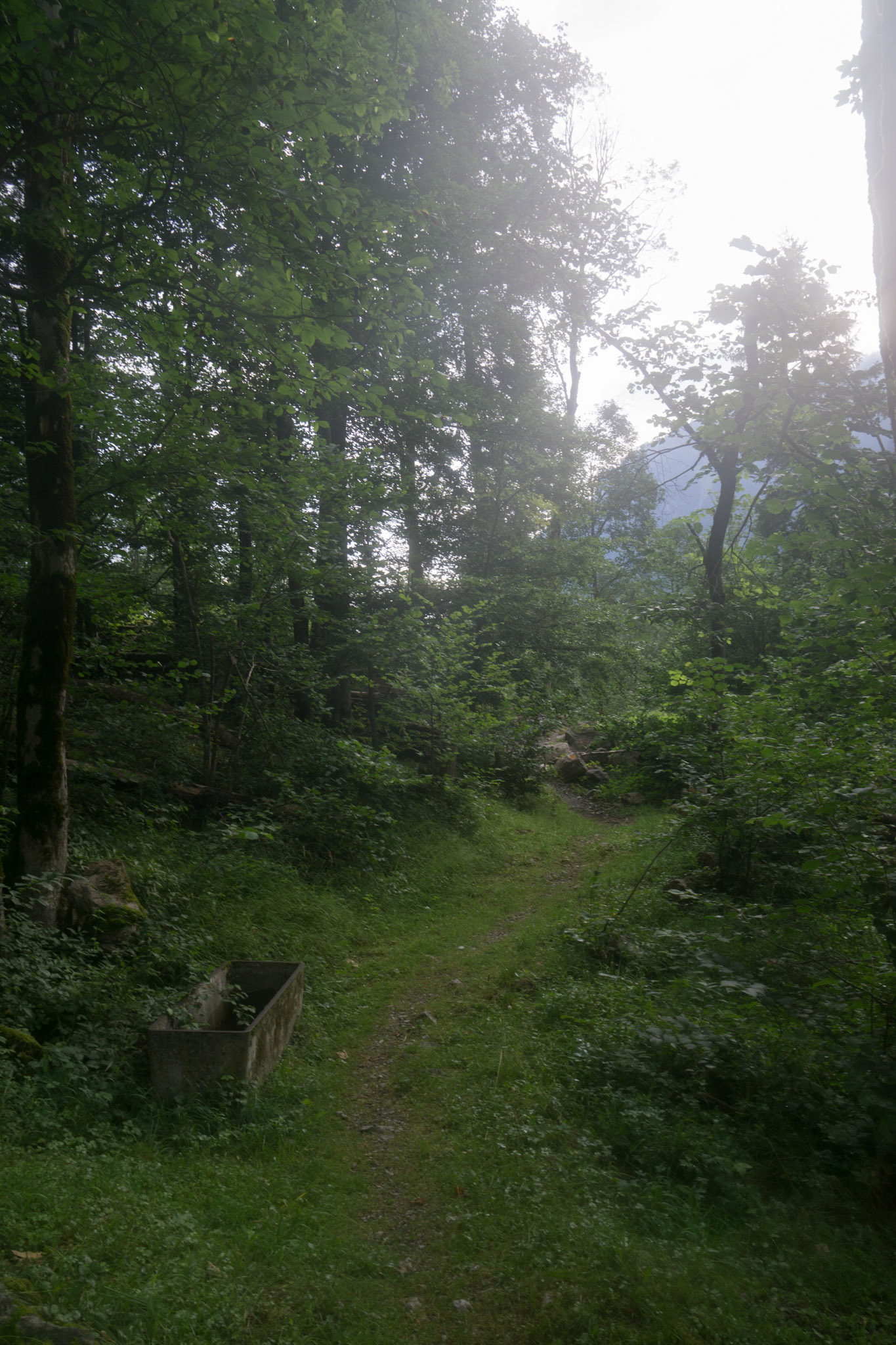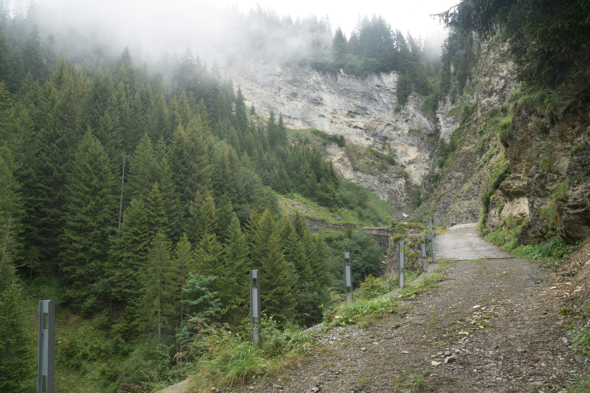 Um 8:25 Uhr geht mein IR nach Chur, und nach 2x Umsteigen lande ich in Pigniu auf 1300m (Panix, Kleinbus ab Ilanz, reservierungspflichtig), und verschwinde in Richtung Panixerpass. Unterwegs hat es geregnet, und hier ist alles ziemlich triefend. Und so stellt es sich als erster fehler heraus, nicht dem breiten Fahrweg über die Alp Ranasca zu gehen, sondern stattdessen den (unausgeschilderten) Weg über Zon. Der ist zwar hübsch, aber leider eben auch über längere Strecken nur ein Pfad, quer durch Wald und Wiesen mit hohem Gras. Als ich bei P1925 bei Spunda Melna den Fahrweg erreiche, ist alles unterhalb vom Knie klatschnass, und ich muss zweimal die Socken und Schuhe auswringen, bis der Füllstand unten halbwegs angenehme Werte angenommen hat. Trocken sind sie einen Tag später auch noch nicht.