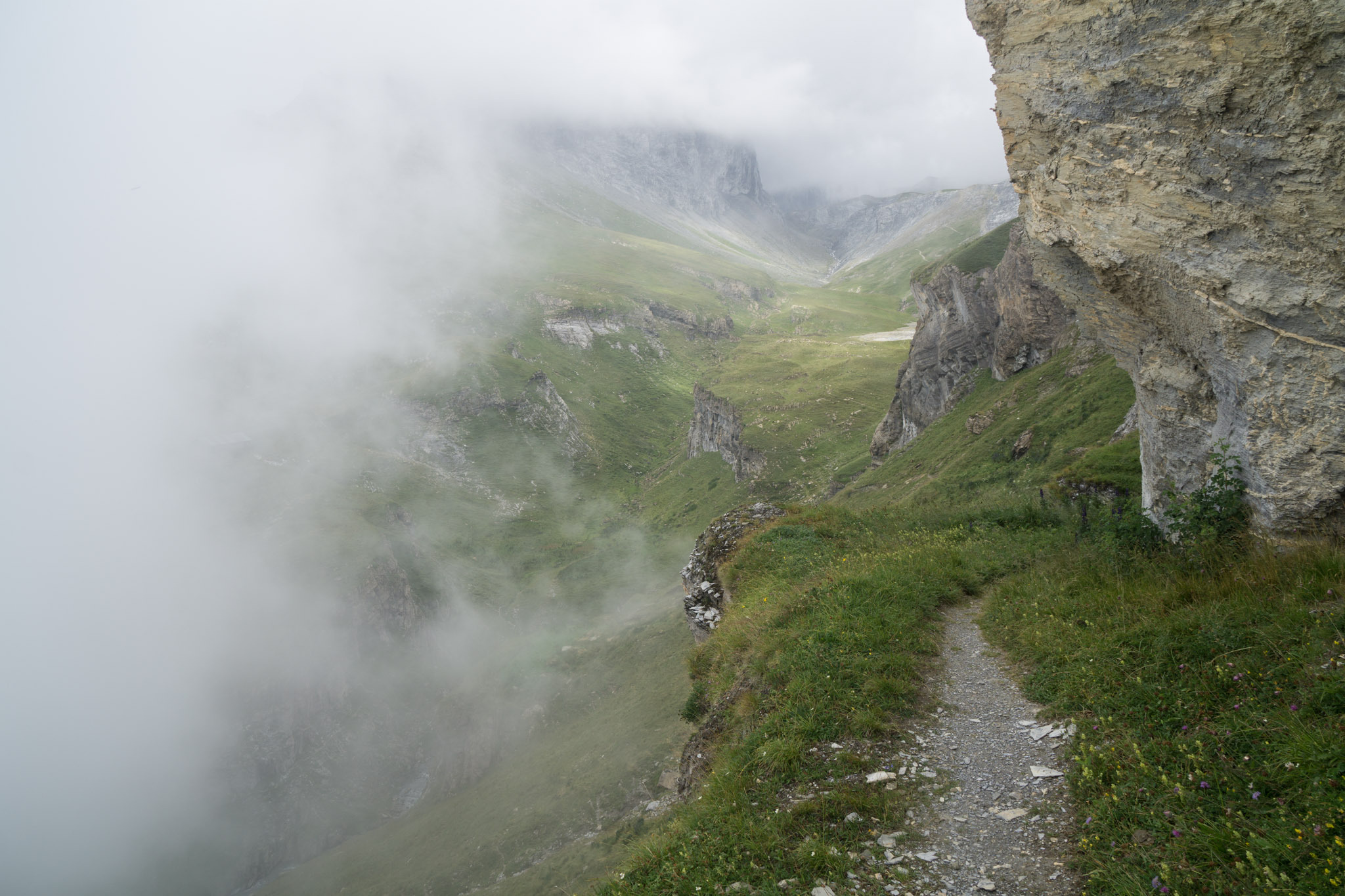 Auf 2000m endet der Fahrweg und es geht einen sehr hübschen Pad entlang einer Steilwand in das hochtal Alp Mer hinein. Hier muss ich eine längere Strecke vom Weg runter und quer durchs (nasse) Gras, da der Pfad sowie die Flaäche drumherum temporär eingezäunt ist, und eine von Herdenschutzhunden bewachte Schafherde dort herum hockt. Einen der hunde sehe ich auch tatsächlich, aber er zeigt kein Interesse an mir - ich bin also harmlos.