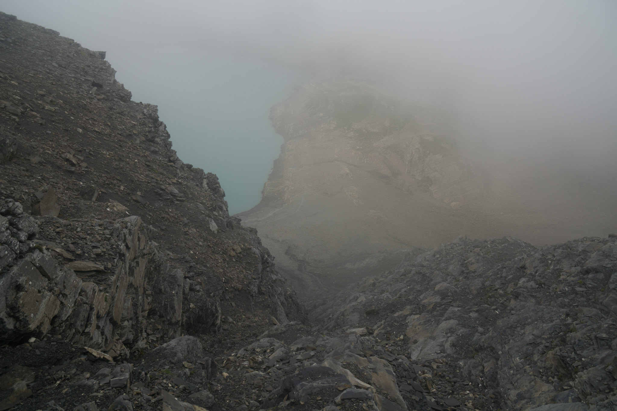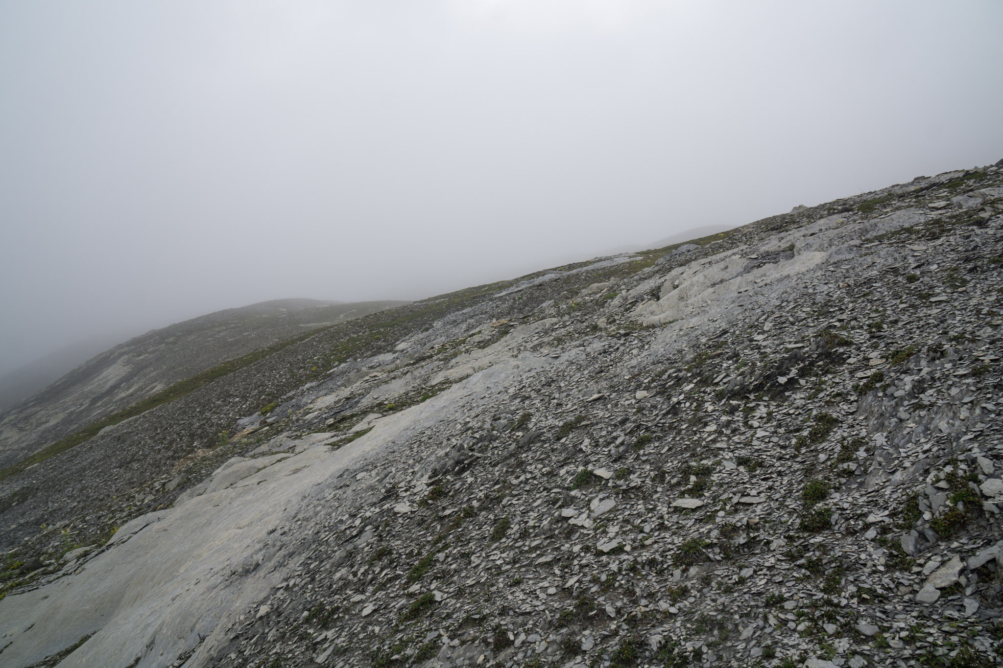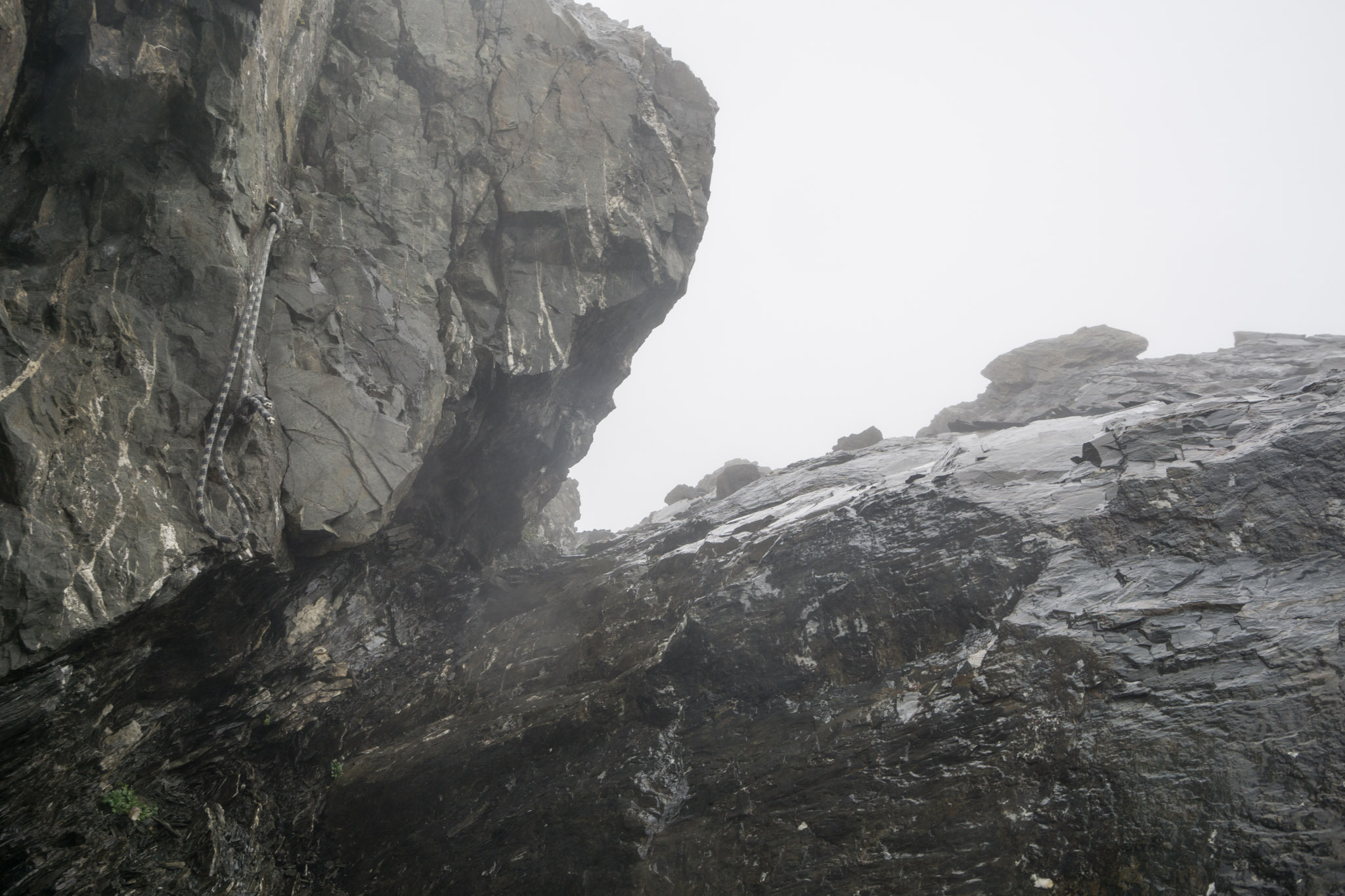 Von der Hütte aus zur Quelle auf etwa 2370m nordwestlich davon und dann weglos über P2468 zu P2596 geht erstaunlich gut. Danach hat es sogar einen Pfad und Steinmännchen, die aber zum Teil von Geröllawinen bzw. Schlamm weggewaschen sind. Irgendwann wird es tatsächlich steiler, und in einem etwa 40° steilen Abschnitt beschliesse ich, nach oben auszubrechen, anstelle weiter zu queren. 50 Hm und ein paar Steinlawinen später stehe ich östlich von P2645 auf dem flachen Grat bzw. Höhenrücken und auf etwa 2700m beim ersten kleinen Hindernis - einer etwa 3m hohen Verschneidung (II), oberhalb derer die erste Sicherungsstange angebracht ist.