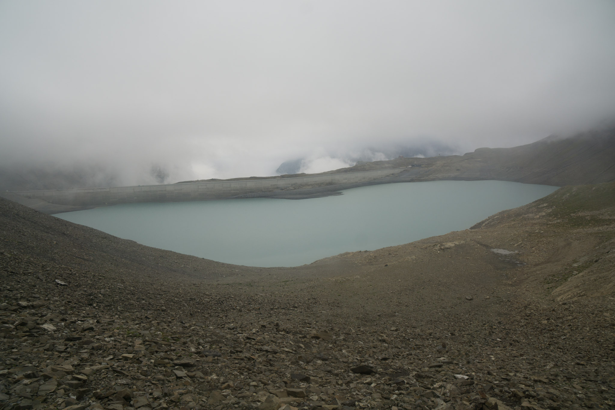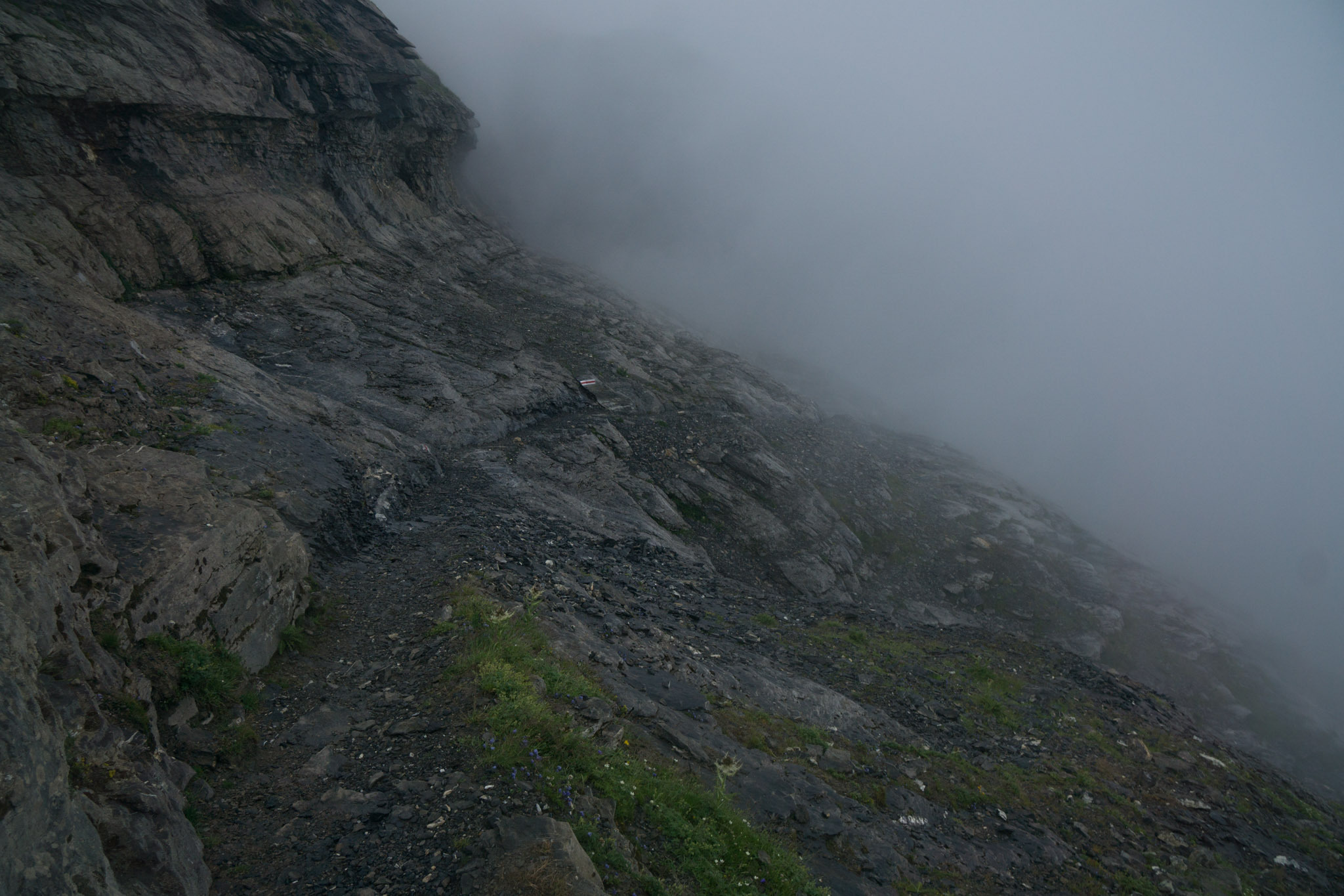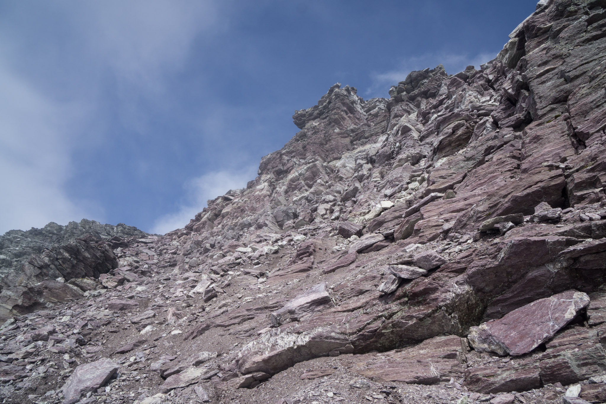 Von der Hütte aus zur Quelle auf etwa 2370m nordwestlich davon und dann weglos über P2468 zu P2596 geht erstaunlich gut. Danach hat es sogar einen Pfad und Steinmännchen, die aber zum Teil von Geröllawinen bzw. Schlamm weggewaschen sind. Irgendwann wird es tatsächlich steiler, und in einem etwa 40° steilen Abschnitt beschliesse ich, nach oben auszubrechen, anstelle weiter zu queren. 50 Hm und ein paar Steinlawinen später stehe ich östlich von P2645 auf dem flachen Grat bzw. Höhenrücken und auf etwa 2700m beim ersten kleinen Hindernis - einer etwa 3m hohen Verschneidung (II), oberhalb derer die erste Sicherungsstange angebracht ist.