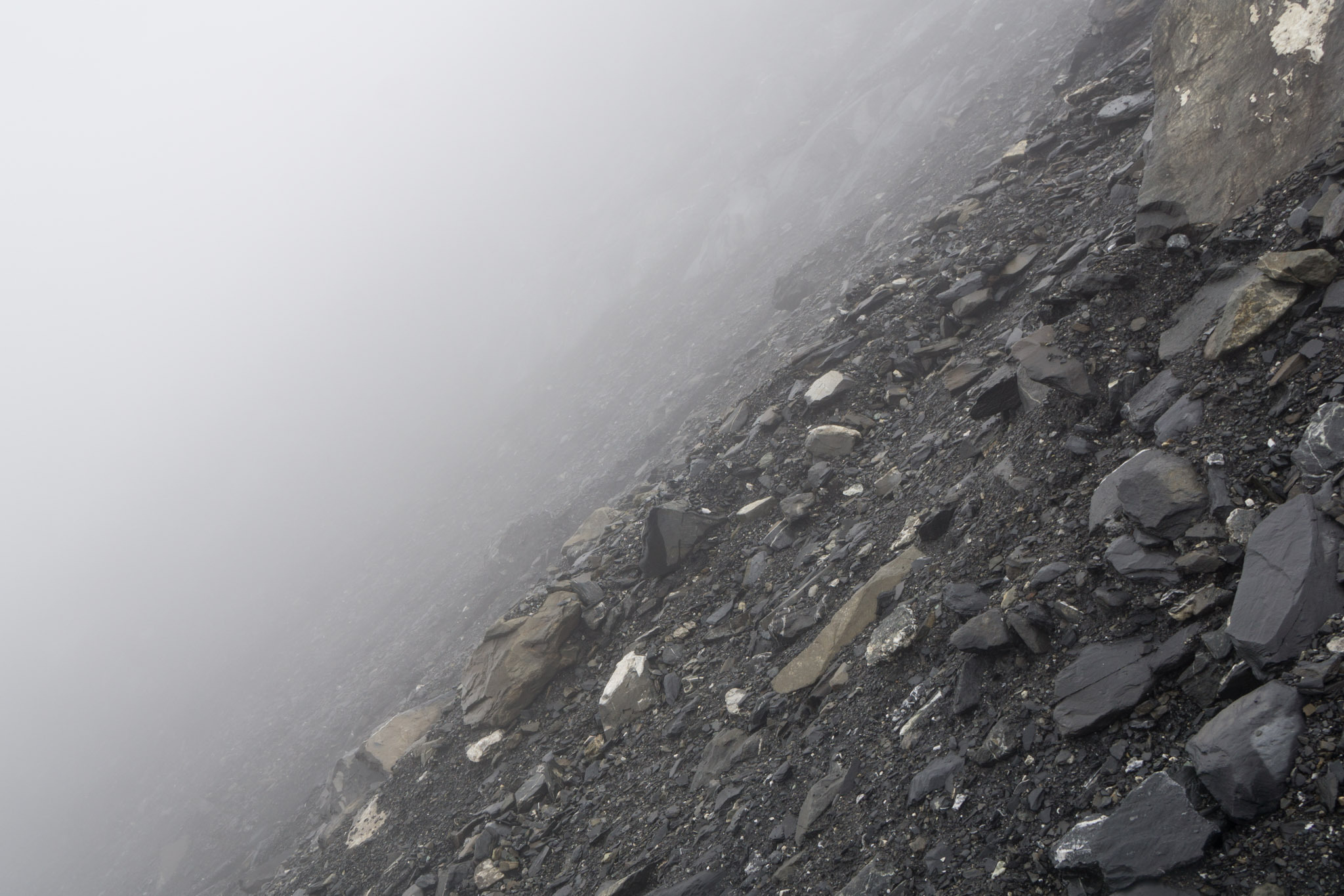 Steilschutt - sieht dank Linsenverzerrung flacher aus, als es war.