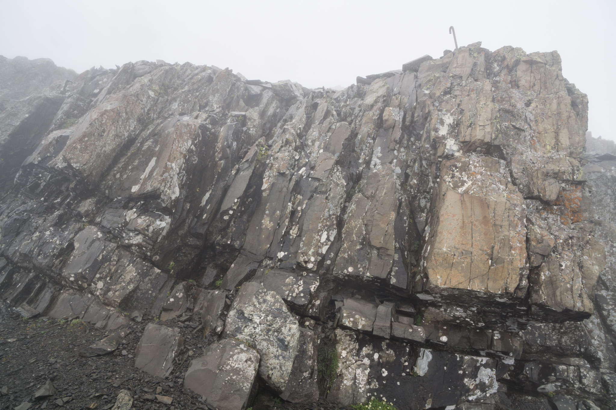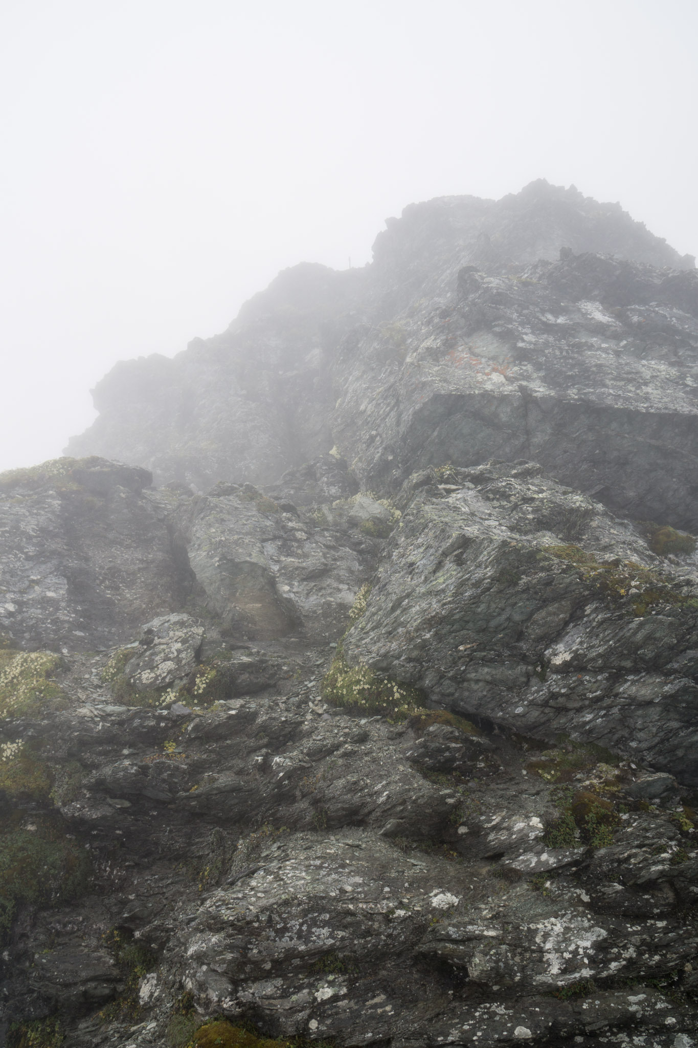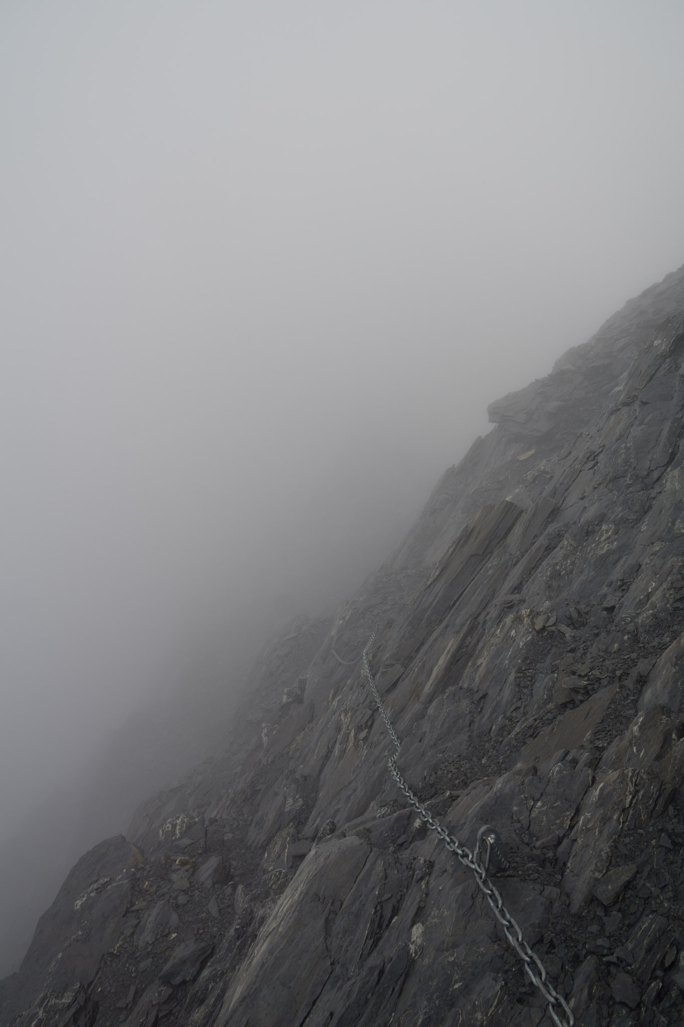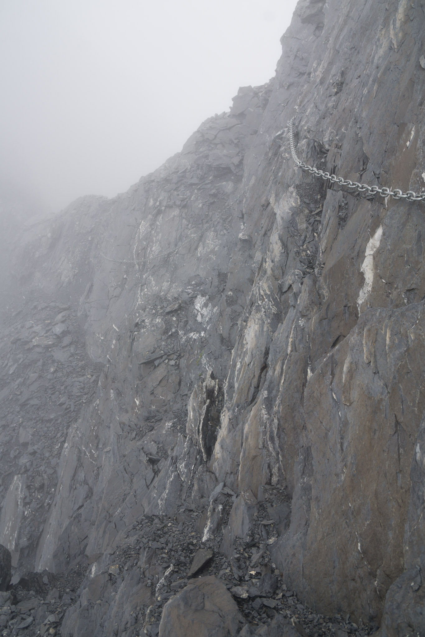 Danach geht es einige Höhenmeter weiter, und es folgt eine plattige Rinne an einem zweiten Aufschwung (II). Netterweise regnet es zwar nicht, aber der Wind treibt den Nebel bzw. die Wolken ständig über den Grat, und der so erzeugte Sprühregen macht alles nachhaltig nass. Das gilt leider auch für die ganzen Flechten, und so mancher Abschnitt, Tritt und Griff ist entsprechend rutschig.
