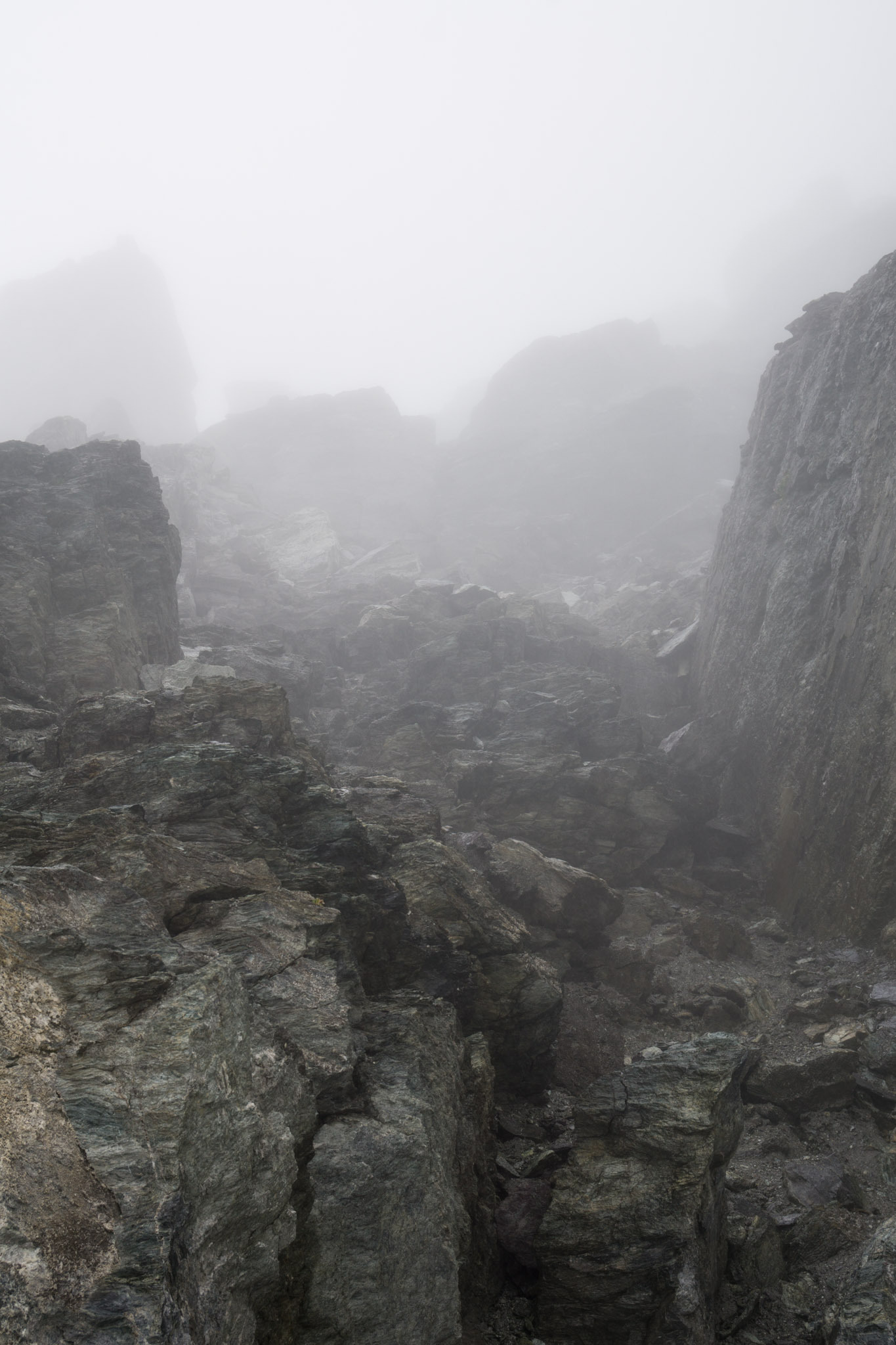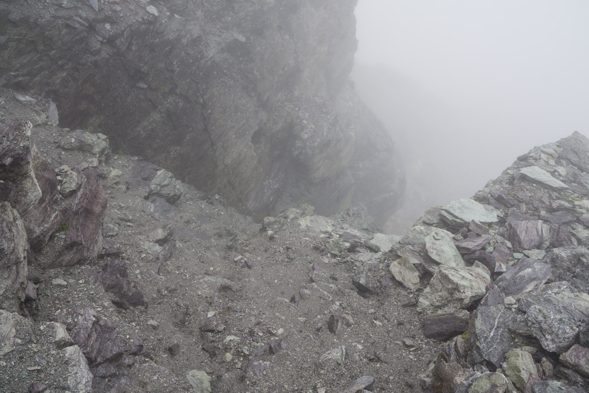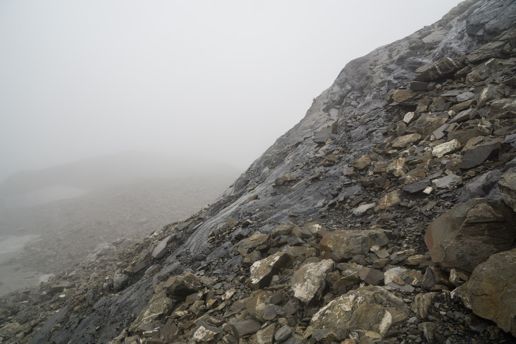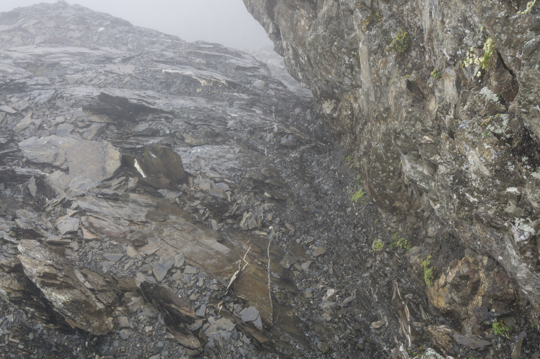 Es folgen in Abwechlsung danach mehrere Schutt- und Kletterabschnitte. An einem Aufschwung biege ich im Nebel falsch ab und gehe nach rechts in die Flanke, Nach etwa 10m Aufstieg (T5, eher T6) sitze ich etwa 3m unterhalb des Grats fest. Von hier könnte ich zwar die letzten Meter den kompakten Felsen hoch (geschätzt III), aber alles ist mit Flechten besetzt. Zu riskant, ein Ausrutscher würde einen Flug die Nordwand runter zur Folge haben. Also alles zurück, dabei sicherheitshalber noch einiges an Geröll im Pfad entsorgt, links um den Fels herum und Tataaaa - nächstes Hindernis. Dieses mal in Form einer etwa 3m hohen Platte mit einer einzigen Trittmulde im oberen Drittel und etwas an Miniriss am linken Rand. Hier müssen die Stöcke dann doch an den Rucksack, und etwas Ganzkörperkletterei (Mit Zunge auf Reibung, trocken II) bin ich oben und mir sicher: es geht nur nach oben weiter. Nasse Platte im Abstieg ist nicht so meins.